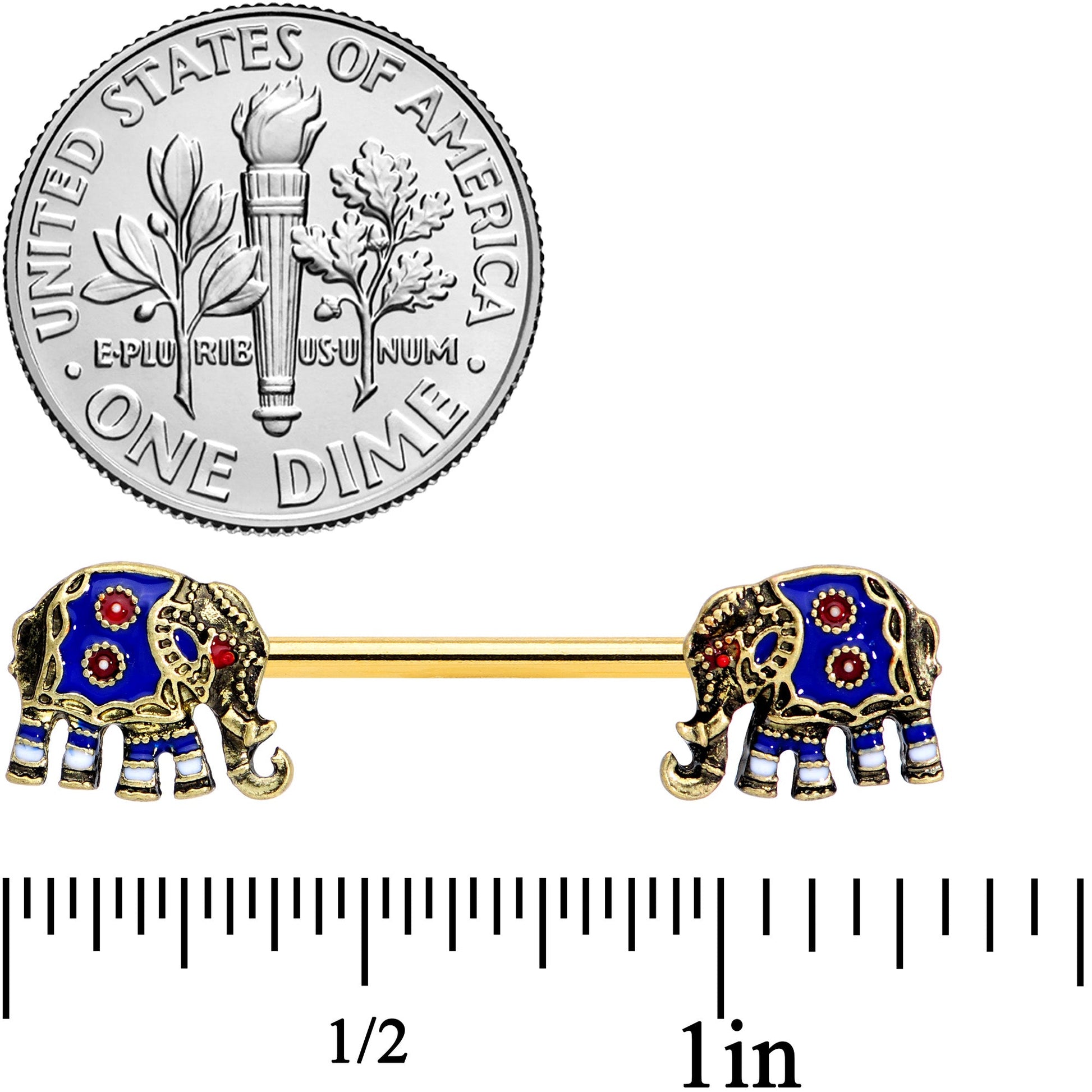 The elephants on this 14 gauge nipple jewelry are dressed to impress their fanciest finery! It's made with 14mm gold tone PVD over 316L surgical grade stainless steel straight barbells. The ends feature elephant charms heavily embellished with blue and red blankets across their backs and white bands around their legs. Add a lavishly ornate appearance to your nipple piercings with these elegantly embellished elephants! Sold as a set of two.Specifications