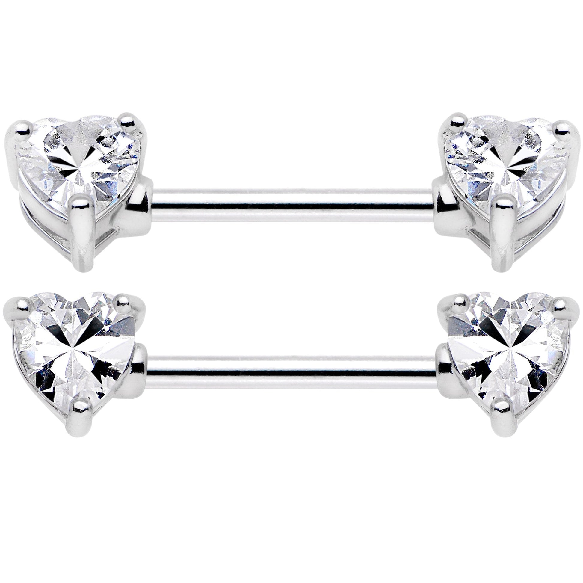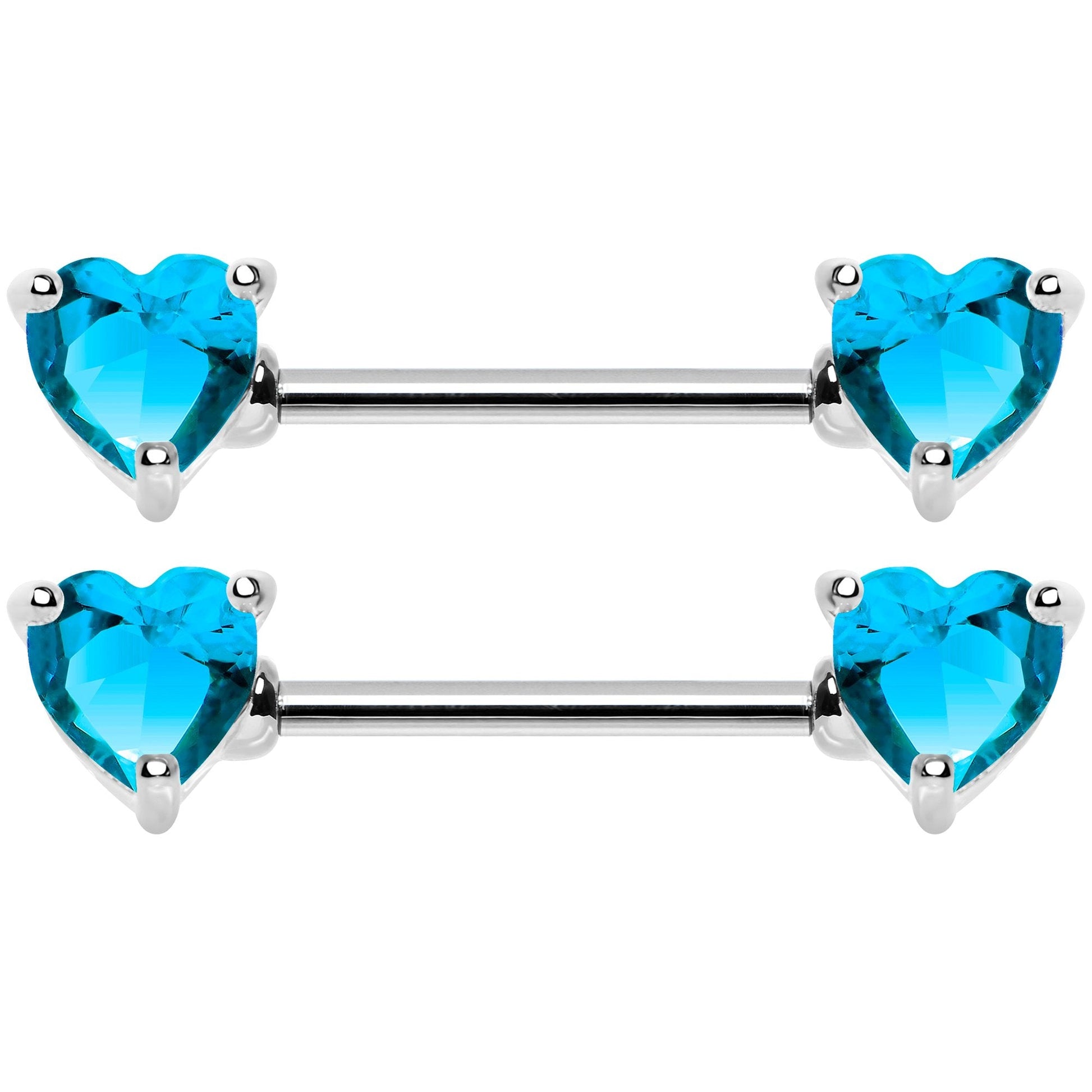 If you love options, then this is the piercing set for you! This nipple ring piercing pack comes with three different sets of Valentine's Day inspired colorful choices. The first is a durable 316L surgical grade stainless steel straight barbell with front facing, heart shaped pink gem ends. Next is a 316L surgical grade stainless steel straight barbell with front facing, heart shaped clear gem ends. The third is a straight barbell made with 316L surgical grade stainless steel and complete with front facing, heart shaped blue gem ends. All of the straight barbells are 14 gauge and measure 14mm in length. Sold as a set of six!