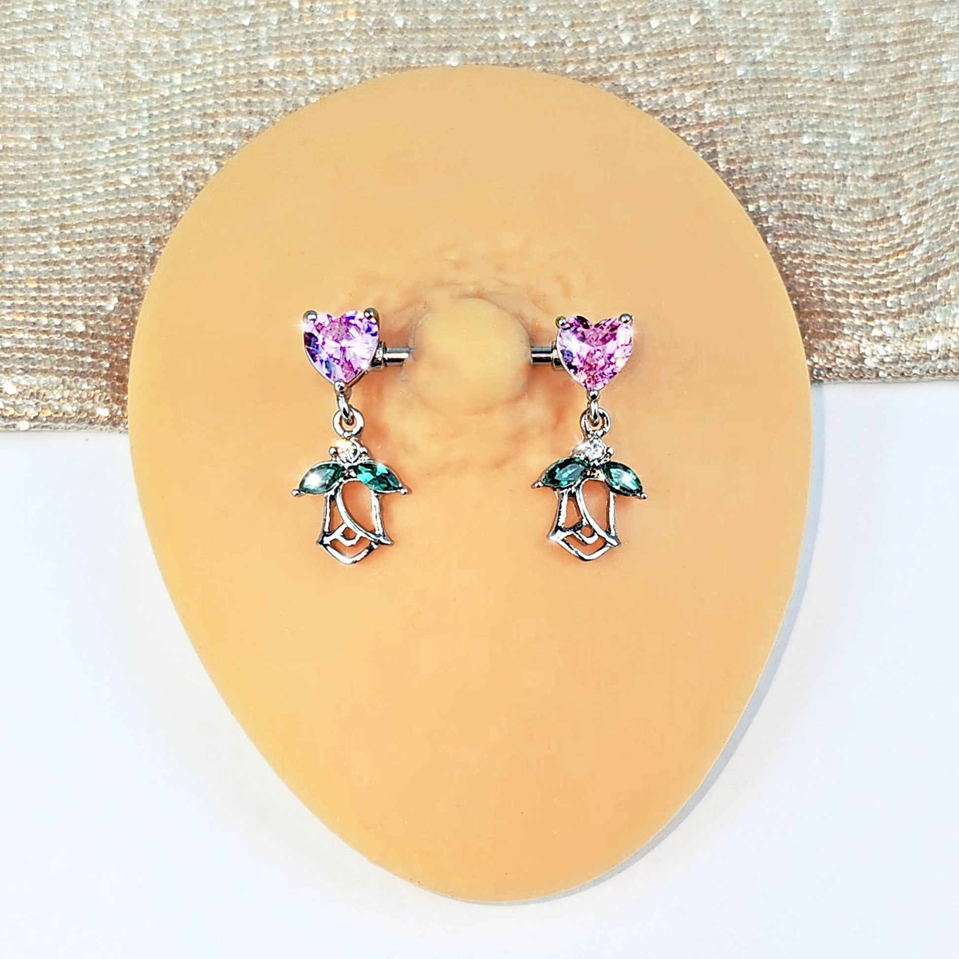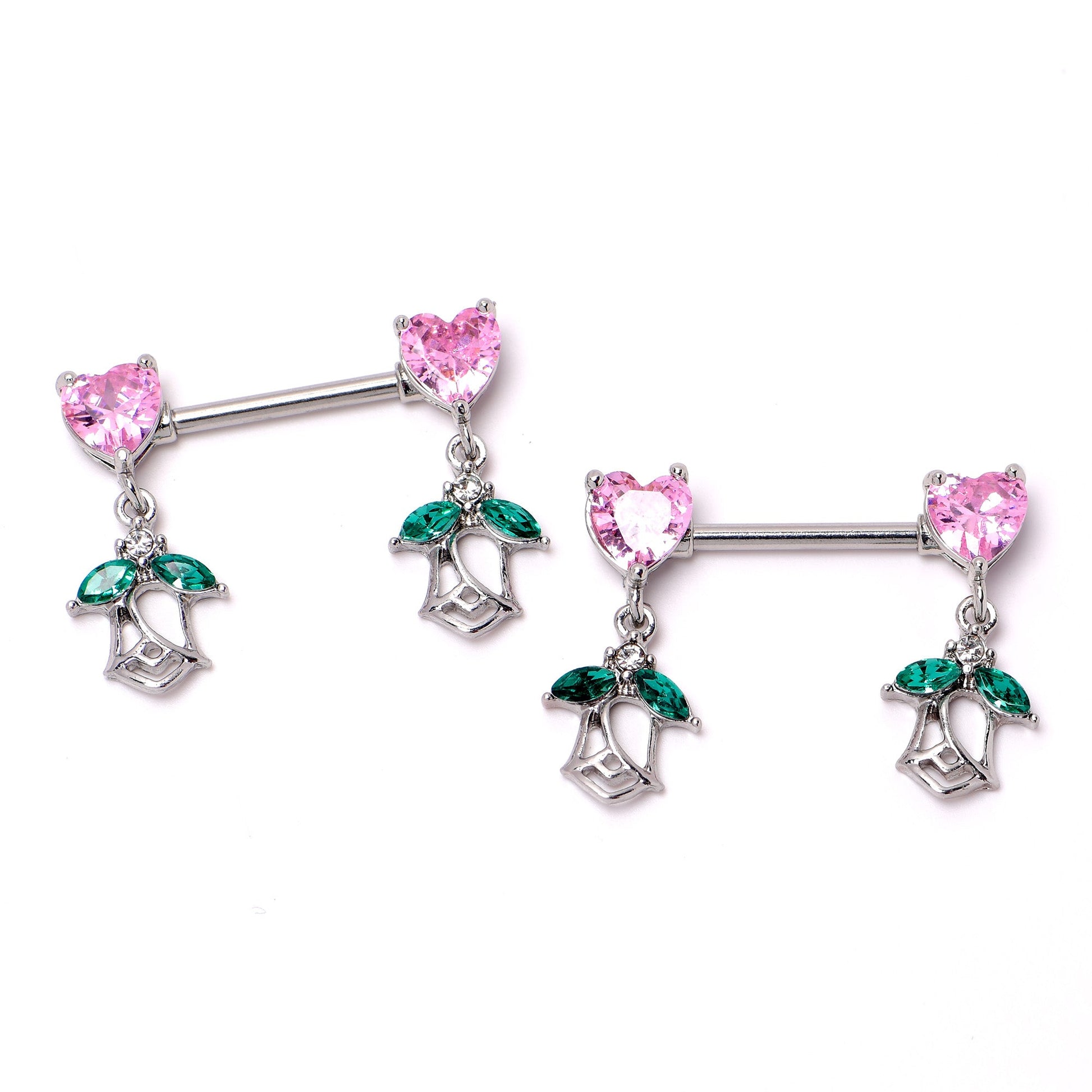 What could be more romantic than this 14 gauge nipple jewelry? It is made with 14mm durable 316L surgical grade stainless straight barbells. Each of the ends features a pink cubic zirconia gem in the shape of a heart. Dangling beneath each heart is a rose charm, with the leaves composed of green cubic zirconia gems and an airy, openwork design. Fall in love with these richly romantic nipple piercing rings. Sold as a set of two.Specifications