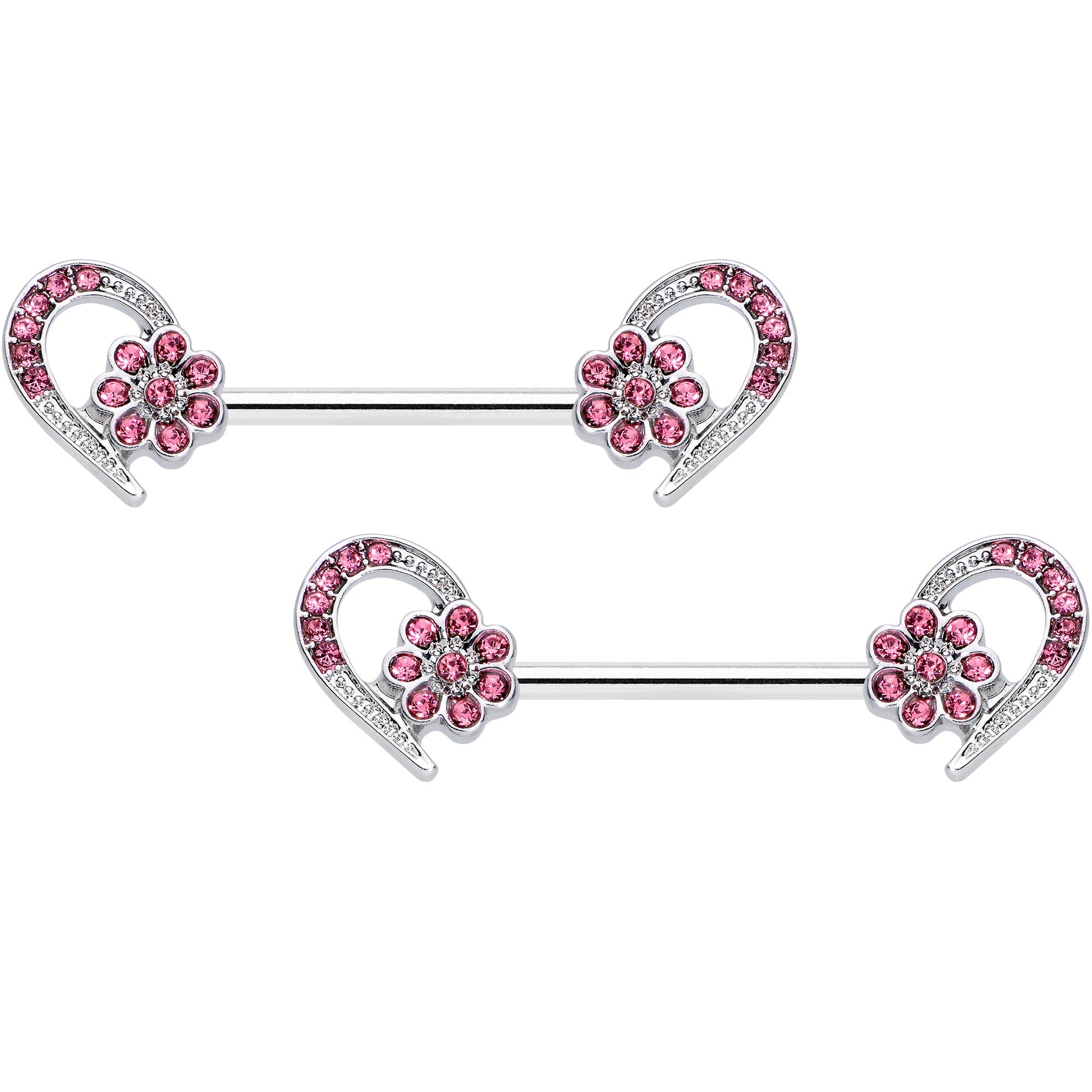 14G 9/16 Pink Gem Flower Heart Barbell Nipple Ring Set