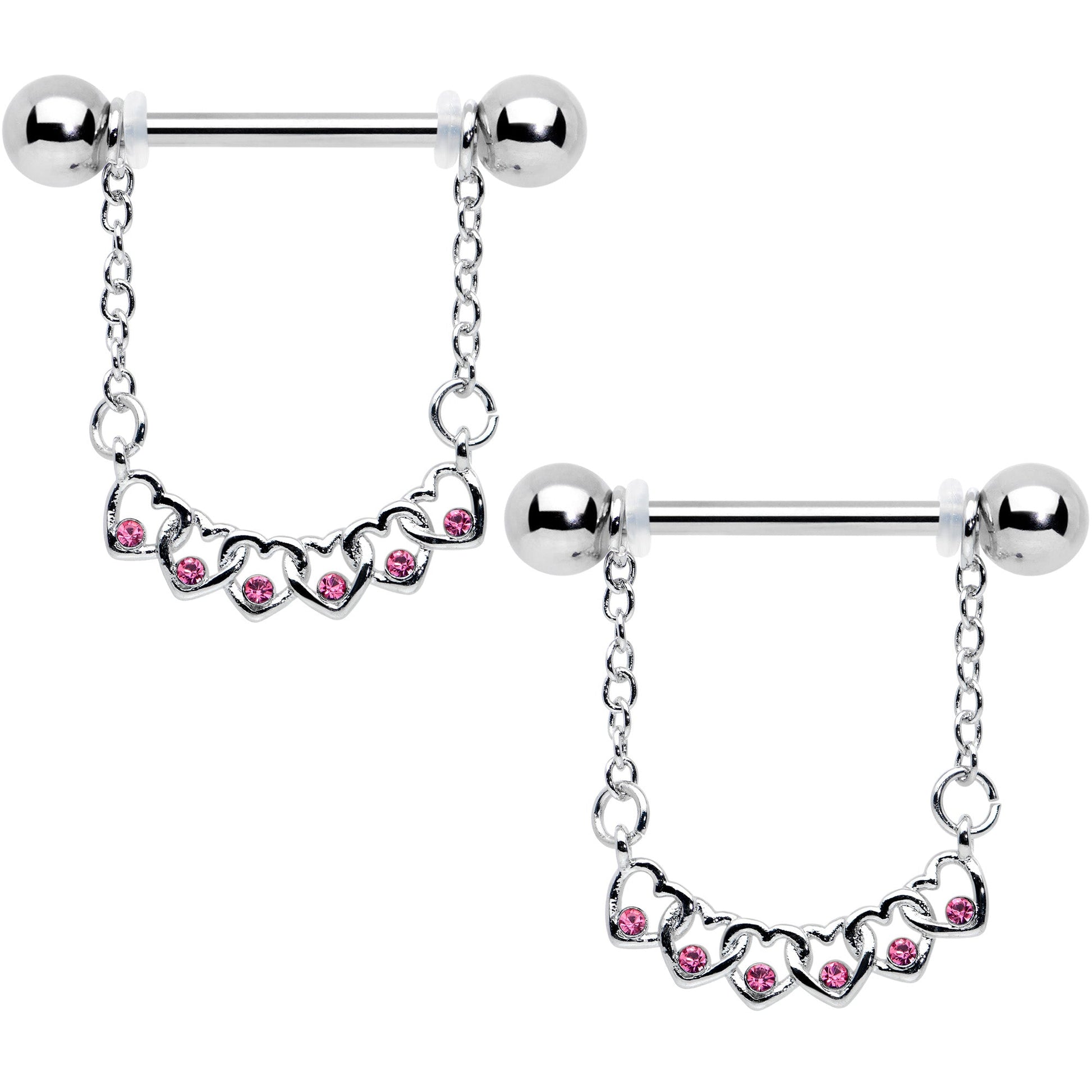 Love means the linking of hearts...like on this 14 gauge nipple jewelry! It's made with 14mm durable 316L surgical grade stainless steel straight barbells with 5mm ball ends. Each one has a pair of chains hanging from it, which supports a hearts charm. The hearts are linked together and each one is embellished with a small pink gem. Link up for love this Valentine's Day with these heart-themed nipple piercing rings! Sold as a set of two.Specifications