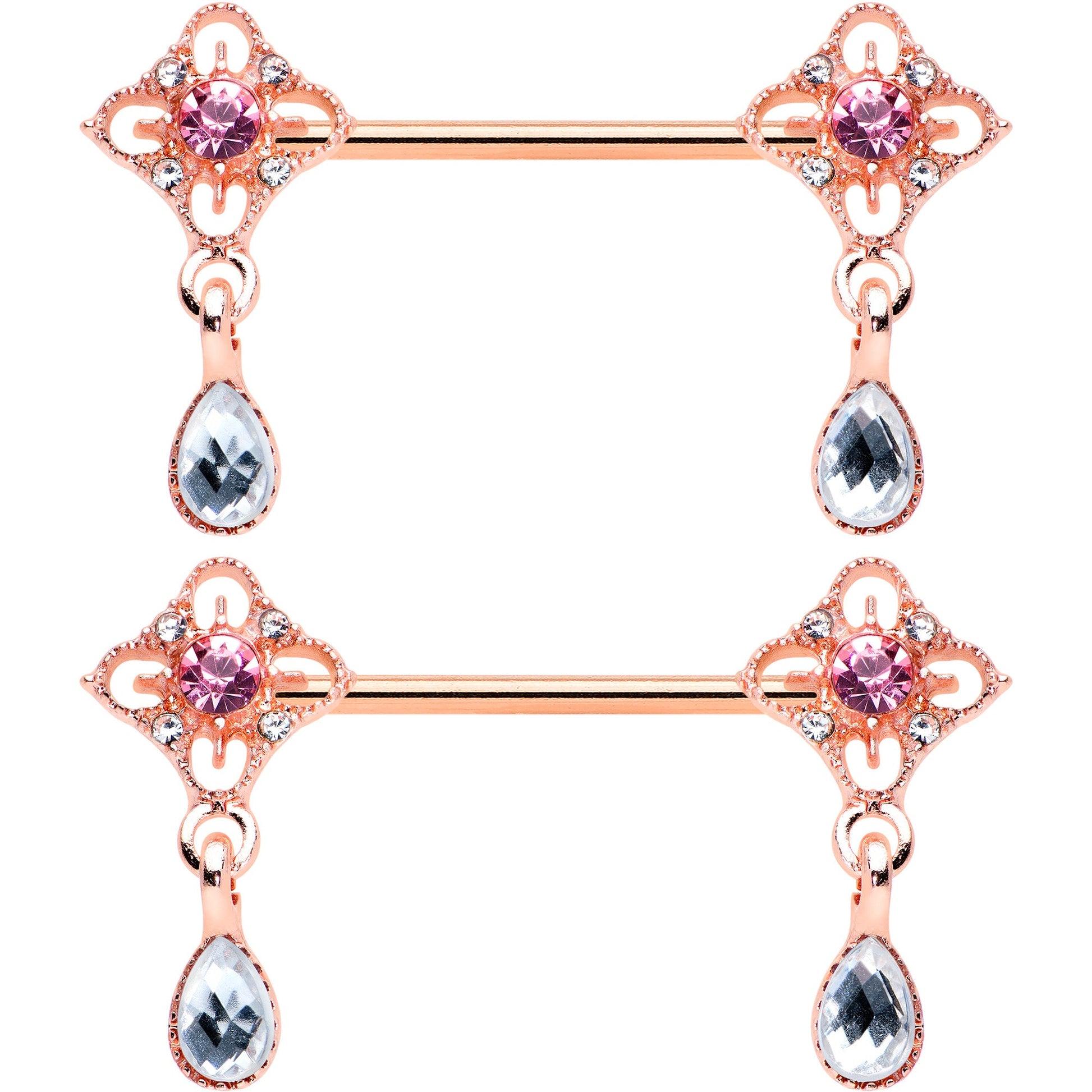 This 14 gauge nipple jewelry is absolutely brimming over with style! It's made with 14mm rose gold tone PVD over 316L surgical grade stainless steel straight barbells. Each of the ends features a rhombus charm. The rhombuses are embellished with clear gems at the corners, as well as a large purple gem at the centers. They also feature textured detailing and large grey gem dangles. You'll have more style than you'll know what to do with when you're rocking these regal, rhombus nipple piercing rings! Sold as a set of two.Specifications
