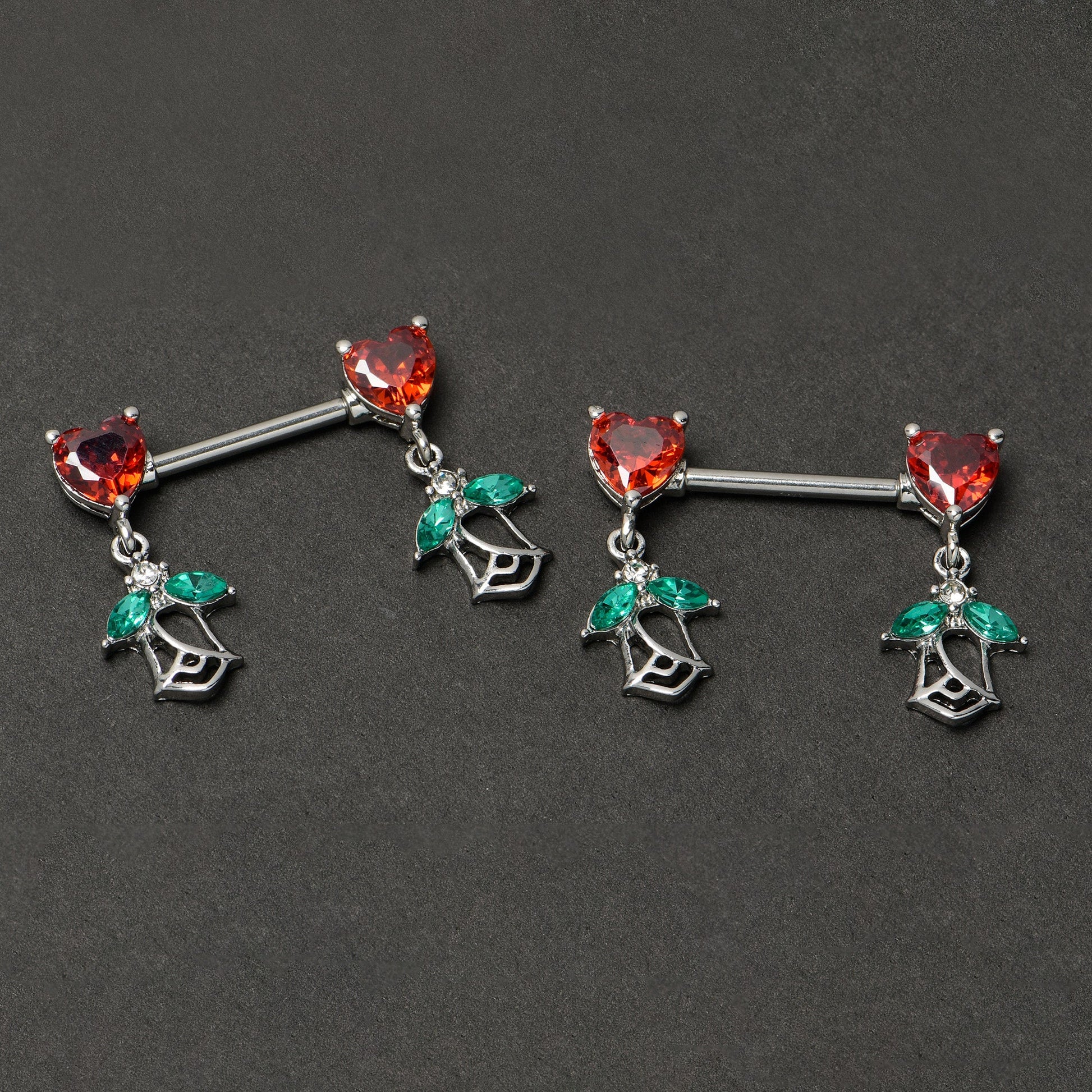 14G 9/16 Red CZ Gem Hearts And Roses Dangle Nipple Ring Set