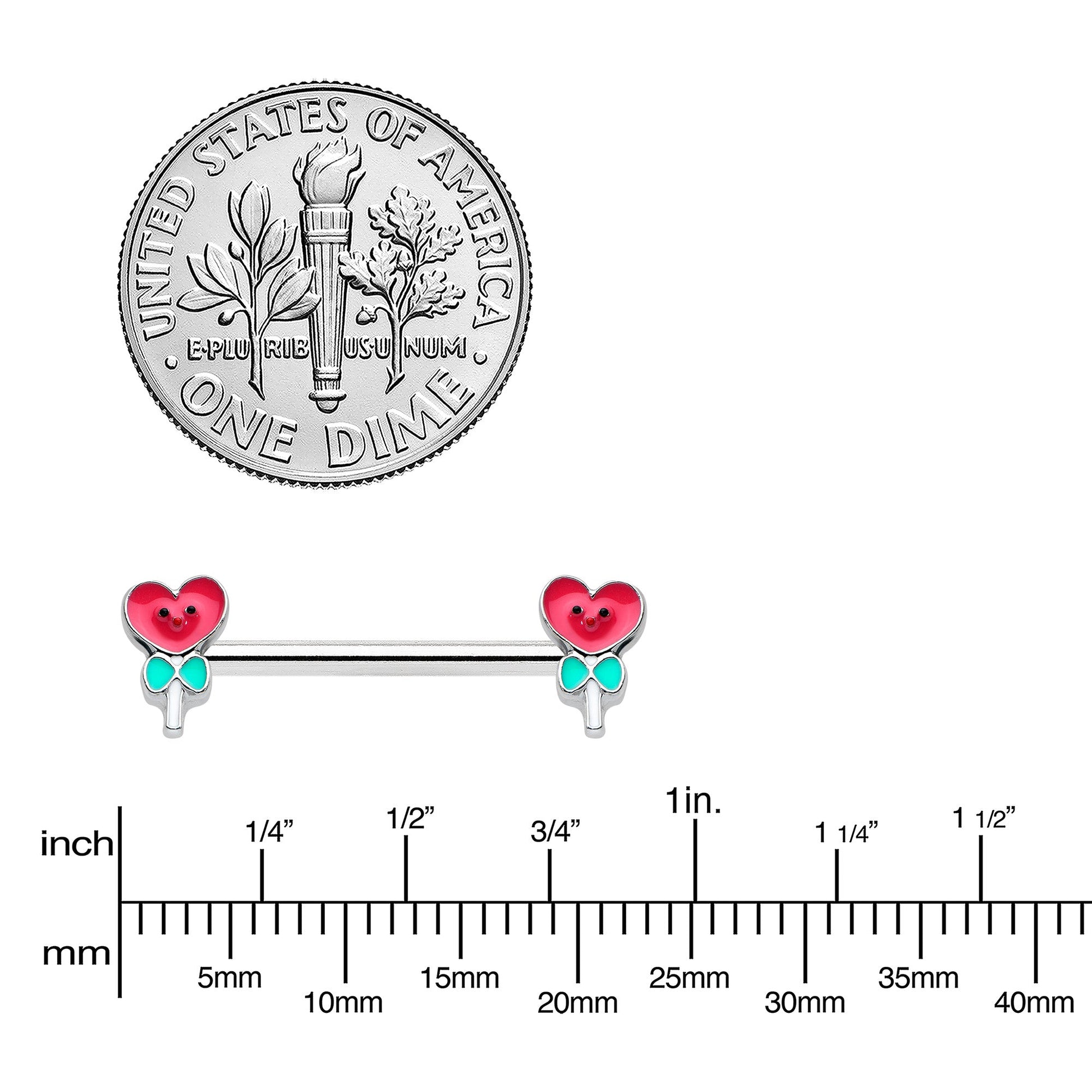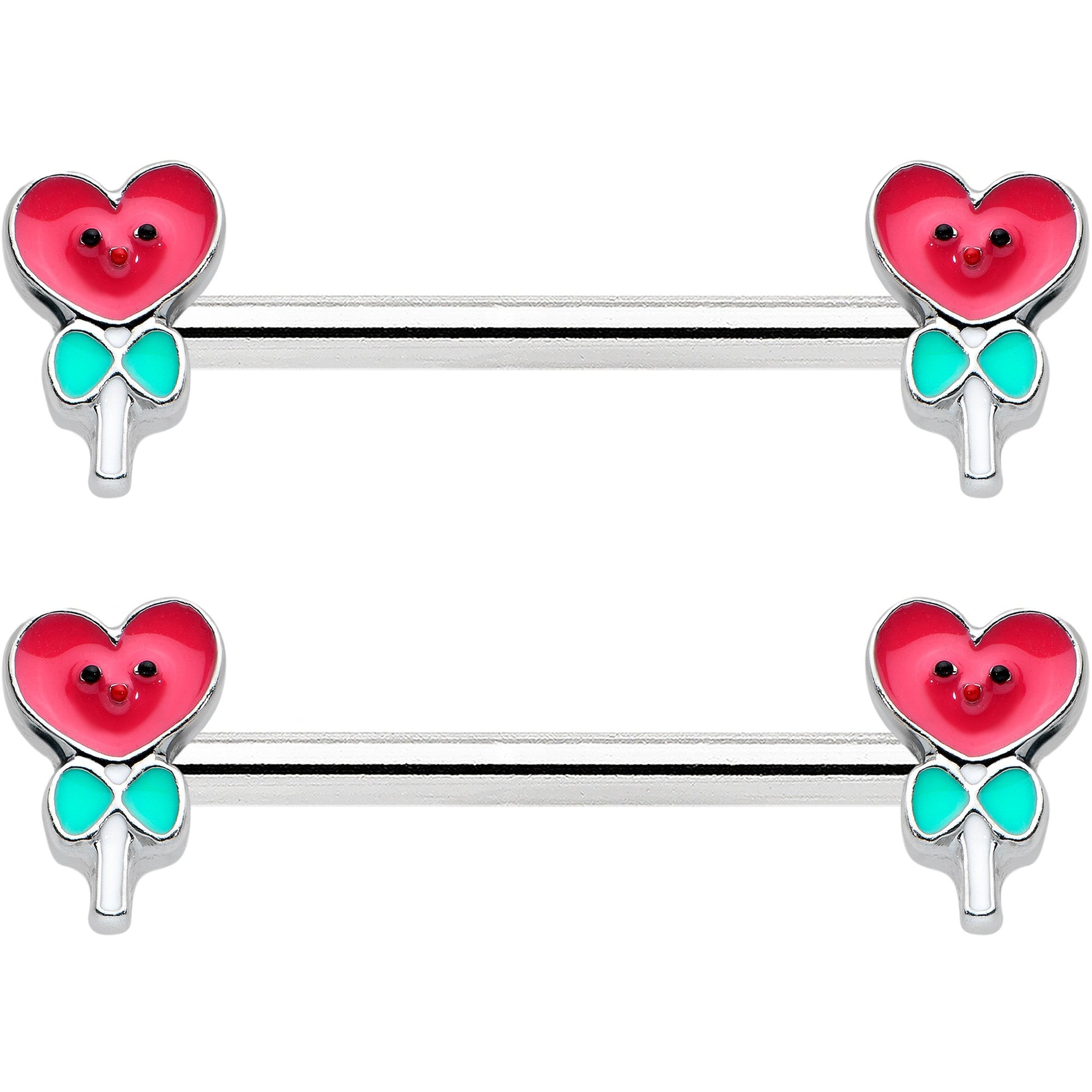 What could be sweeter than the loving lollies on this 14 gauge nipple jewelry? It's made with 14mm durable 316L surgical grade stainless steel straight barbells. Each of the ends features a lollipop charm, with the candy portion composed of a heart and wearing a cheery face. They're further embellished with green bows at the top of the white-inlaid sticks. You can't help but fall in love with with these sweet, candy-themed nipple piercing rings! Sold as a set of two.Specifications