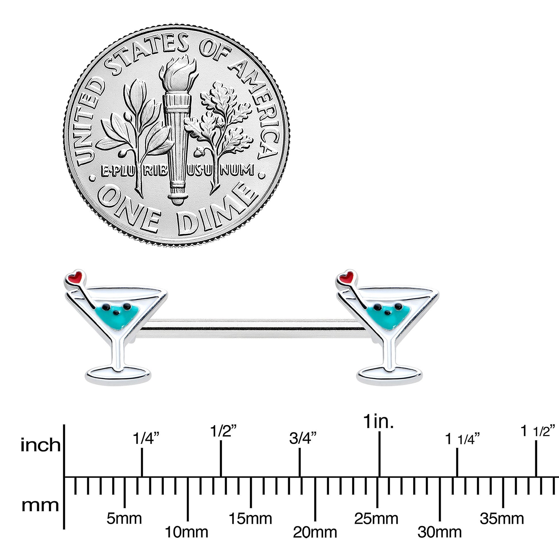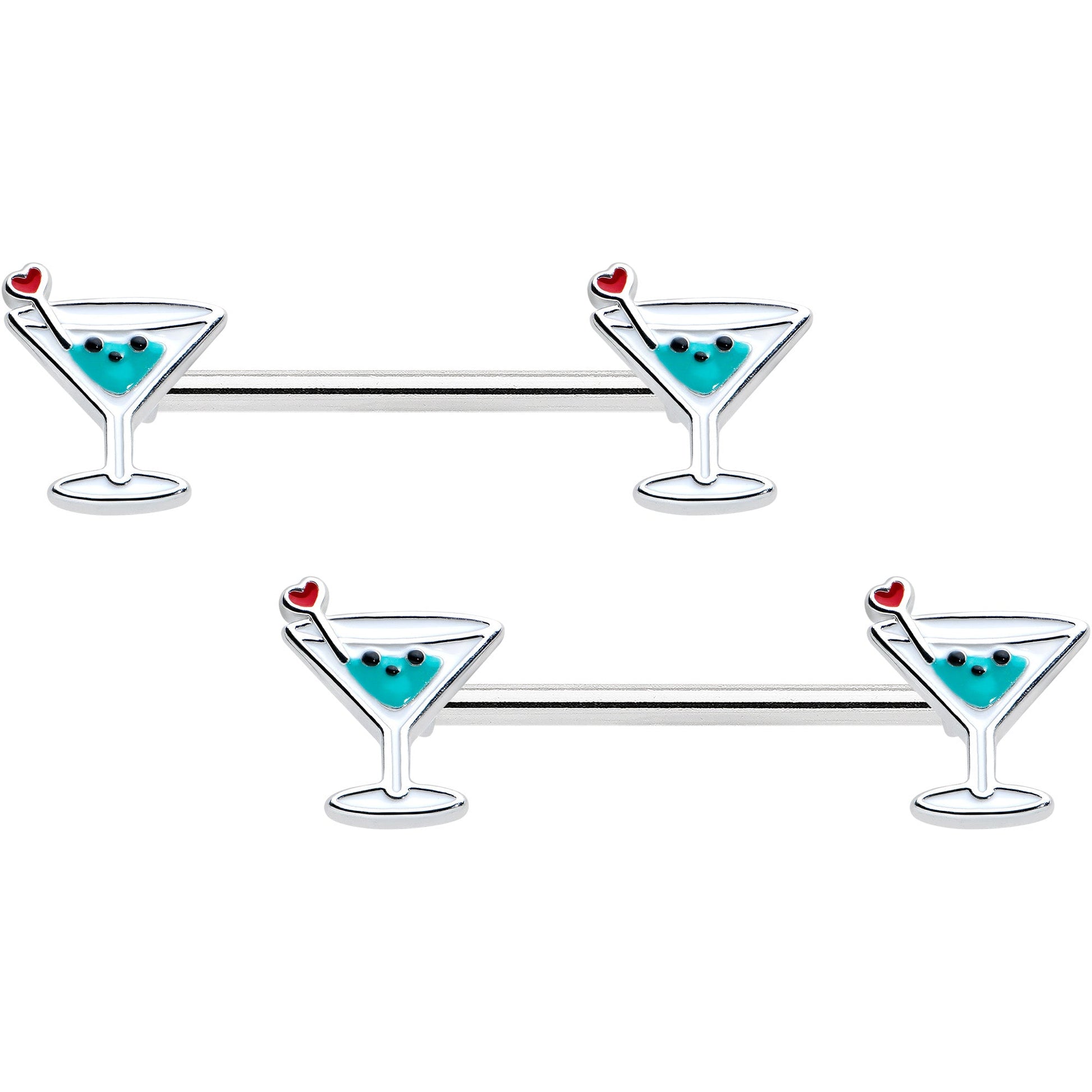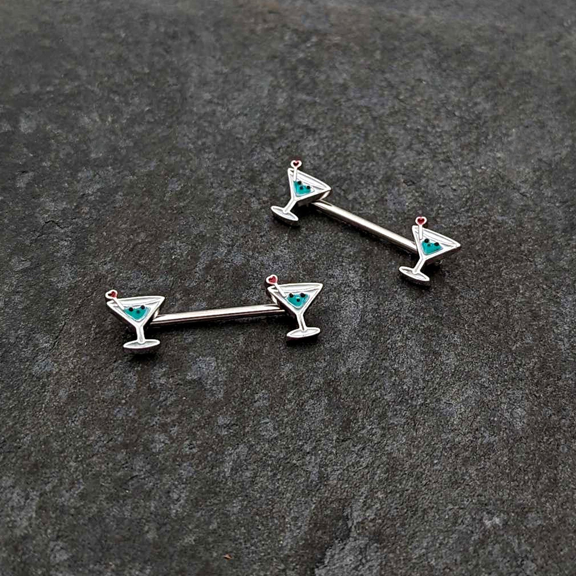 Bottoms up for style, with this 14 gauge nipple jewelry! It's made with 14mm durable 316L surgical grade stainless steel straight barbells. Each of the ends features a martini glass charm, with blue embellishment and a heart-ended swizzle stick. They also features faces on the glasses for added sweet style. Drink in the compliments when you're rocking these cocktail-themed nipple piercing rings! Sold as a set of two.Specifications