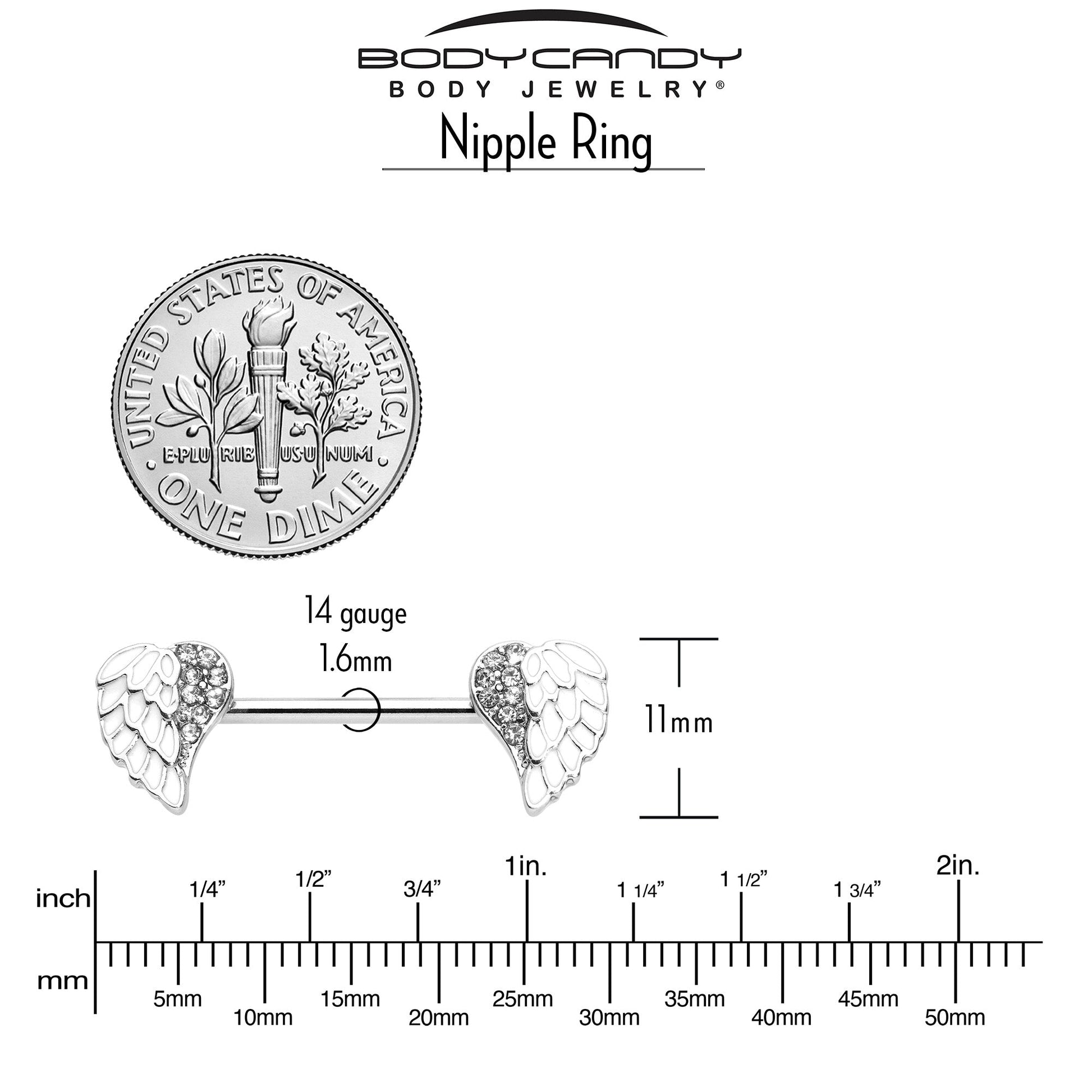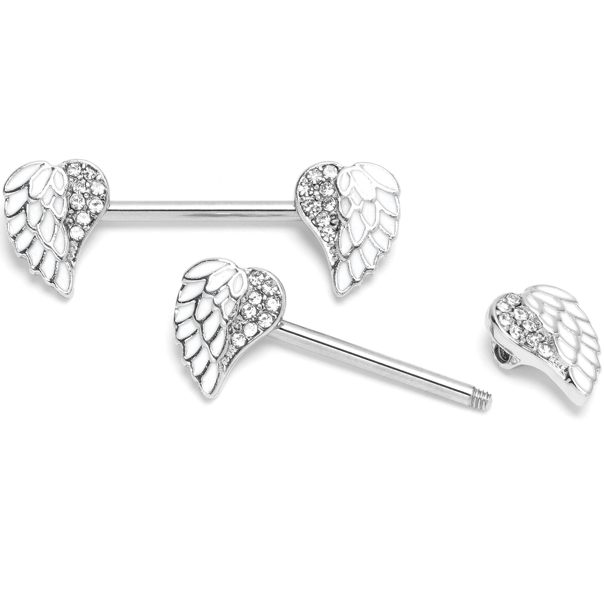 Give yourself a heavenly new look with this 14 gauge nipple jewelry. It's made with 14mm durable 316L surgical grade stainless steel straight barbells. Each of the ends features a heart shaped charm featuring an angel's wings, with one side paved with clear gems. The other sides feature white inlay and simply styled feather details. Let your look and your spirit soar with these stylish and spiritual nipple piercing rings. Sold as a set of two.Specifications