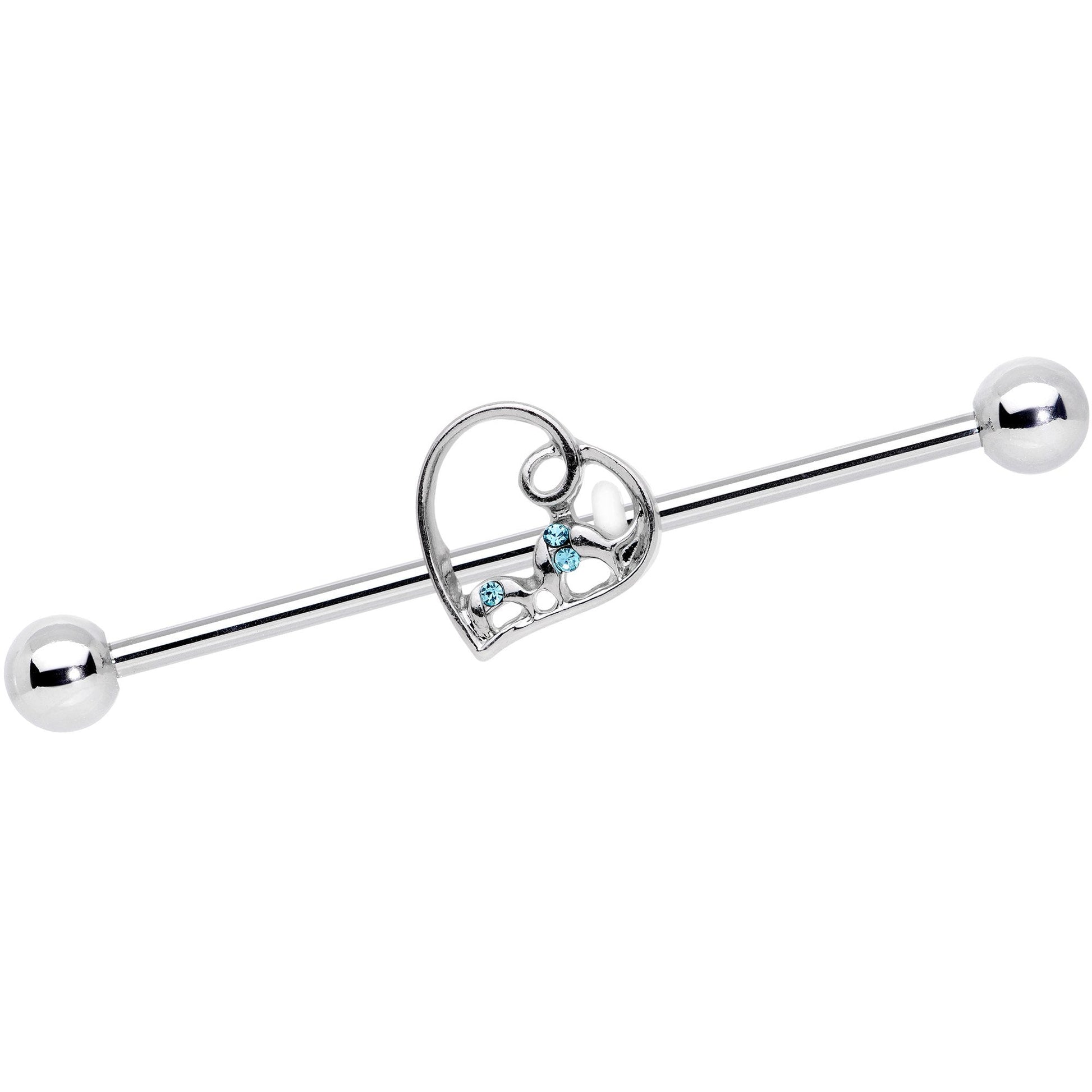 Feel love's keen sting – minus the sting! If Valentine's Day is your favorite holiday then you will love this 14 gauge barbell earring. Made with a 1 1/2” durable 316L surgical grade stainless steel straight barbell, this double helix earring features a moveable framework heart charm set with aqua gems for loveable beauty.Specifications