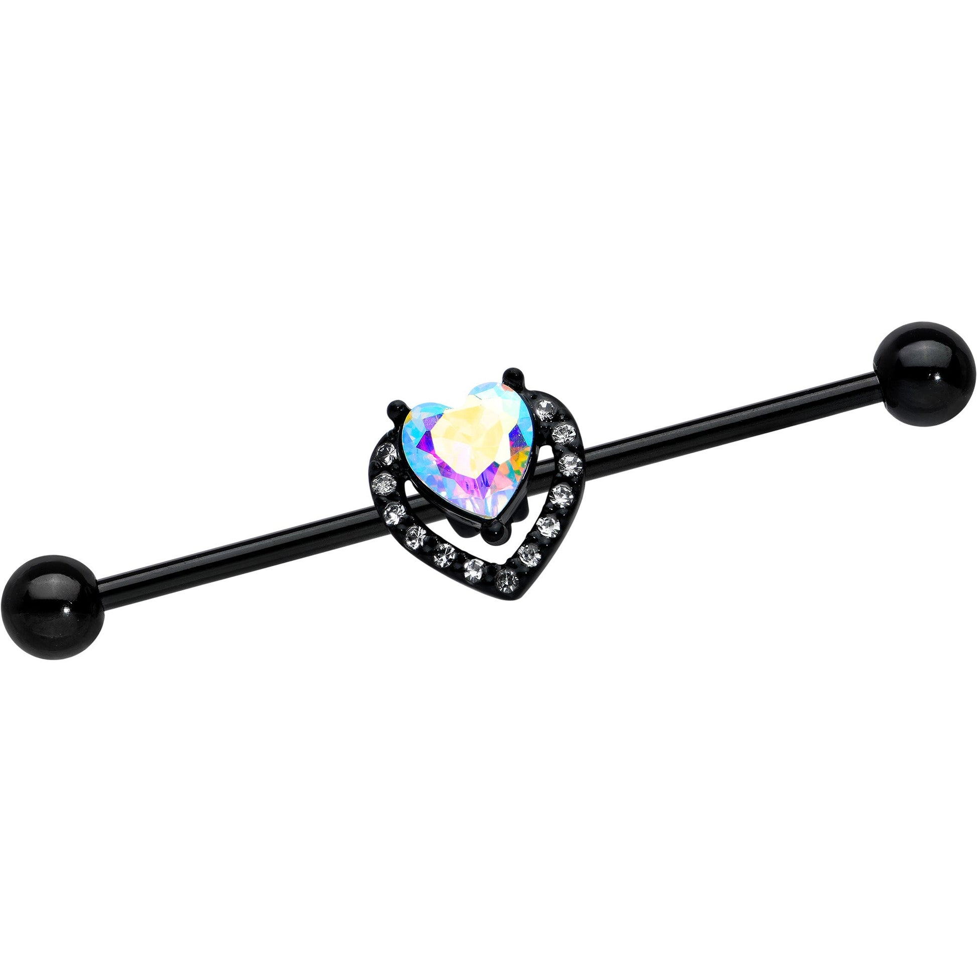 14 Gauge Aurora Clear Gem Black Rococo Heart Industrial Barbell 38mm