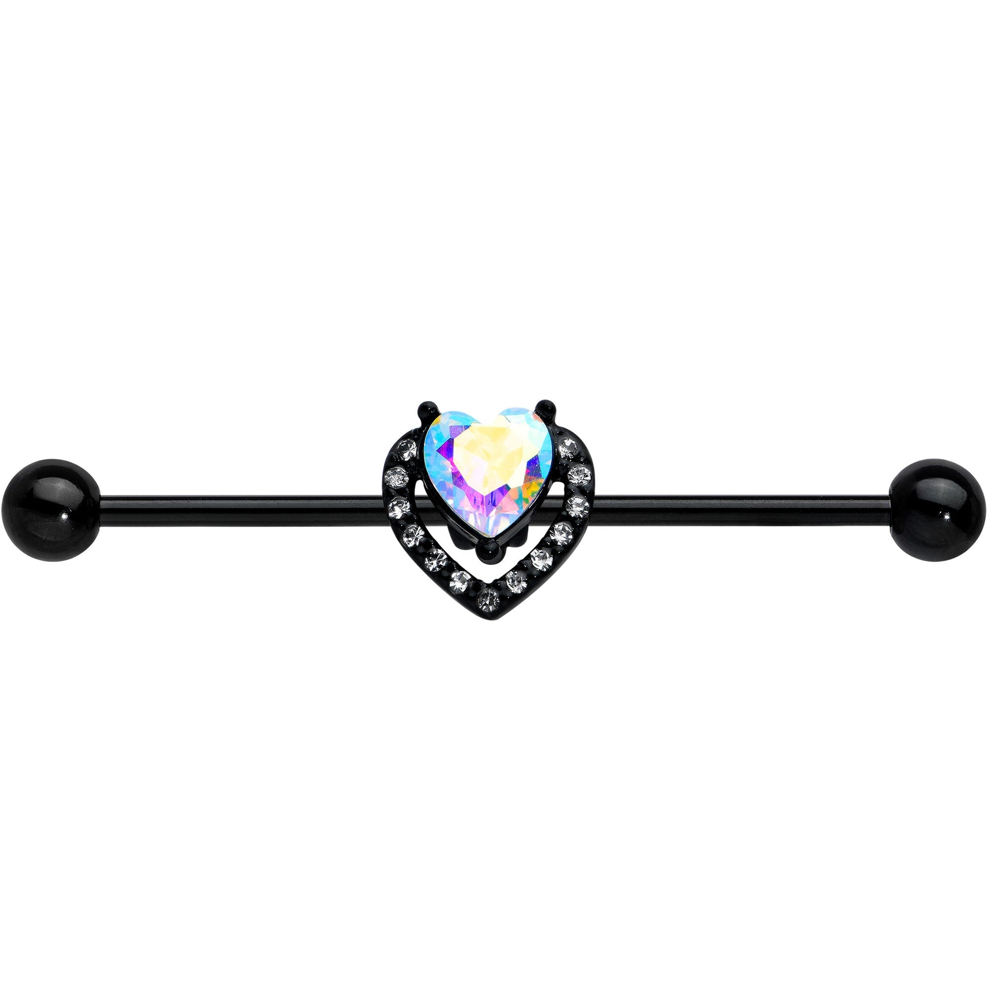 Look luxe and love it without breaking the bank with this 14 gauge helix barbell! It's made with a 1 1/2" black PVD over 316L surgical grade stainless steel straight barbell with 5mm ball ends. It features a double heart charm, with the outer heart paved with clear gems and the inner heart composed of a single aurora gem. You can even slide the hearts up and down the length of the barbell for the perfect look. You're going to fall in love with the opulent look of this heart-themed barbell earring!Specifications