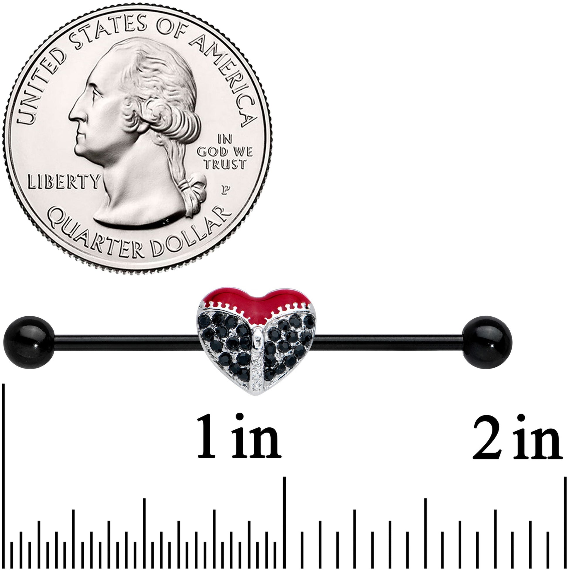 Keep your heart all zipped up with this 14 gauge helix barbell! It's made with a 1 1/2" black anodized over 316L surgical grade stainless steel straight barbell with 5mm ball ends. It features a heart charm. The heart has a red top and is paved with black cubic zirconia gems for sexy and cohesive appearance. It's further embellished with clear cubic zirconia gems and zipper pull-tab charm (non functional!) that makes you wonder if the heart is being zipped up....or unzipped? You can even slide it up and down the barbell for a look you'll love. Only you know for sure with this fun and sexy industrial piercing jewelry!Specifications