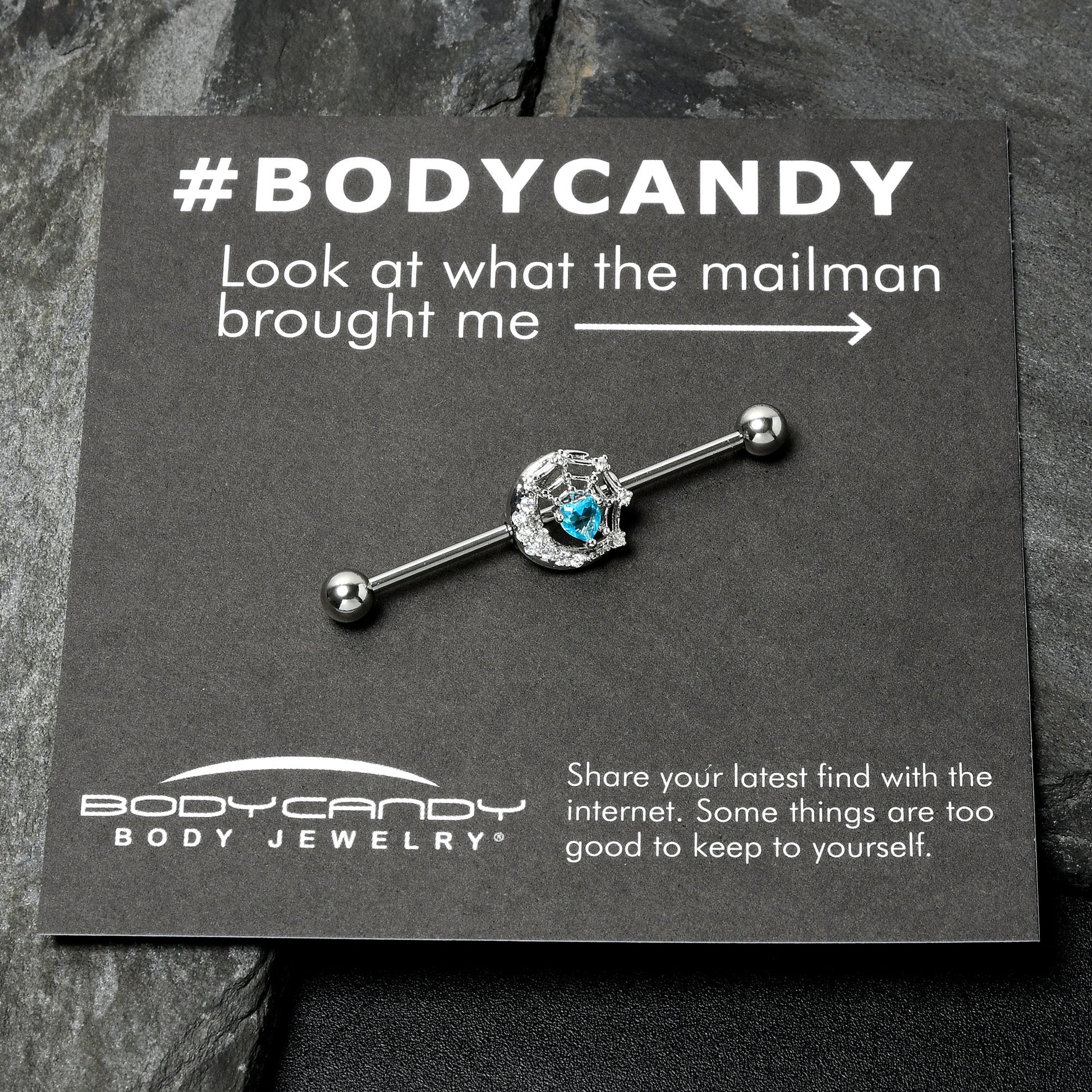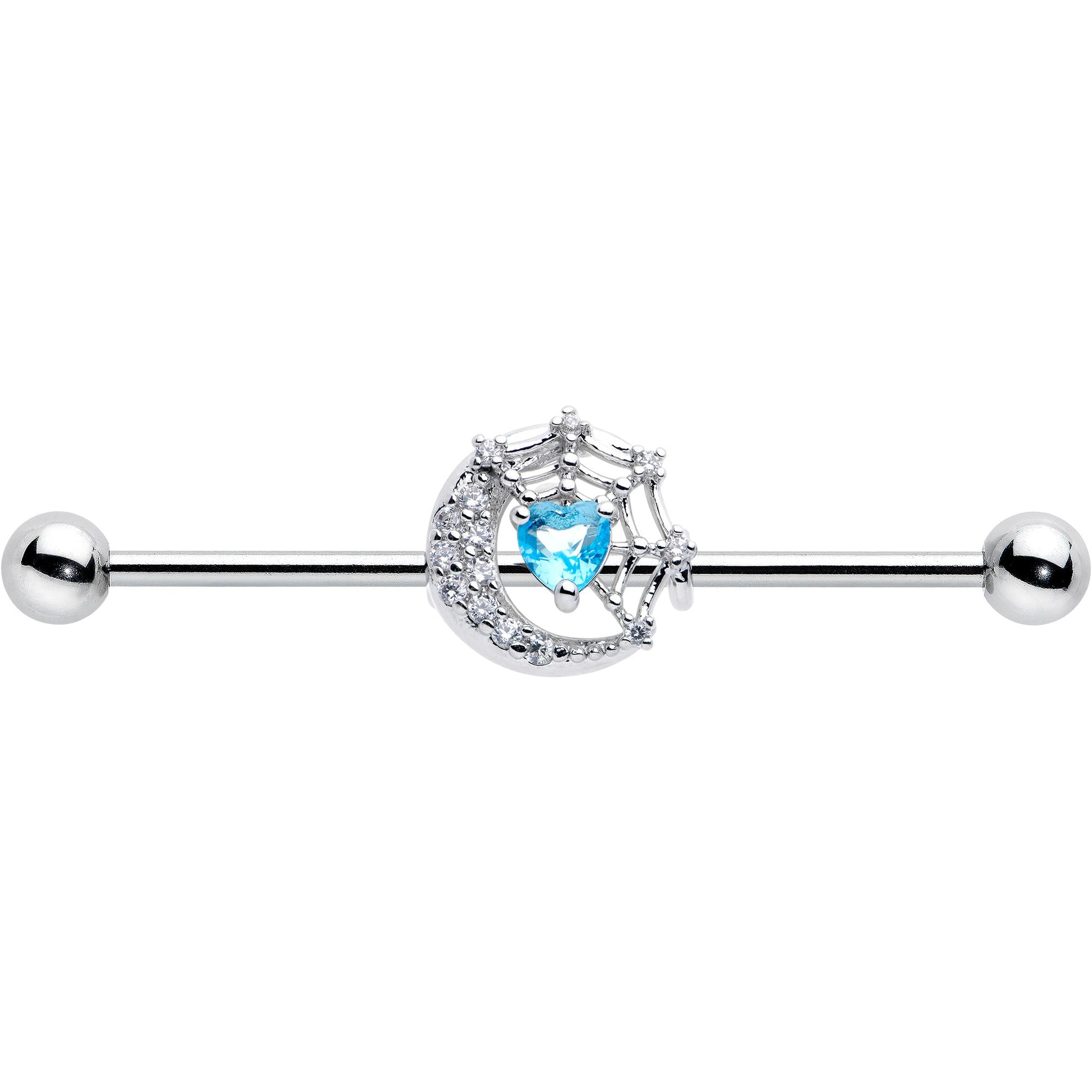 14 Gauge Blue CZ Gem Heart Web Moon Industrial Barbell 38mm