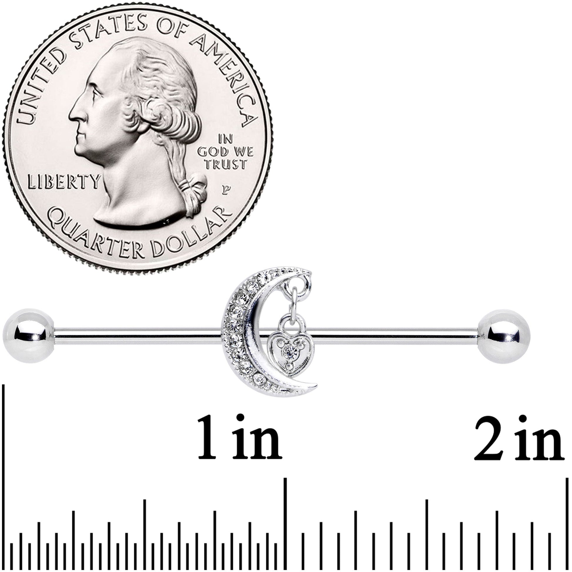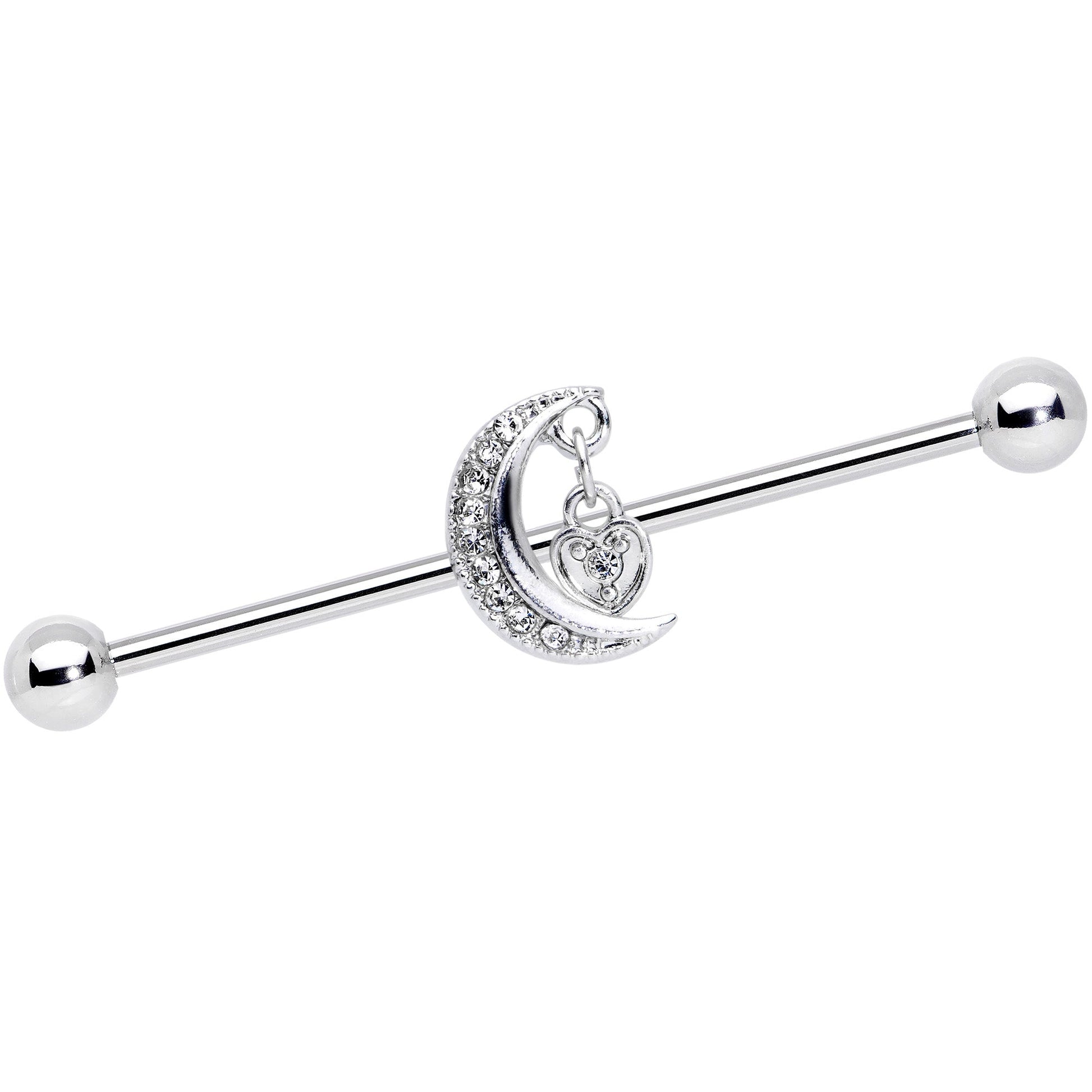 14 Gauge Clear CZ Gem Heart Padlock Moon Dangle Industrial Barbell 38mm