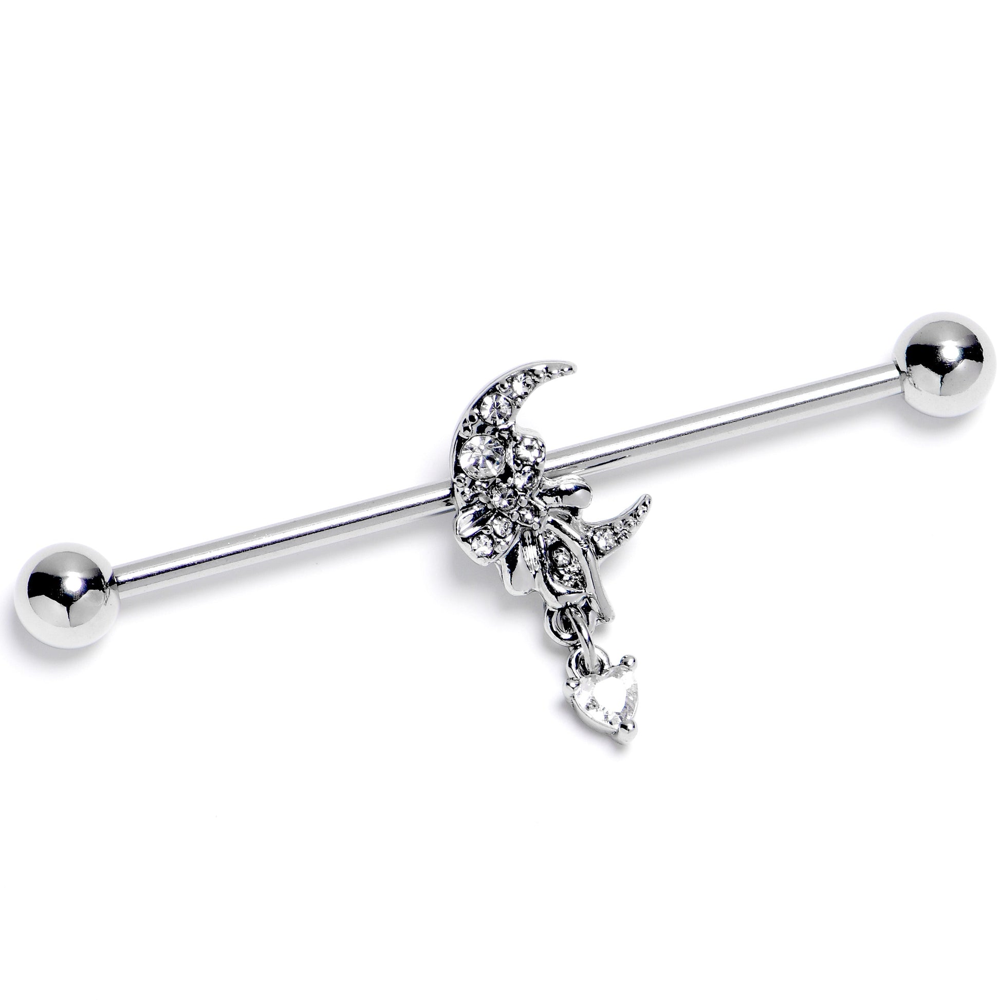 14 Gauge Clear CZ Gem Moon Bow Heart Dangle Industrial Barbell 38mm