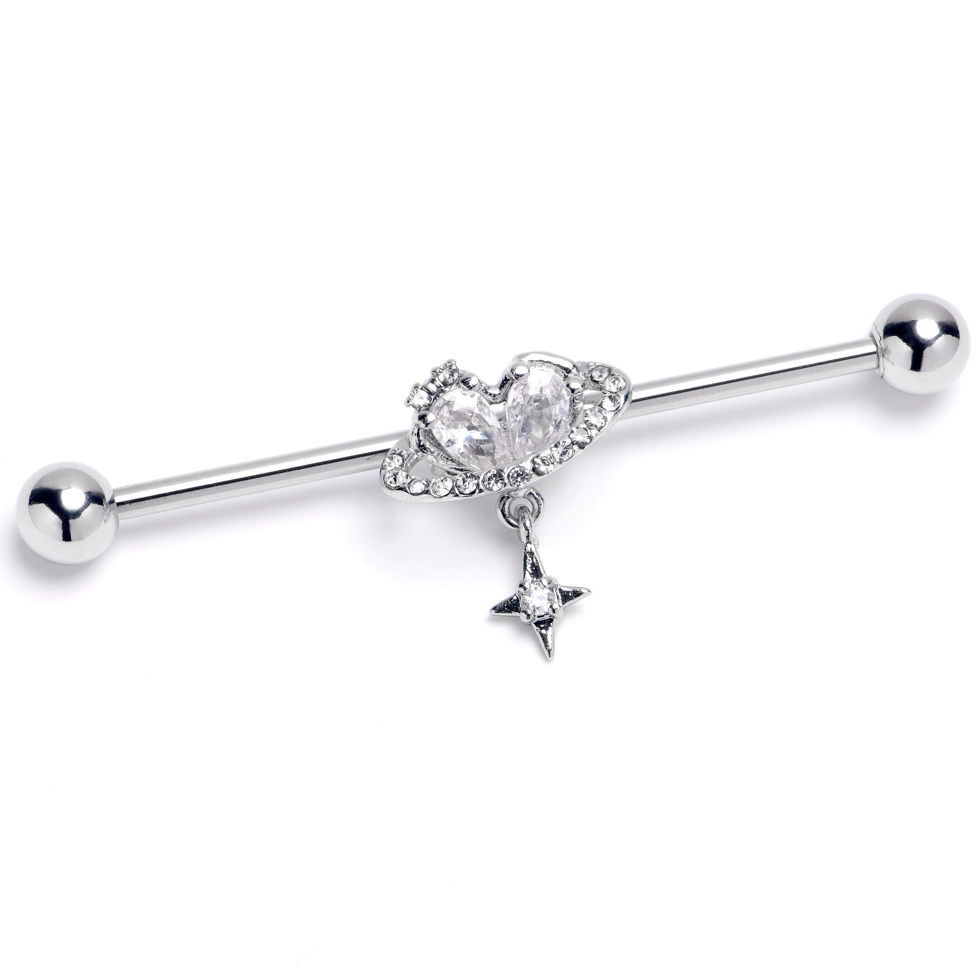 14 Gauge Clear CZ Gem Starry Heart Dangle Industrial Barbell 38mm