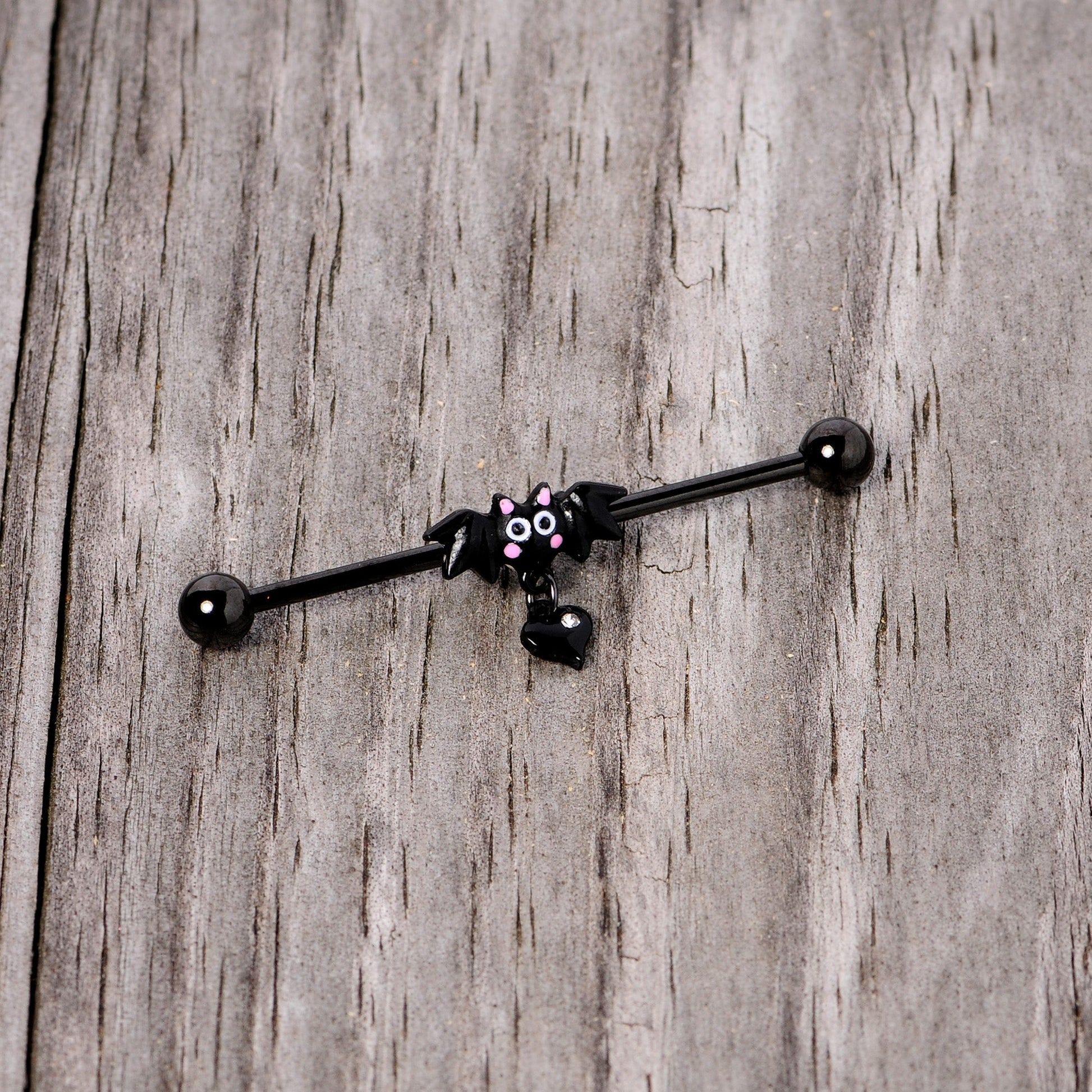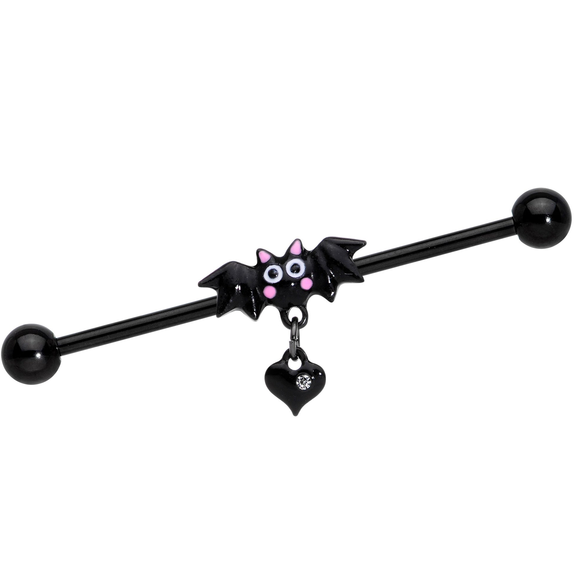 If you are a regular scream queen then get ready for Halloween this year with the perfect 14 gauge industrial piercing. Made with a 1 1/2" black plated over 316L surgical grade stainless steel straight barbell, this industrial earring features 5mm ball ends and a moveable bashful bat charm with a heart dangle charm set with a clear gem. This industrial body jewelry is super scary!Specifications