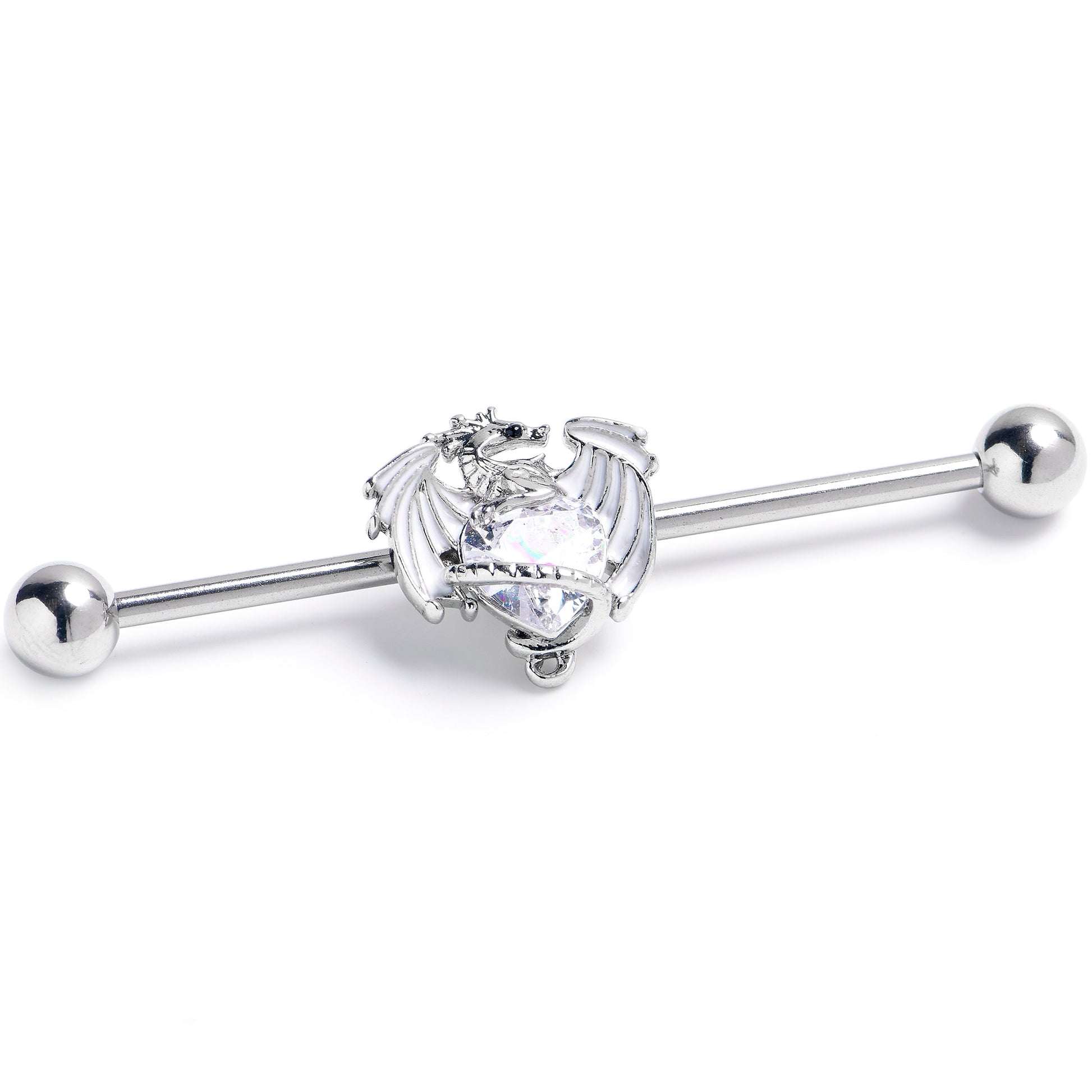 The dragon on this 14 gauge helix barbell has a hoard of love to share. It is made with a 1 1/2 inch 316L surgical grade stainless steel straight barbell with 5mm ball ends. It features a dragon charm with embellished wings. The dragon is clutching a clear gem heart for added style. You can even slide it up and down the length of the barbell for the perfect look. You will definitely want to share this dragons love with this medieval style barbell earring.Specifications