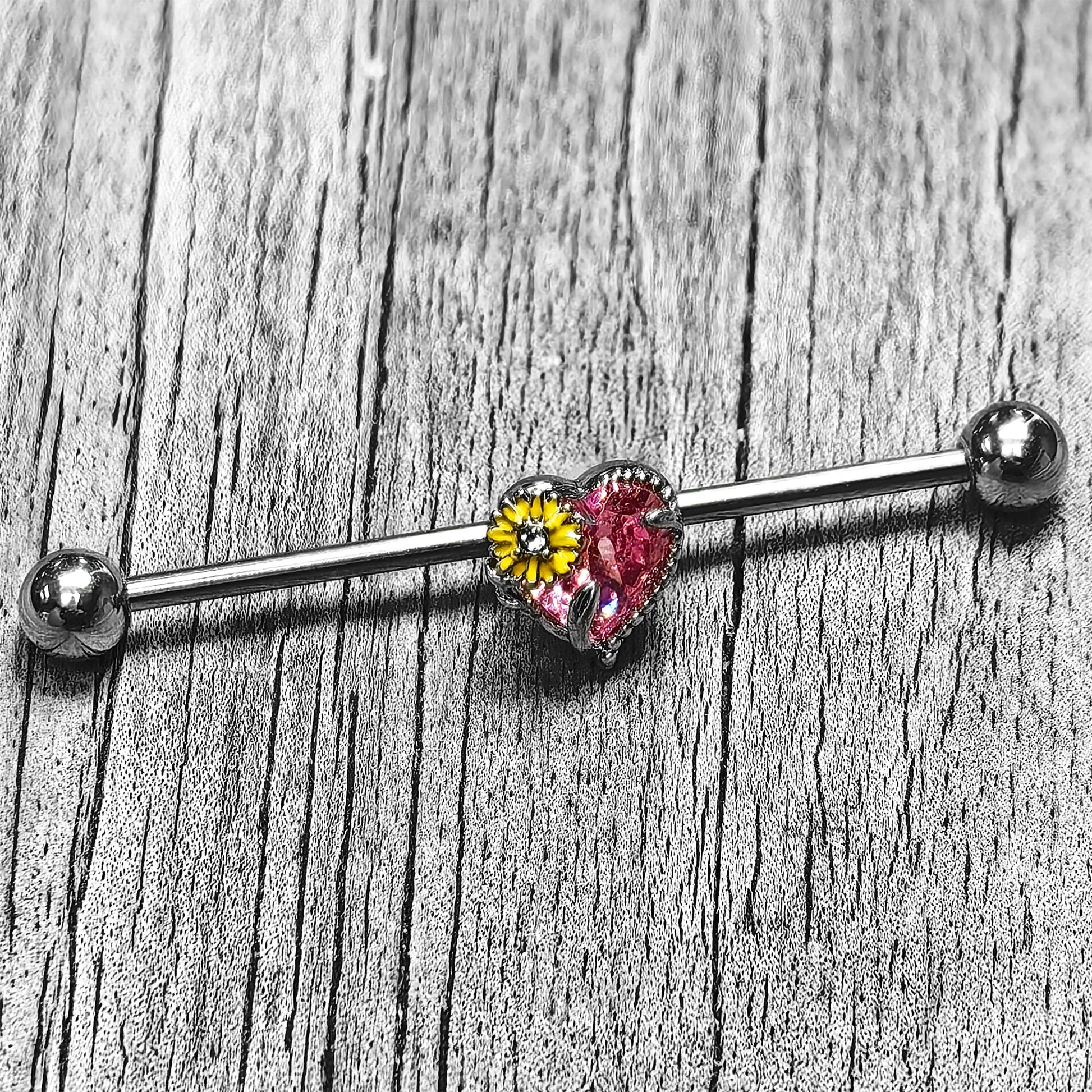 14 Gauge Clear Pink Gem Sunflower Heart Love Industrial Barbell 38mm