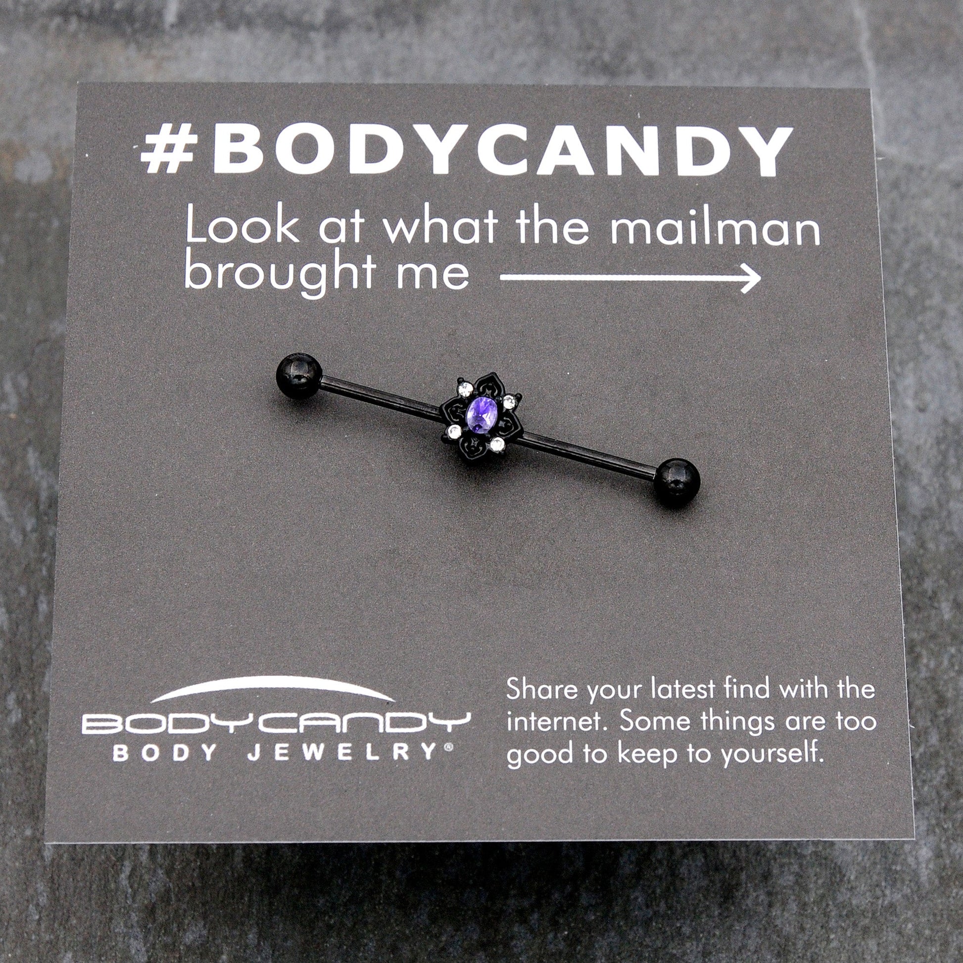 Fall in love with a goth new look, like on this 14 gauge helix barbell. It is made with a 1 1/2 inch black PVD over 316L surgical grade stainless steel straight barbell with 5mm ball ends. It features an oval charm, with a purple gem center. It is further embellished with scrollwork hearts, with a clear gem set between each one. You can even slide it up and down the length of the barbell for the perfect look. Let your inner goth come out to play with this darkly divine barbell earring.Specifications