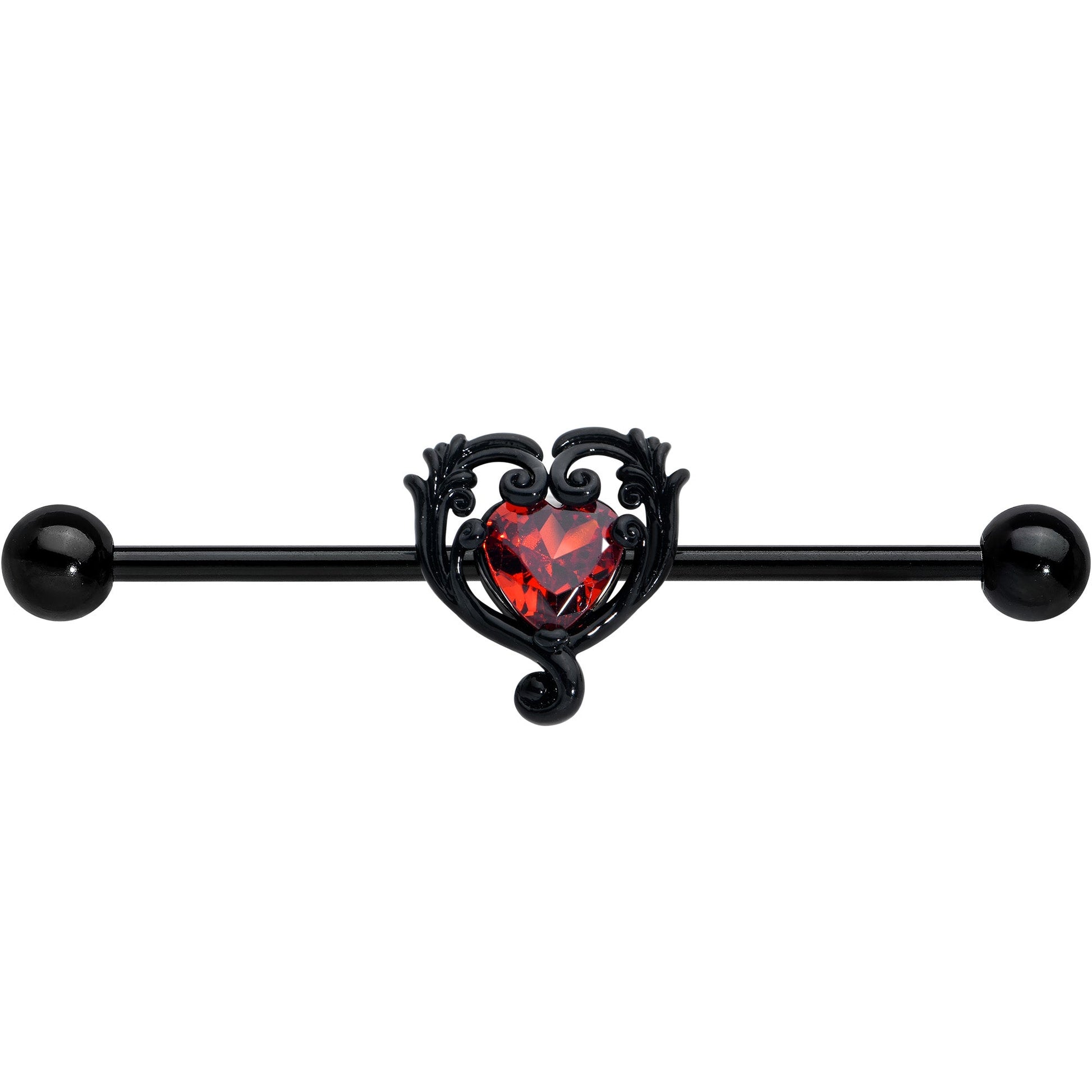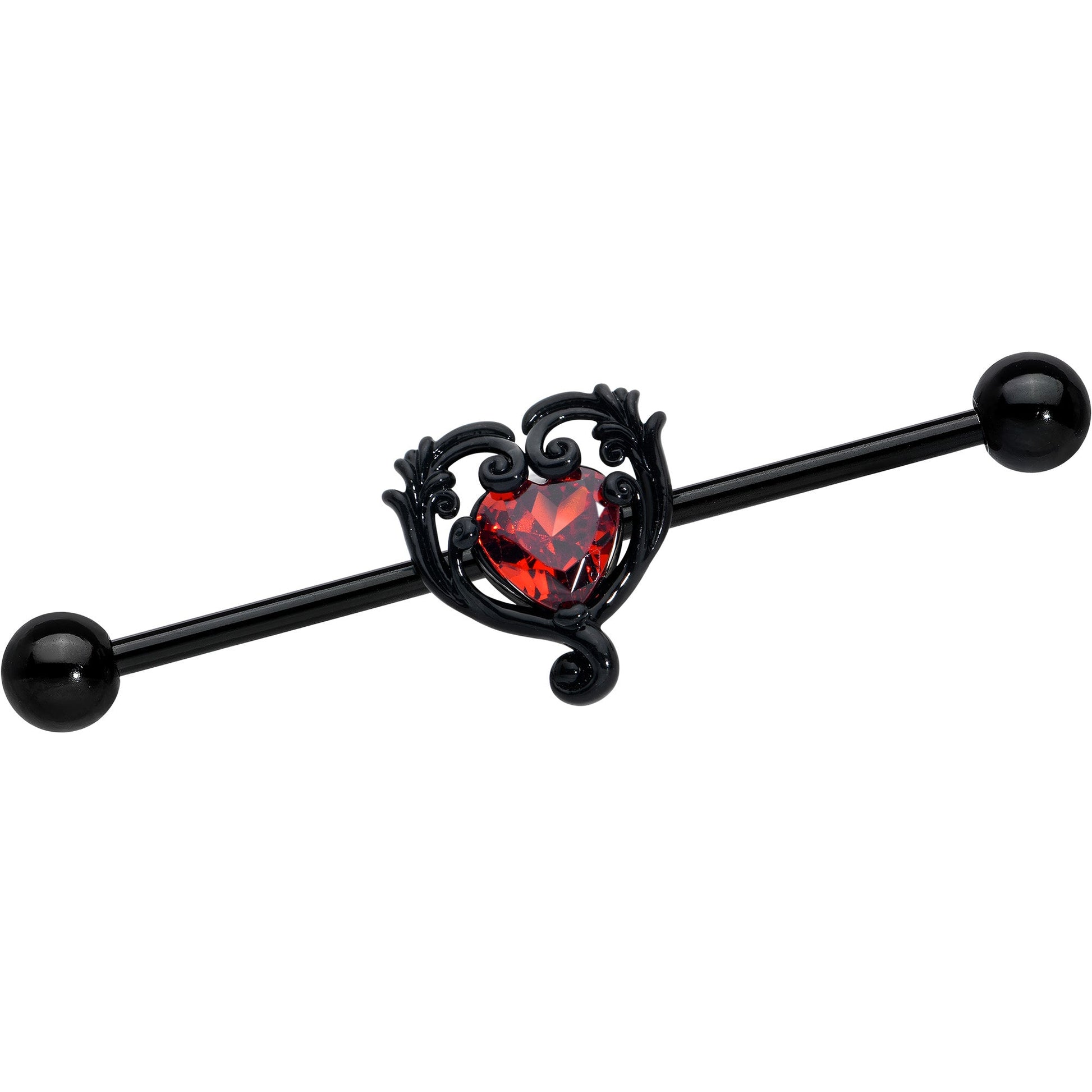 14 Gauge Red CZ Gem Black Passion Heart Industrial Barbell 38mm