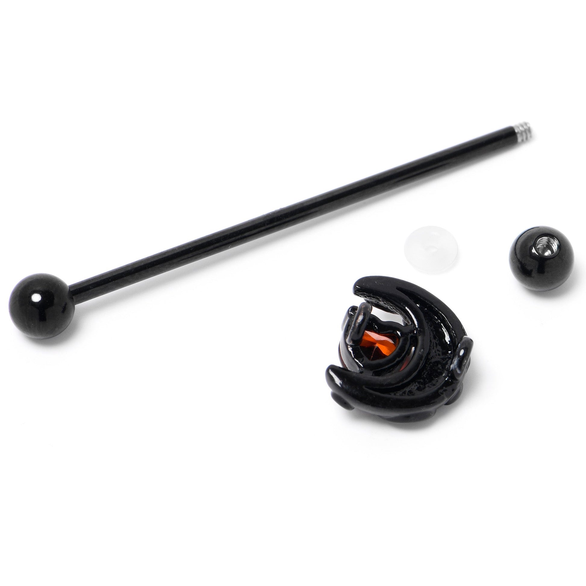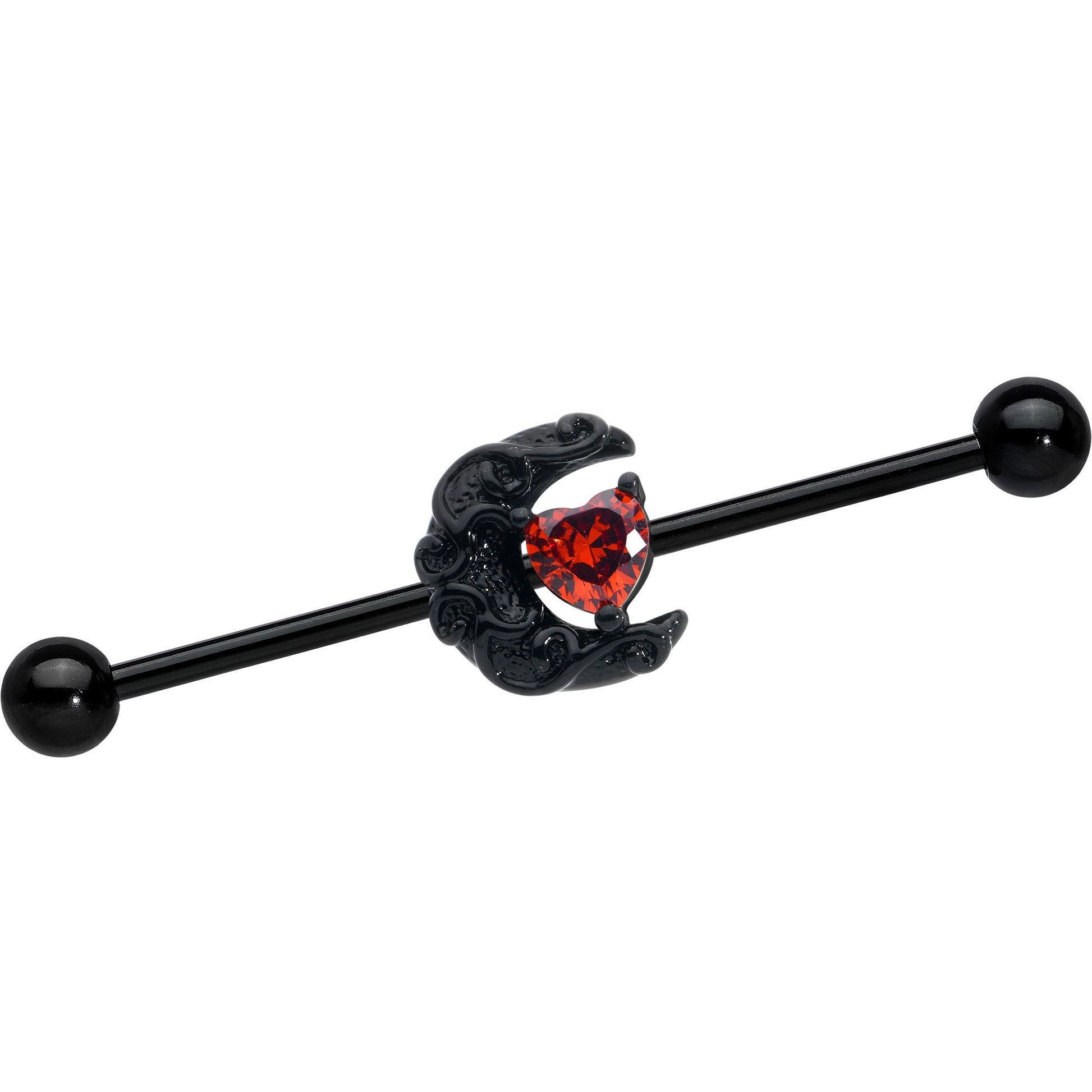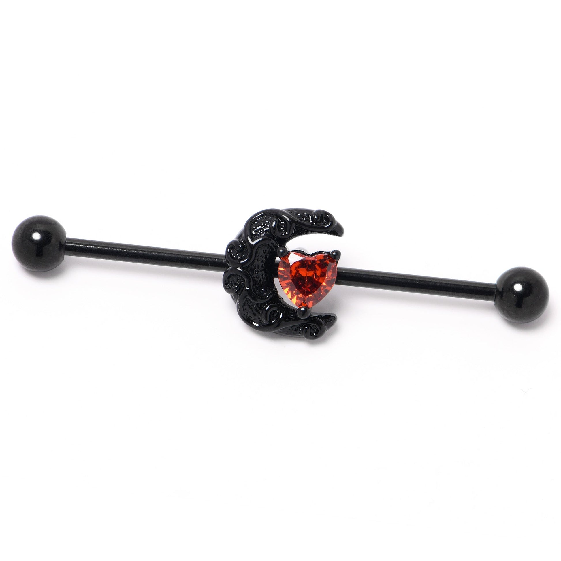 14 Gauge Red CZ Gem Black Scroll Moon Heart Industrial Barbell 38mm