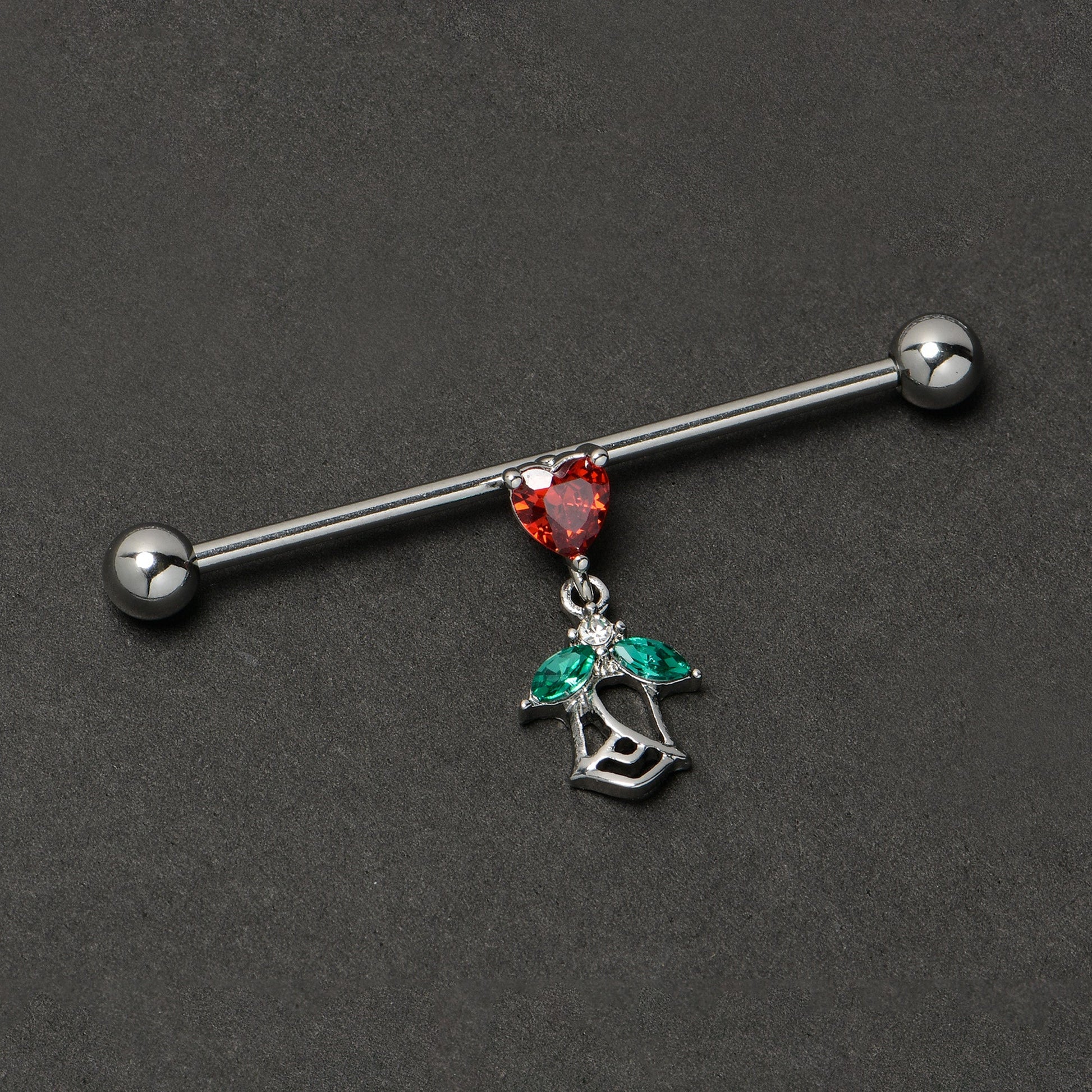 14G Red CZ Gem Heart And Rose Dangle Industrial Barbell 38mm