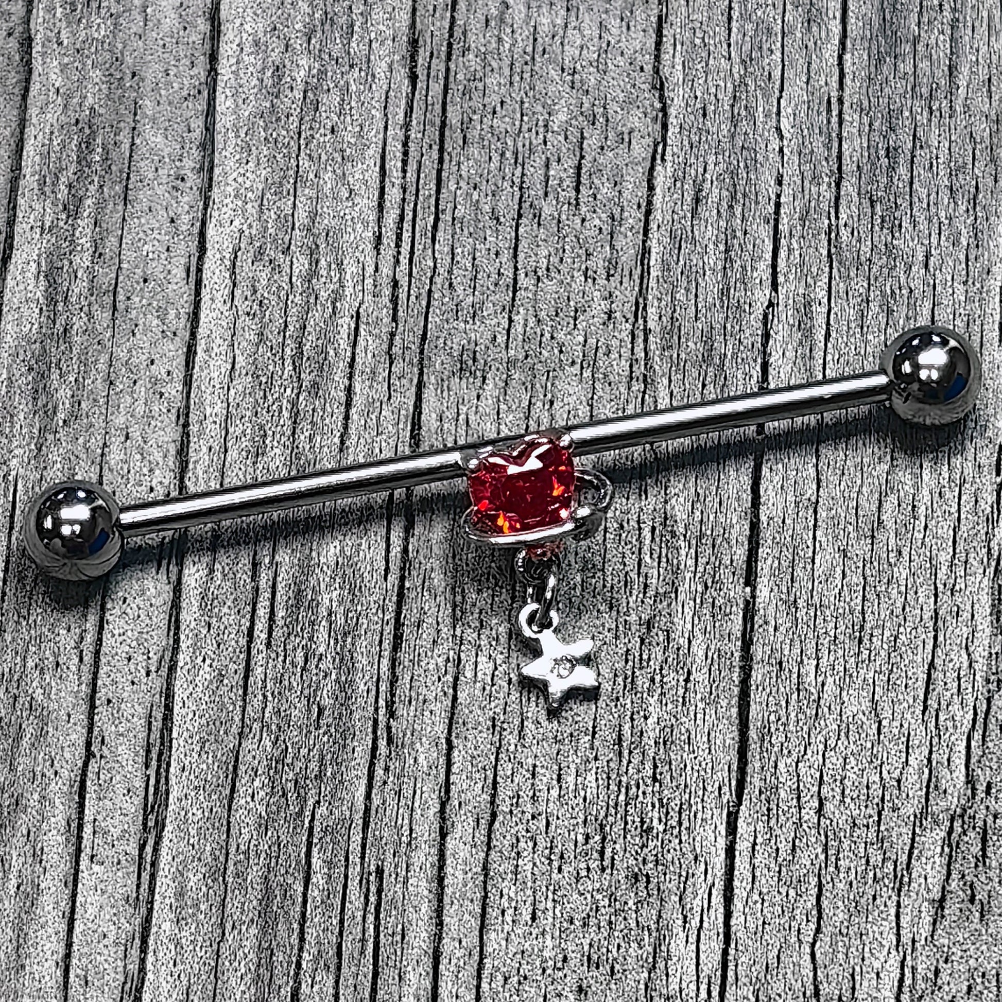 14 Gauge Red CZ Gem Starry Saturn Heart Dangle Industrial Barbell 38m