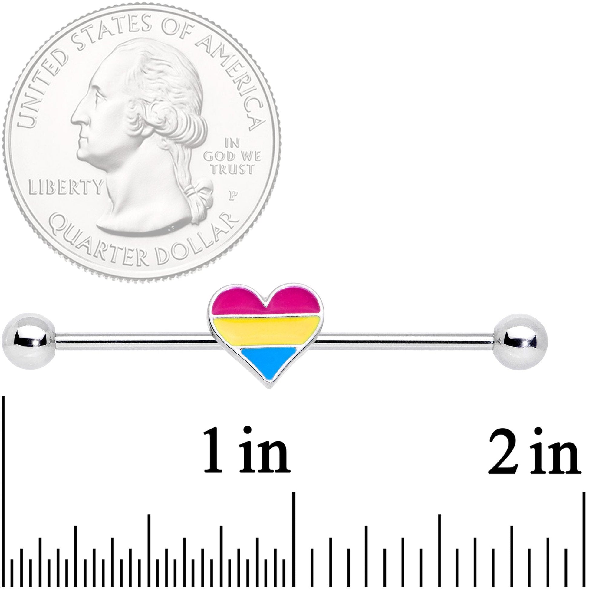 Show off your belief in individual rights when you wear this 14 gauge industrial piercing. Made with a 1 1/2" durable 316L surgical grade stainless steel straight barbell, this industrial jewelry features a moveable red, yellow, and blue pansexual pride heart charm so you can show your support anytime.Specifications