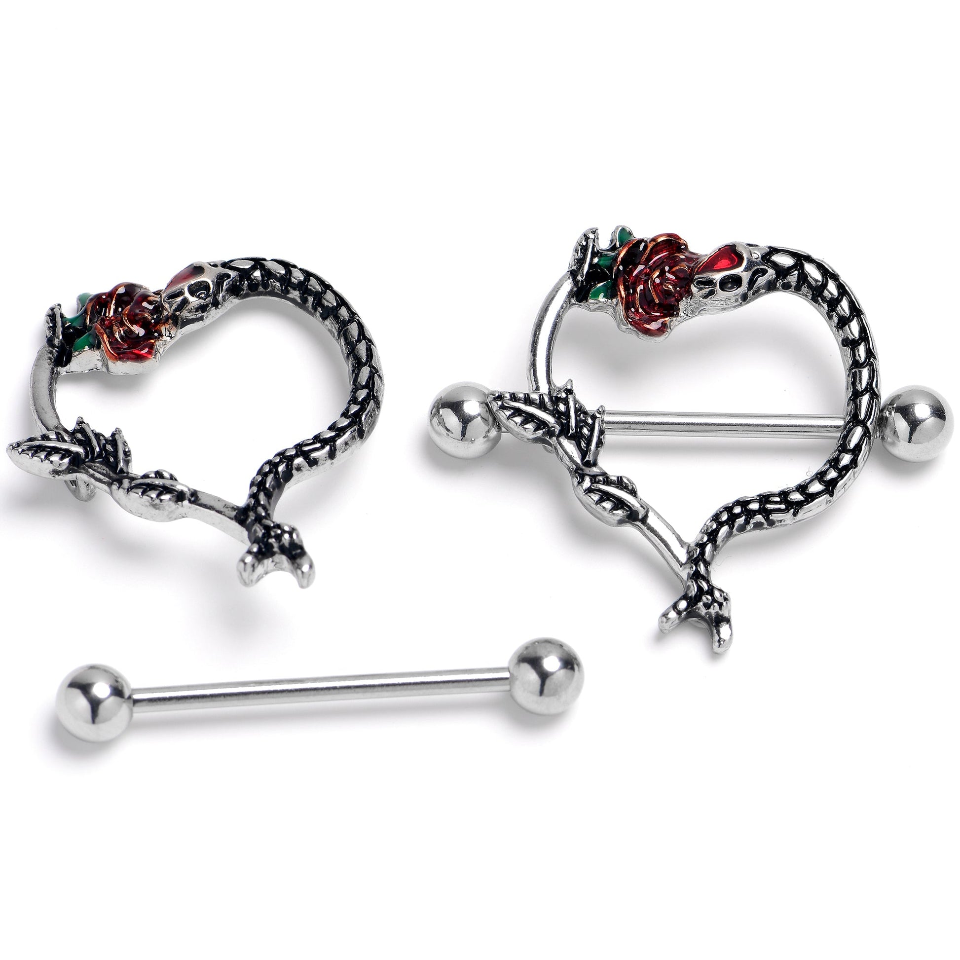 This exquisite nipple shield set combines the beauty of a delicate rose flower with the serpentine allure of a winding snake, creating a mesmerizing and eye-catching design. The nipple rings set features a surgical steel straight barbell and heart shaped shields. 14 gauge nipple piercing barbellsSpecifications