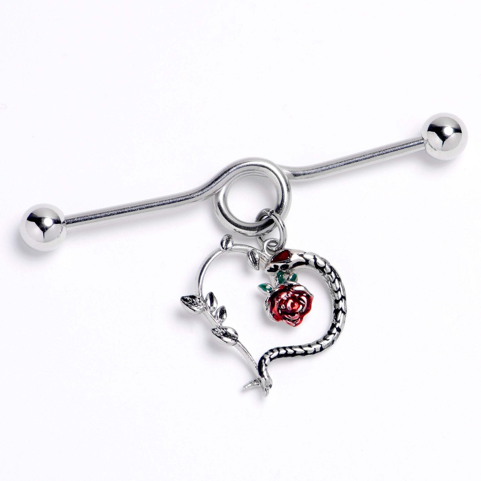 Add some serpentine glamour to your look with this 14 gauge helix barbell. It is made with a 1 1/2 inch 316L surgical grade stainless steel project bar with 5mm ball ends. The barbell features a loop in the center. Dangling from it is a heart charm with one side composed of a snake with textured detailing. A rose charm dangles from the top of the heart and the stem and leaves make up the side. Get a look that you will not want to shed with this sexy serpent floral barbell earring.Specifications