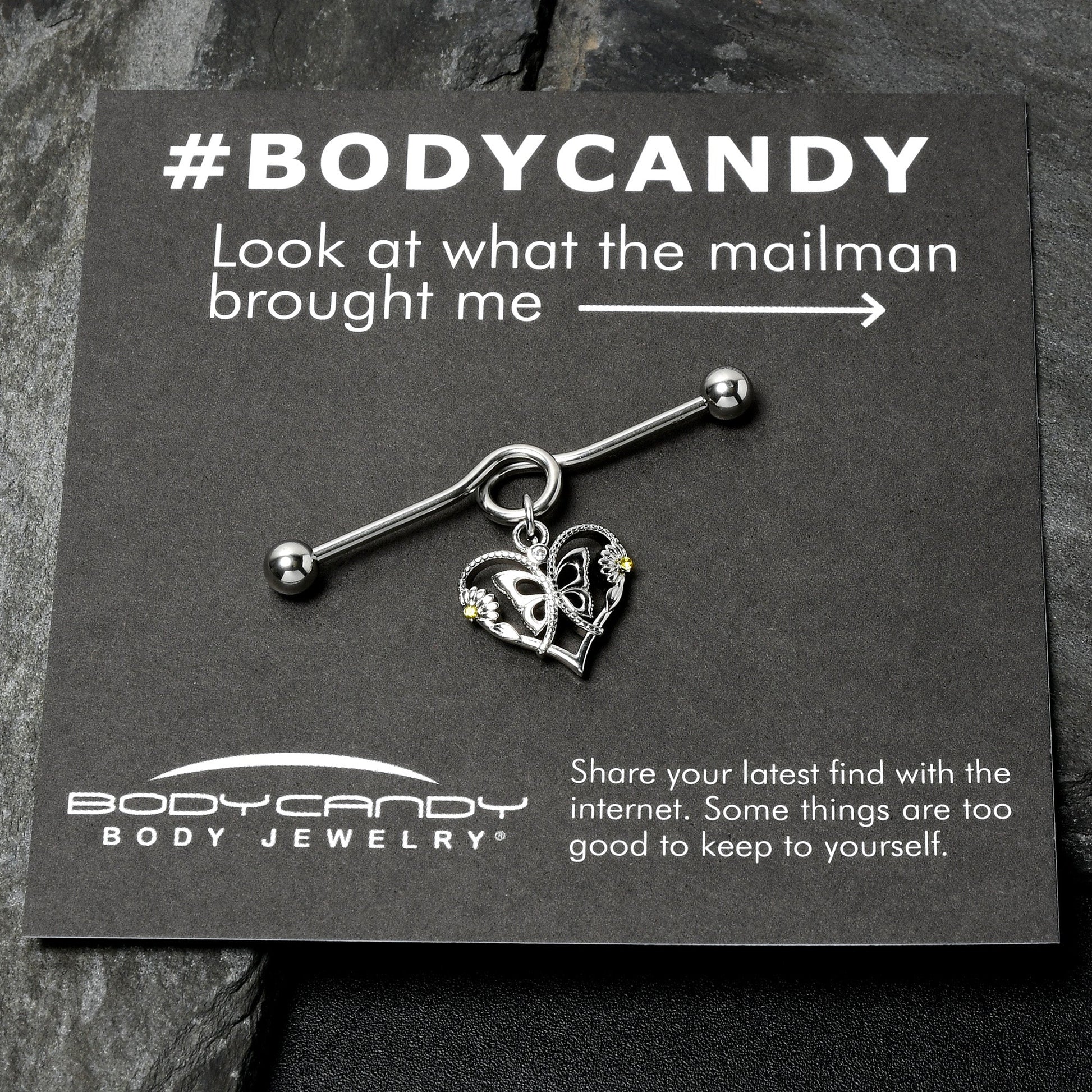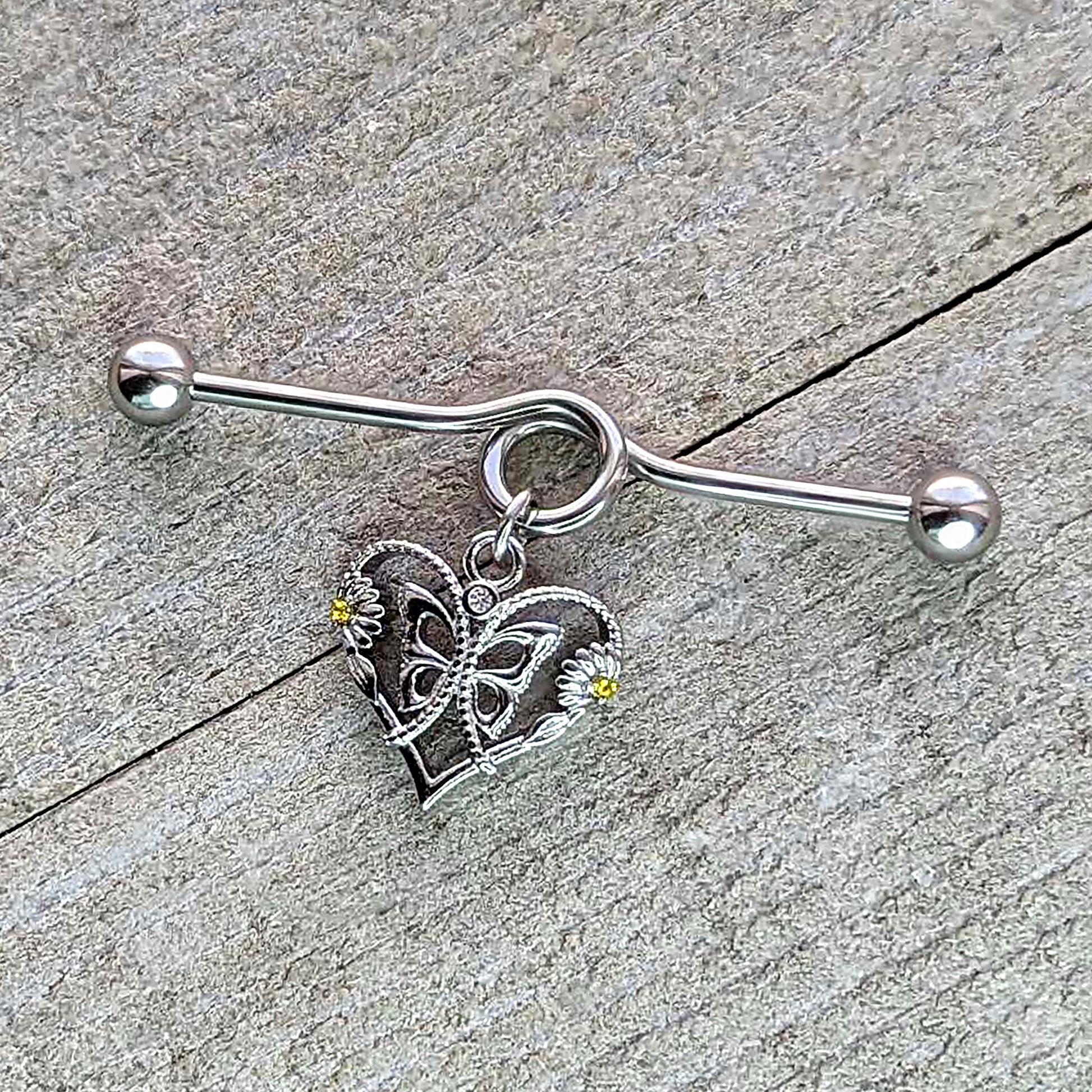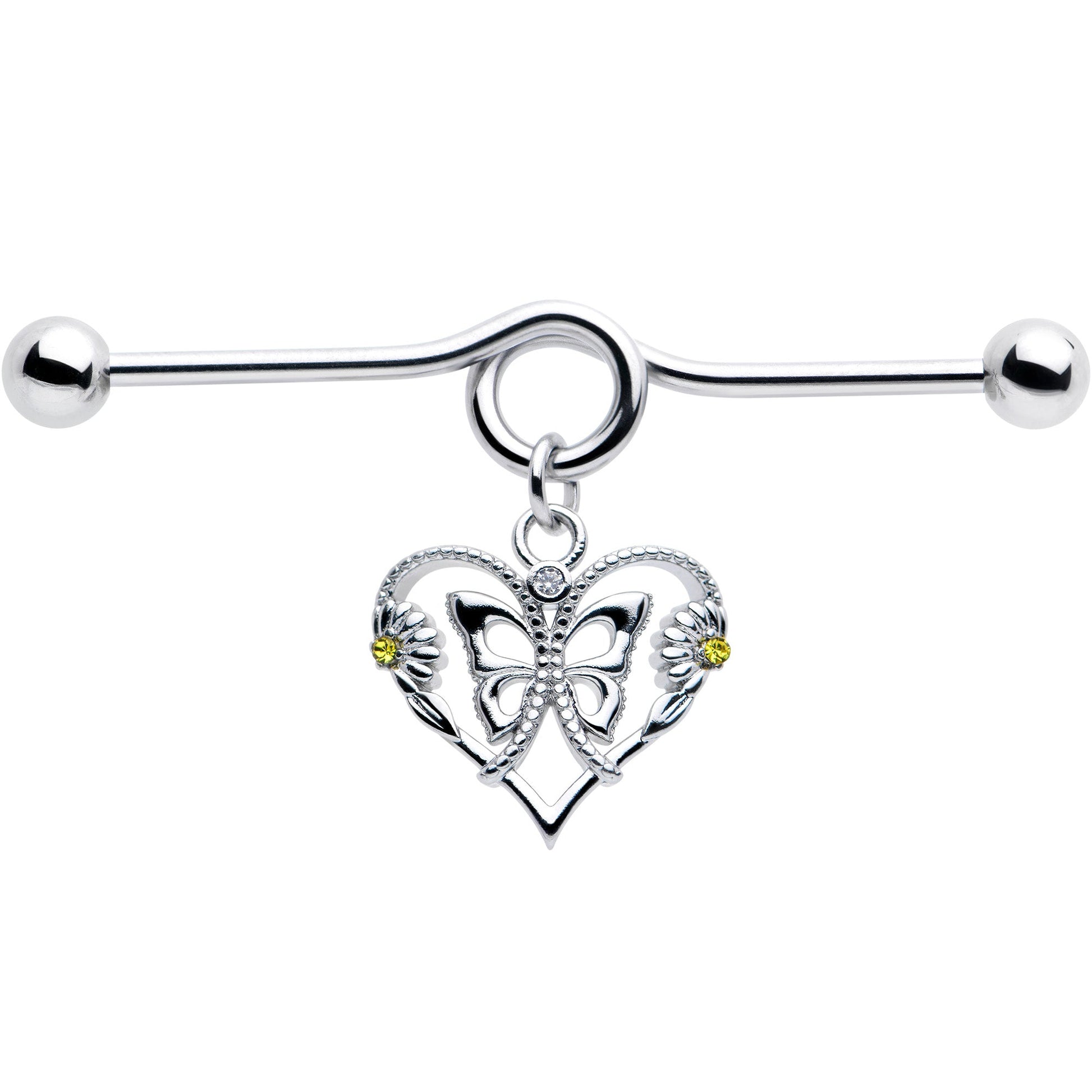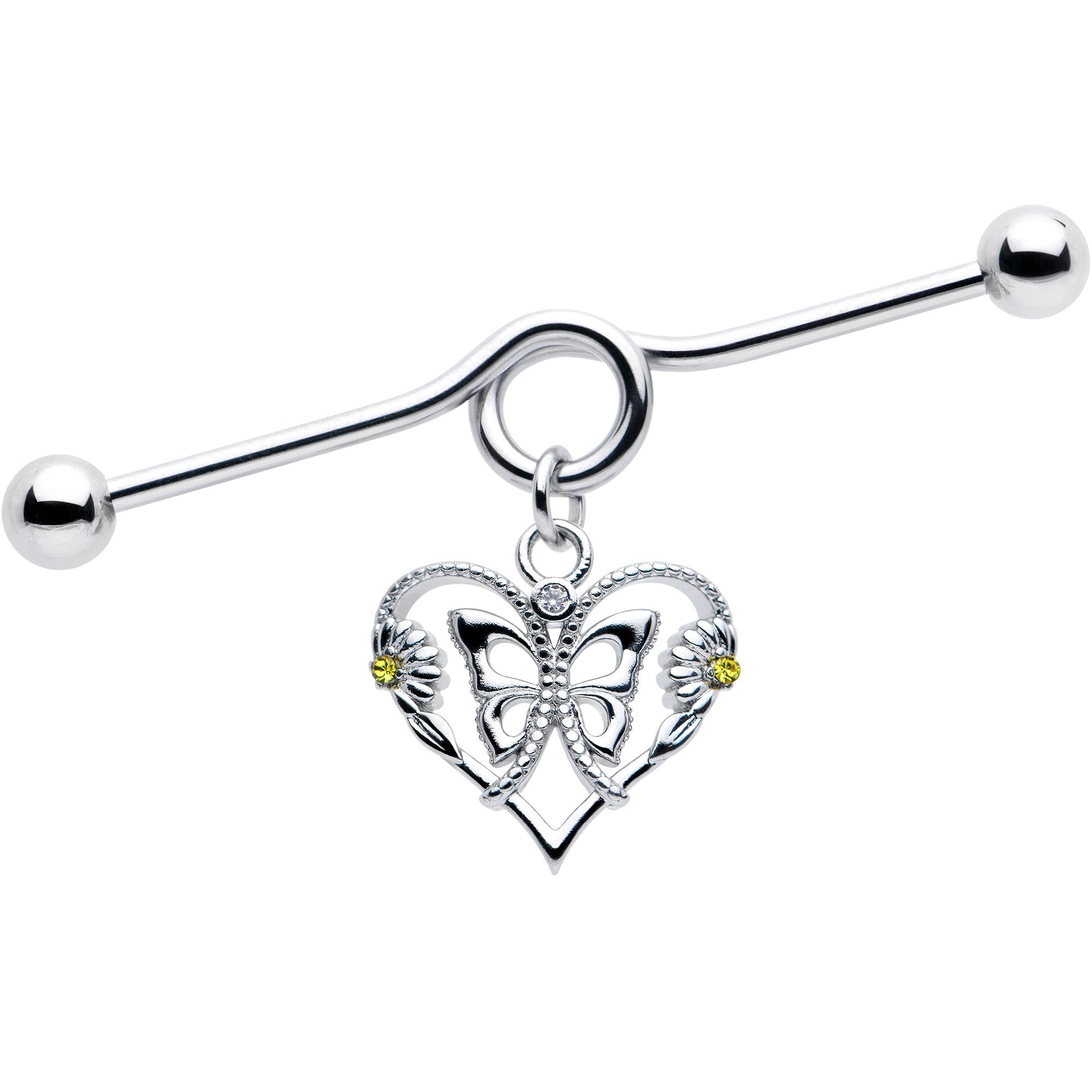 Everything is Spring, on this 14 gauge helix barbell. It is made with a 1 1/2 inch 316L surgical grade stainless steel project bar with 5mm ball ends. It features a loop in the center of the barbell that supports a dangling heart charm. The center of the heart features a butterfly, with a clear cubic zirconia gem atop it. At either side of the butterfly are flower embellishments, set with yellow cubic zirconia gems at their centers. Rock a whole new season of style in your industrial piercing with this sweetheart of a barbell earring.Specifications