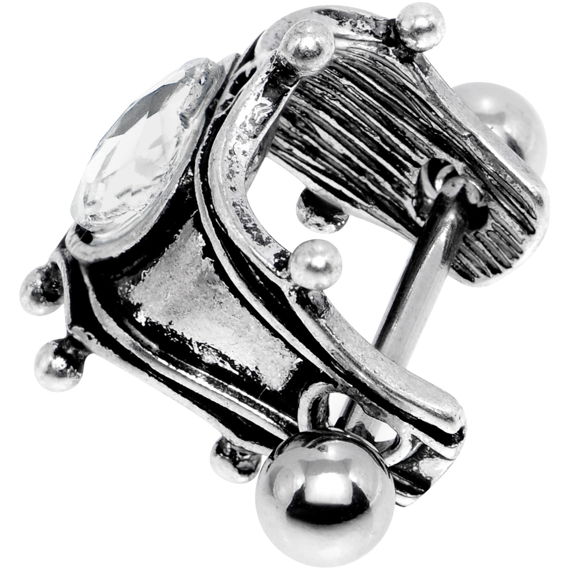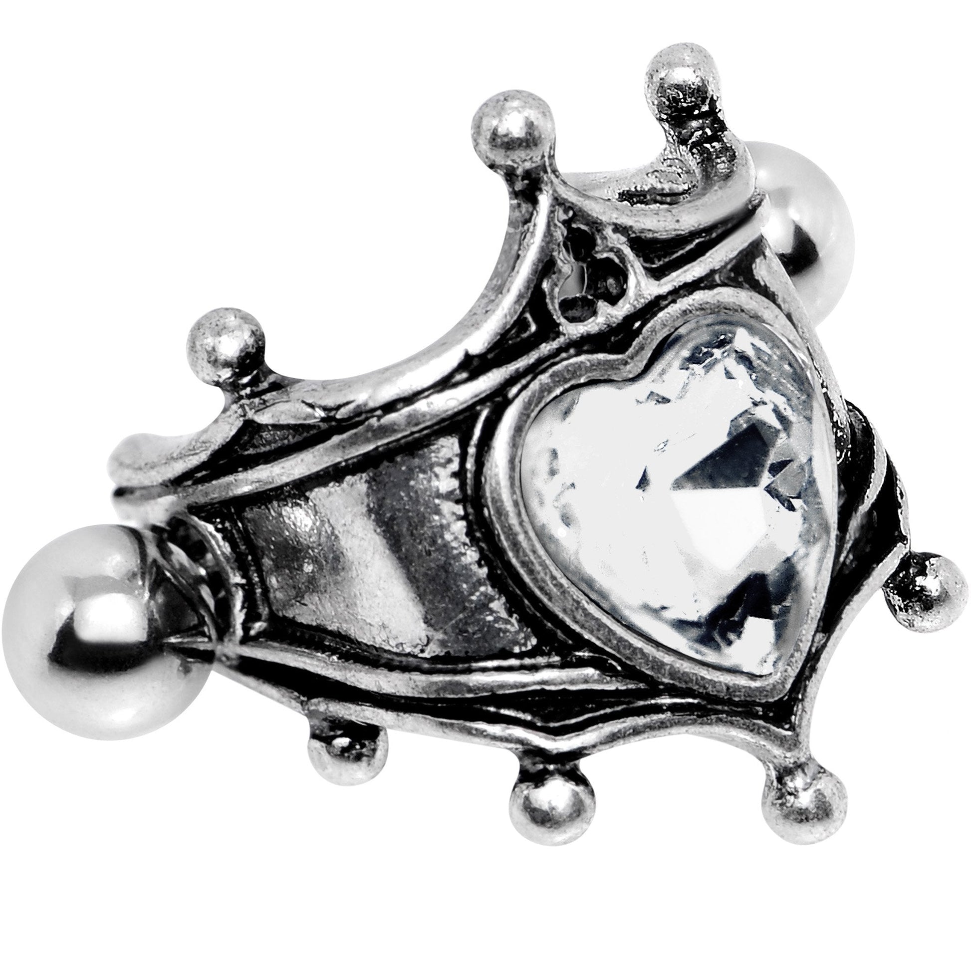 You'll feel like the queen of the kingdom with this fancy helix cartilage cuff earring. A royal crown cuff design is decorated with a majestic clear heart-shaped gem on this opulent cuff earring. The queen's crown cuff charm is mounted on a 12mm straight barbell made with durable 316L surgical grade stainless steel. This fancy design wraps around your ear cartilage for a unique display.