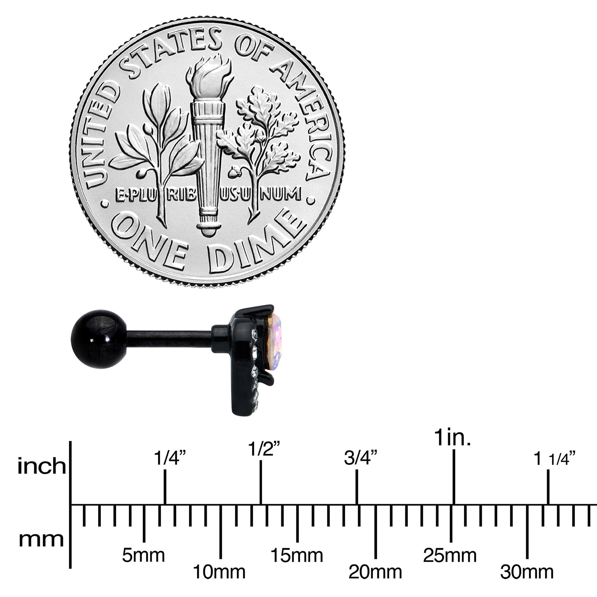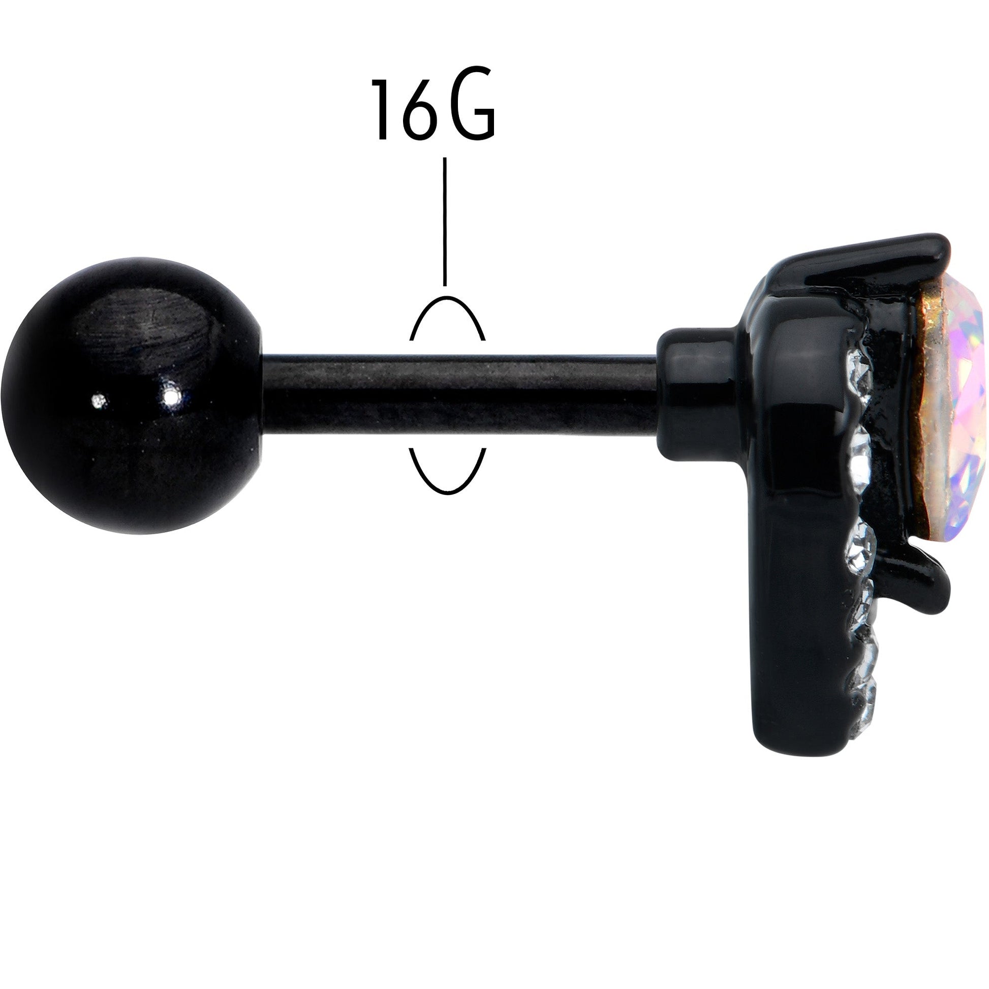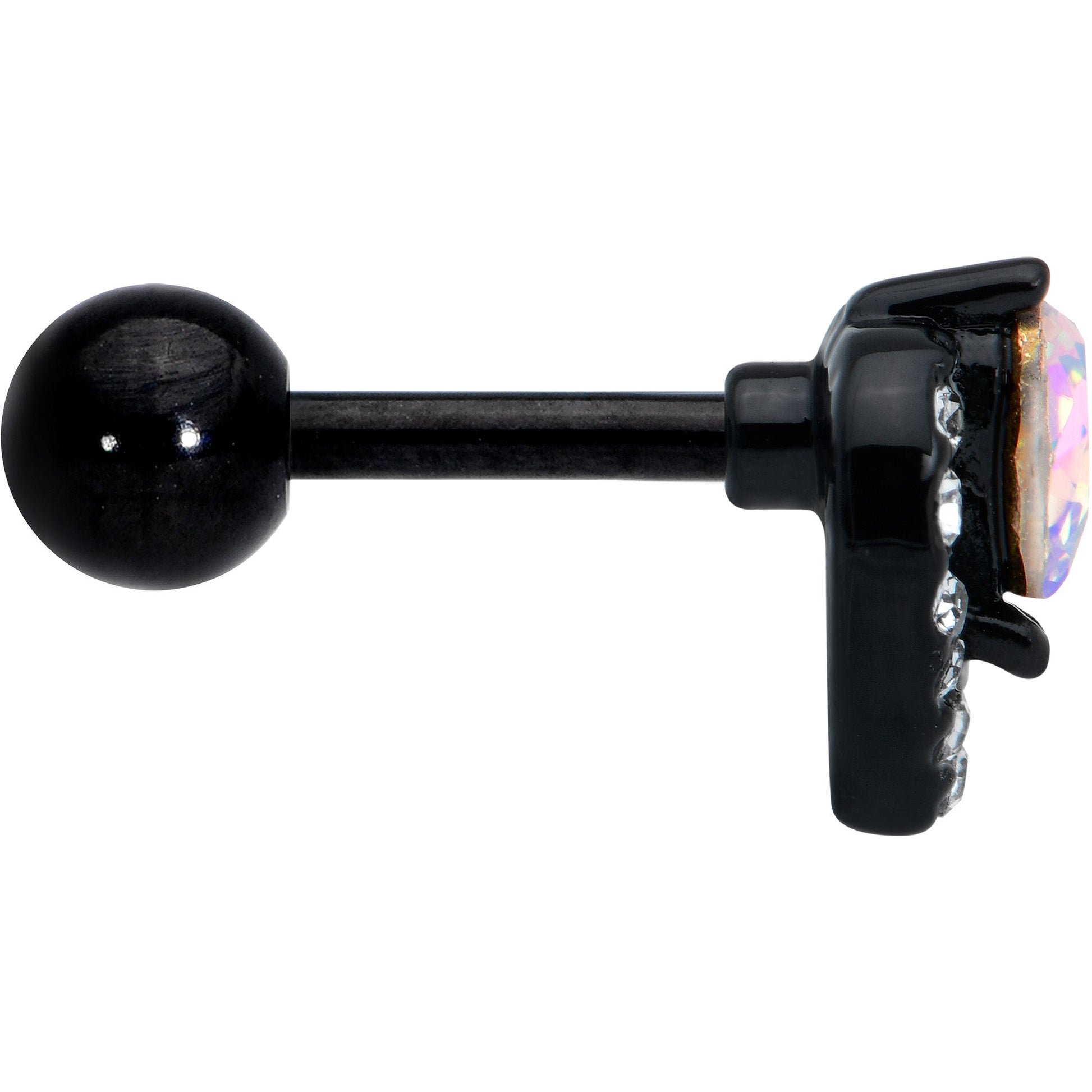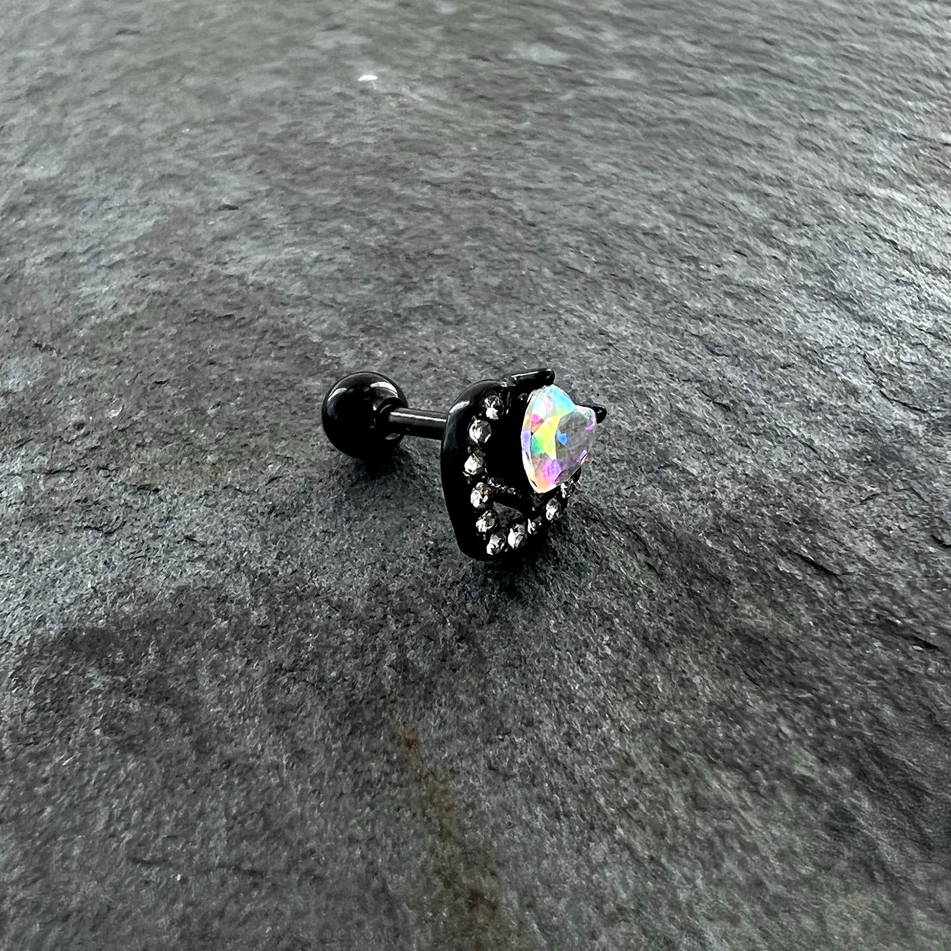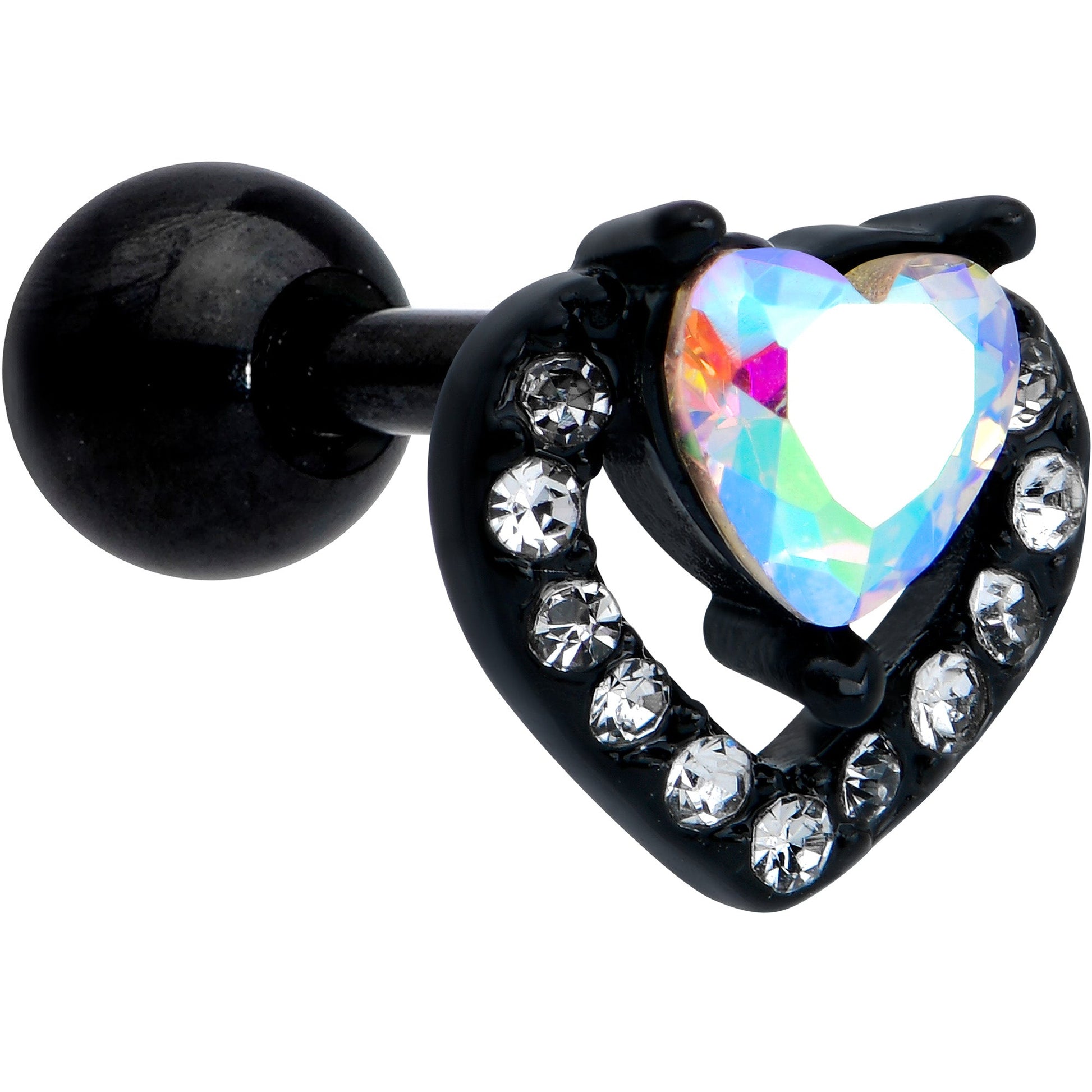 Look luxe and love it without breaking the bank with this 16 gauge tragus stud! It's made with a 6mm black PVD over 316L surgical grade stainless steel straight barbell with a 4mm ball end. It features a heart charm, with one heart composed of a single aurora gem. It's set within a second heart, paved with clear gems. You can even rock these hearts in multiple piercings including tragus, helix, and some conch piercings. You're going to fall in love with the opulent look of this heart-themed cartilage stud!Specifications