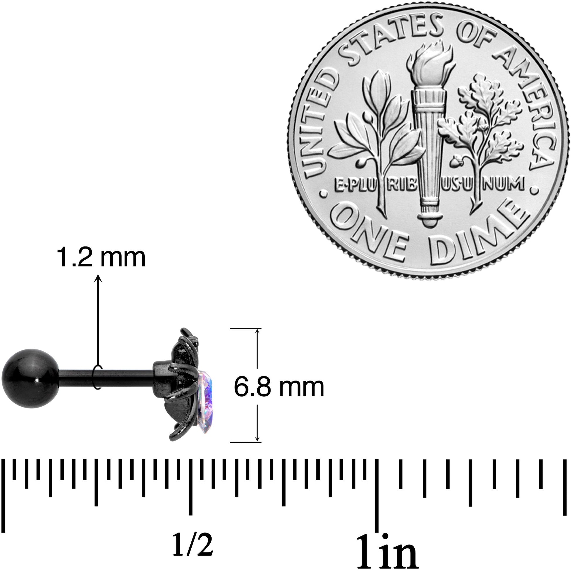 This spider body jewelry will give you the Halloween shivers.....but not shivers of fear! This 16 gauge cartilage stud is made with a 6mm black plated over 316L surgical grade stainless steel straight barbell with a 4mm ball end. It features a spider charm with the body made of a Valentine's Day heart-shaped aurora gem and the head composed of a smaller aurora gem. This little creature works well in multiple piercings including tragus, helix, some conch piercings, and more. So whether you cherish creepy crawlies or appreciate arachnids, this tragus stud is sure to snare you in its web!Specifications