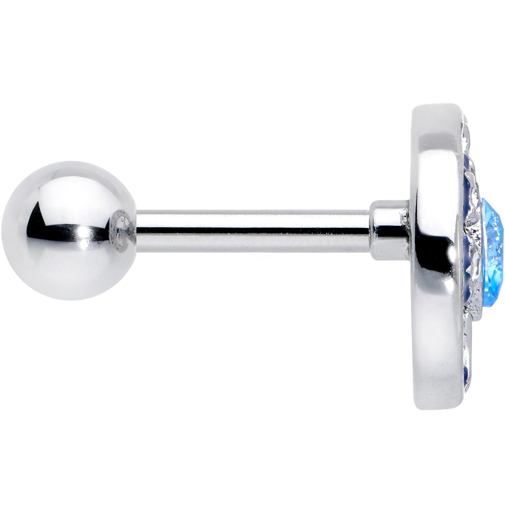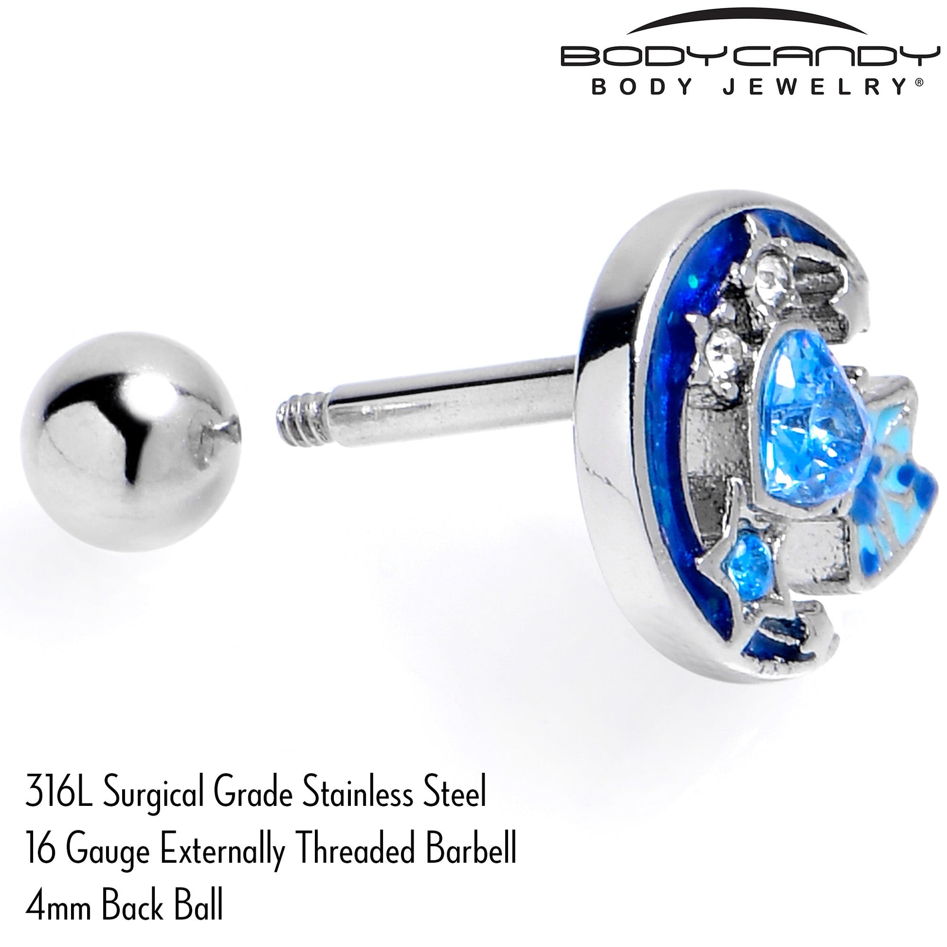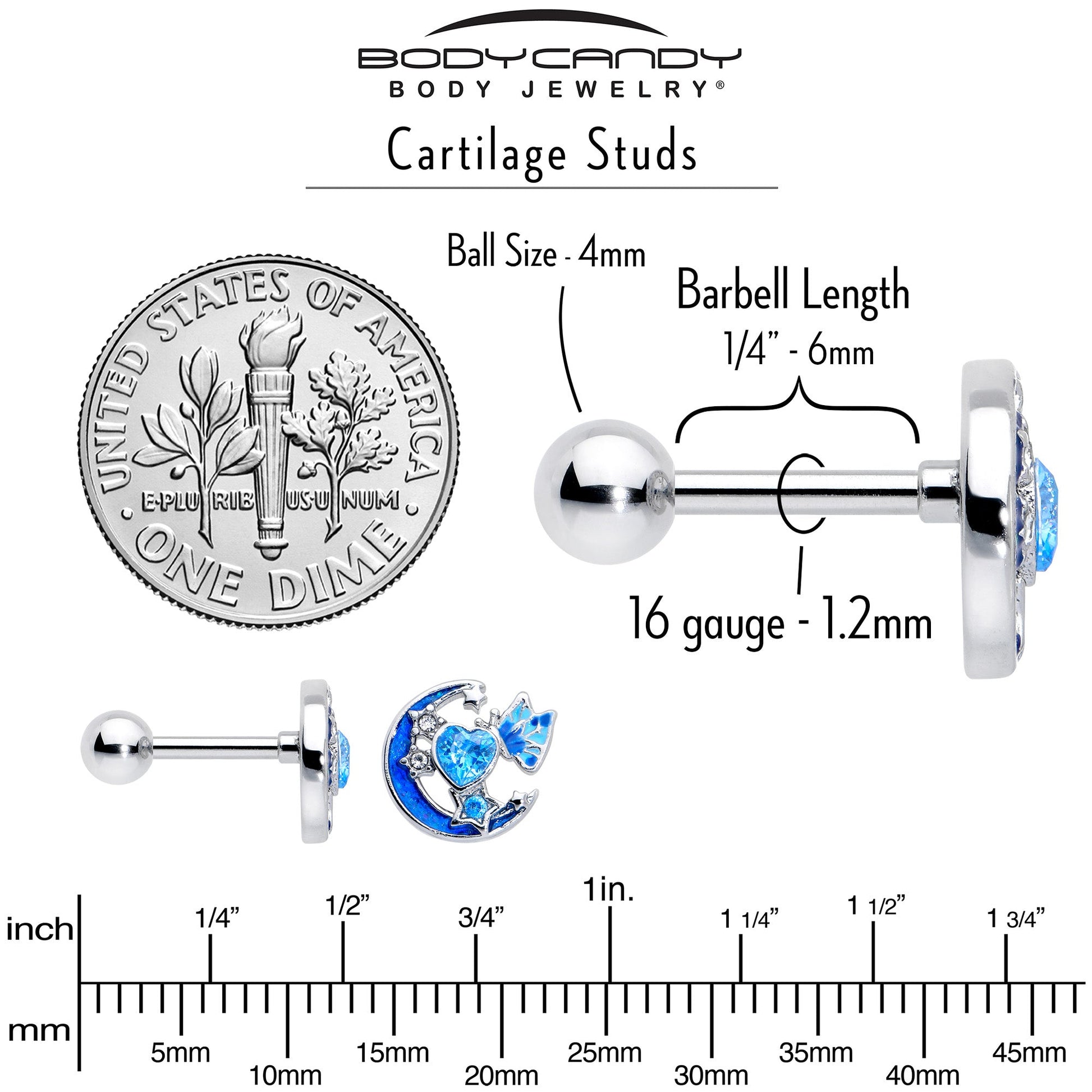Let love give you butterfly wings with this 16 gauge tragus stud. It is made with a 6mm durable 316L surgical grade stainless steel straight barbell with a 4mm ball end. It features a blue inlaid crescent moon charm with a blue cubic zirconia gem heart at the center. It is flanked on either side with a butterfly in matching blue, as well as stars set with blue and clear cubic zirconia gems at the centers and you can rock it in multiple piercings including tragus, helix, and some conch piercings. You will feel ready to fly away with this moon and butterfly themed cartilage piercing jewelry.Specifications