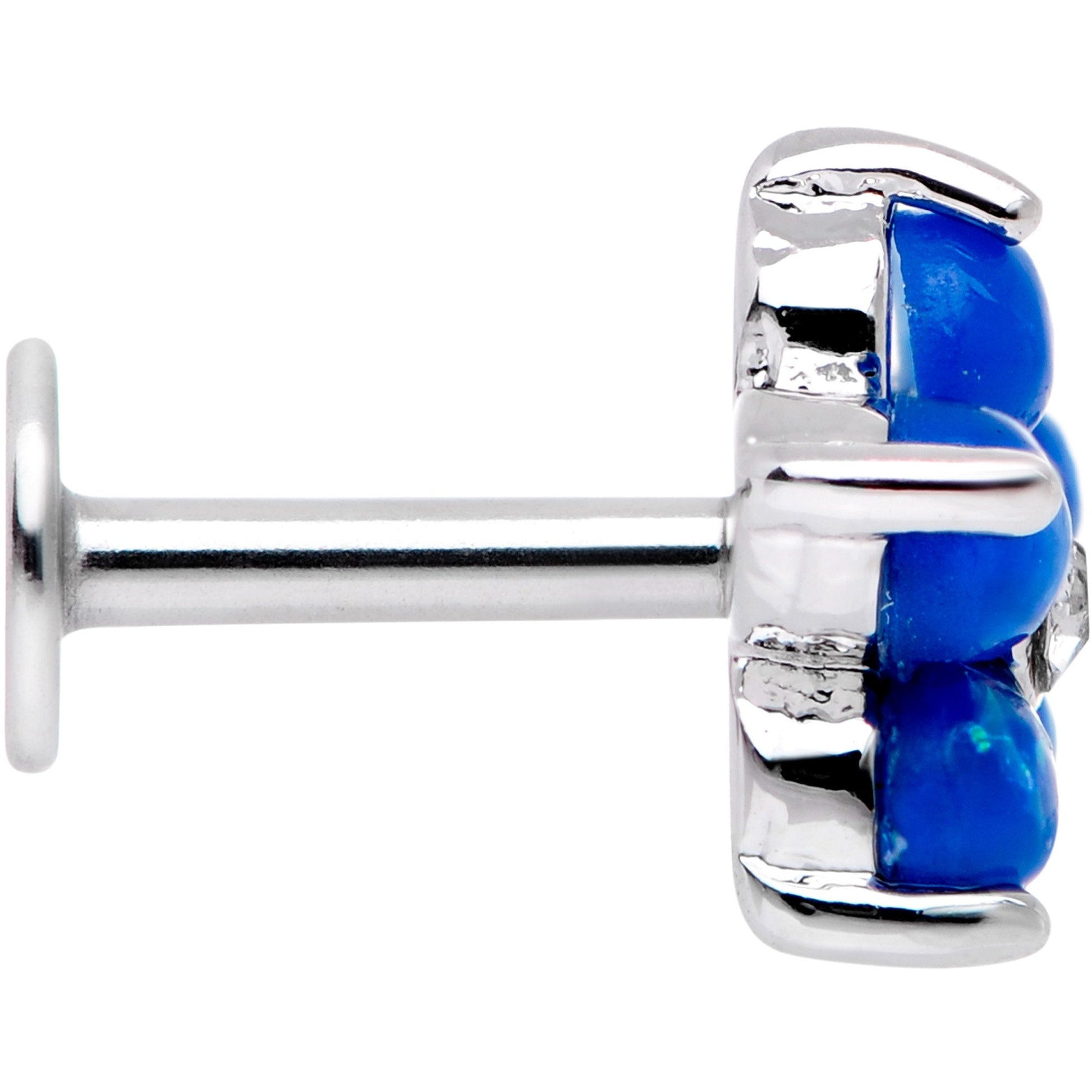 If you're into floral style this pretty 16 gauge cartilage jewelry is right up your alley. Made with a 6mm durable 316L surgical grade stainless steel straight post, this tragus piercing features a flower charm formed from blue faux opals and a clear cubic zirconia center gem. This tragus cartilage jewelry features a flat back post for your comfort.Specifications
