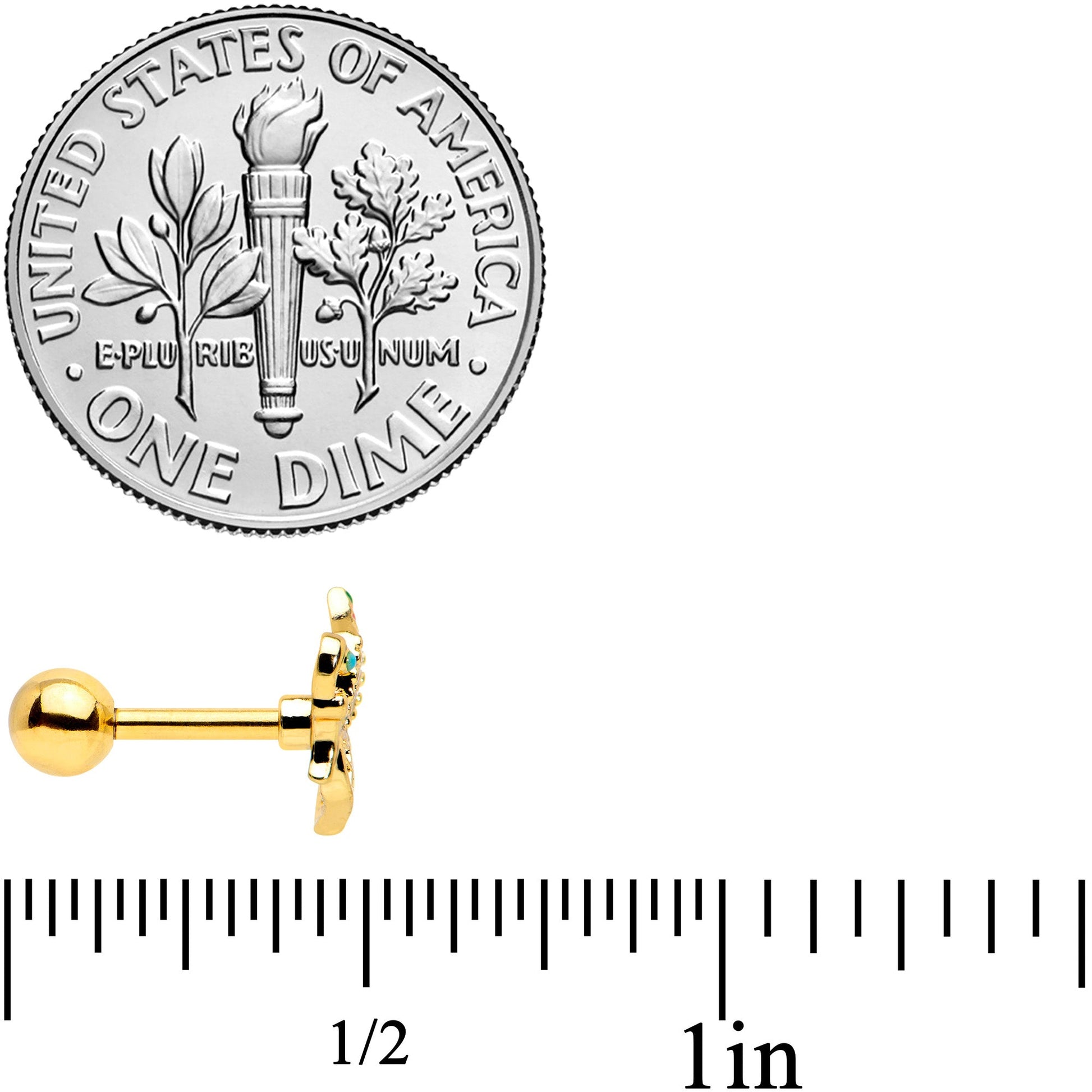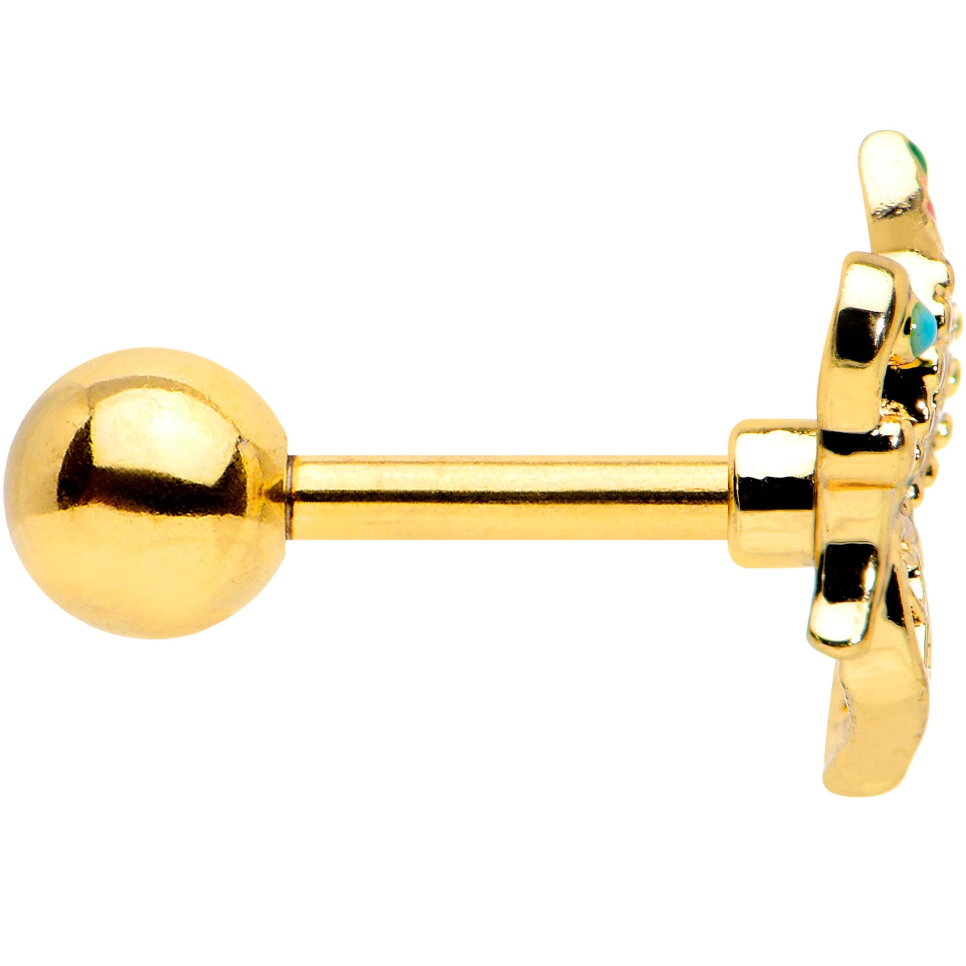 Fall in love with your piercings when you're rocking this 16 gauge tragus jewelry! It's made with a 6mm gold tone PVD over 316L surgical grade stainless steel straight barbell with a 4mm ball end. It features a butterfly charm. The butterfly features hearts within its openwork wings, embellished with clear cubic zirconia gems and color inlays in red, green, blue, and more! You can even rock this butterfly in multiple piercings including tragus, helix, and some conch piercings. This cartilage stud is sure to steal your heart!Specifications