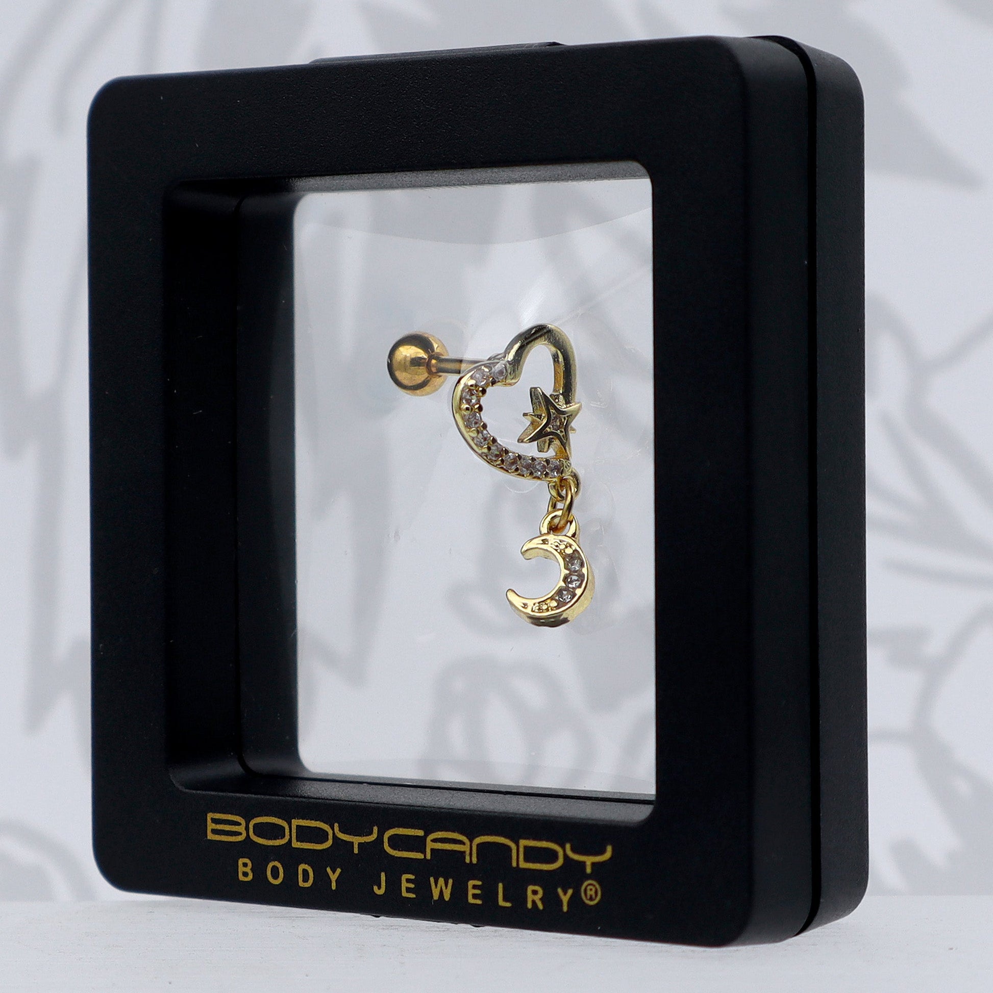 Love your piercings with all your heart with this elegant 16 gauge tragus stud. It is made with a 6mm gold tone plated over 316L surgical grade stainless steel straight barbell with a 4mm ball end. The front end features a heart charm paved on one side with clear cubic zirconia gems. It is further embellished with a tiny star, also set with a clear cubic zirconia gem. Dangling beneath the heart is a crescent moon, also set with clear cubic zirconia gems for a cohesive appearance. And you can rock it in multiple piercings including tragus, helix, and some conch piercings. Send your heart into orbit with this lovely lunar cartilage piercing ring.Specifications