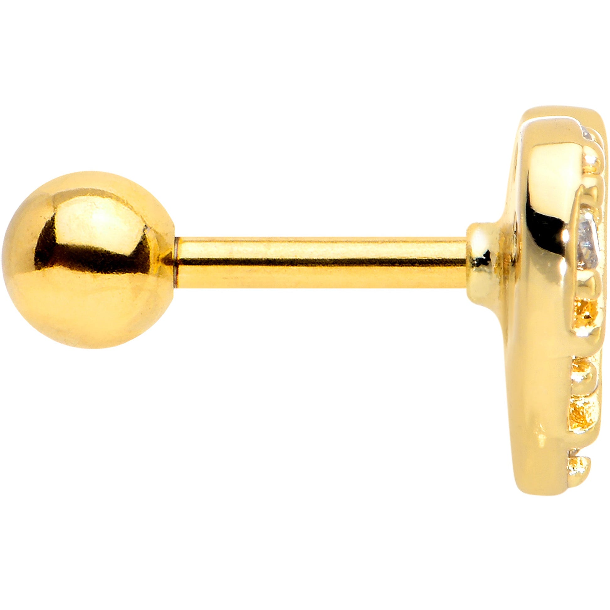 Get a luxe look of love with lattice this Valentine's Day with this 16 gauge tragus stud. It's made with a 6mm gold tone plated over 316L surgical grade stainless steel straight barbell with a 4mm ball end. It features a heart charm, with latticework detailing. Set in between each of the lines are clear gems for an added touch of style that really takes this look over the top. You can even rock it in multiple piercings including tragus, helix, and some conch piercings. Fall in love with style when you're rocking this heart themed cartilage piercing jewelry.Specifications