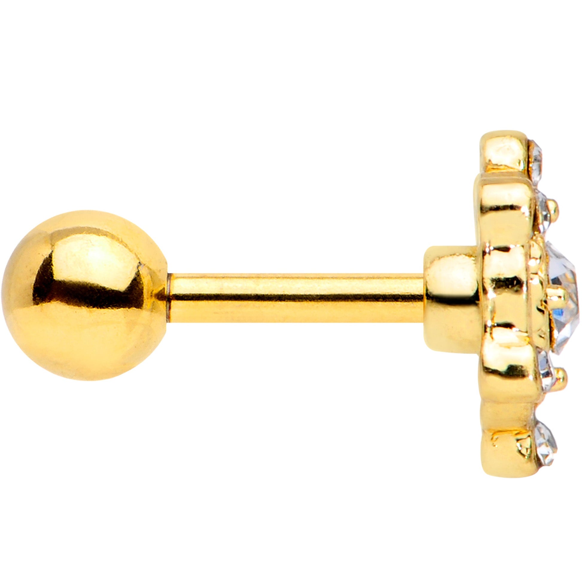 This 16 gauge tragus stud reminds to keep an open heart....and looks gorgeous while doing it! It's made with a 6mm gold tone anodized over 316L surgical grade stainless steel straight barbell with a 4mm ball end. The front features a heart shape, with small clear gems set all around the outside. The cartilage stud is further embellished with a larger clear gem set right at the center of the heart. And you can wear it in multiple piercings, including tragus, helix, and some conch piercings. This is one cartilage earring that's sure to steal your heart!Specifications