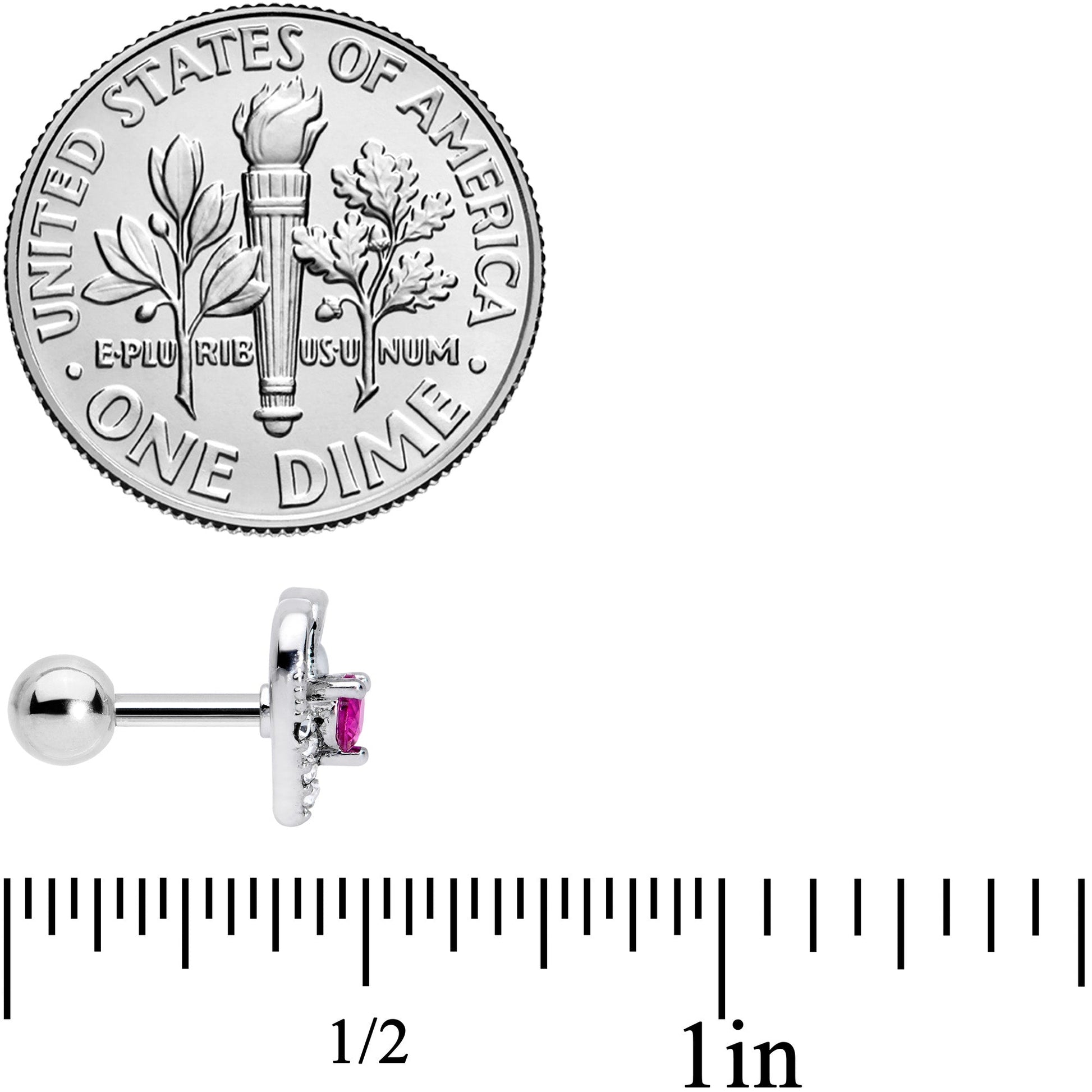 Valentine's Day can be every day if you keep it in your heart....like the heart on this 16 gauge tragus stud! It's made with a 6mm durable 316L surgical grade stainless steel straight barbell with a 4mm ball end and features a heart charm with one side composed of swirling openwork loops. The other side of the heart is set with clear gems for a balanced appearance. At the center of the heart is a round, hot pink gem that immediately catches the eye and adds a gorgeous splash of color to the piece. And you can splash that color in multiple piercings including helix, tragus, and some conch piercings. Whether you're celebrating Valentine's Day, in love with love, or have a big heart to share, this handsome heart-themed cartilage jewelry is perfect for any occasion!Specifications
