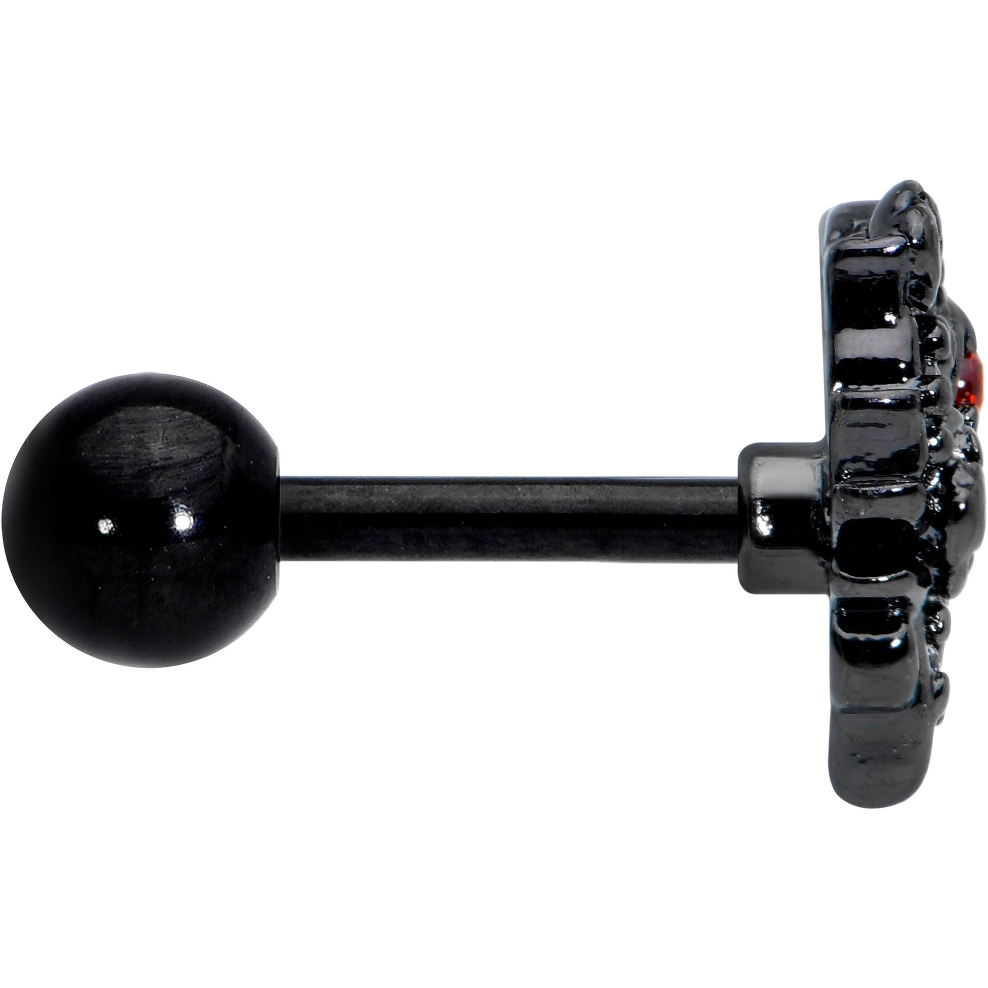 Let the love blossom when you are rocking this 16 gauge tragus stud. It is made with a 6mm black PVD over 316L surgical grade stainless steel straight barbell with a 4mm ball end. It features a heart charm, embellished with clear cubic zirconia gems. It also features a pair of flowers with red cubic zirconia gem centers and twining vines. You can even rock it in multiple piercings including tragus, helix, and some conch piercings. Give your piercings some new goth glamour with this floral heart cartilage piercing jewelry.Specifications