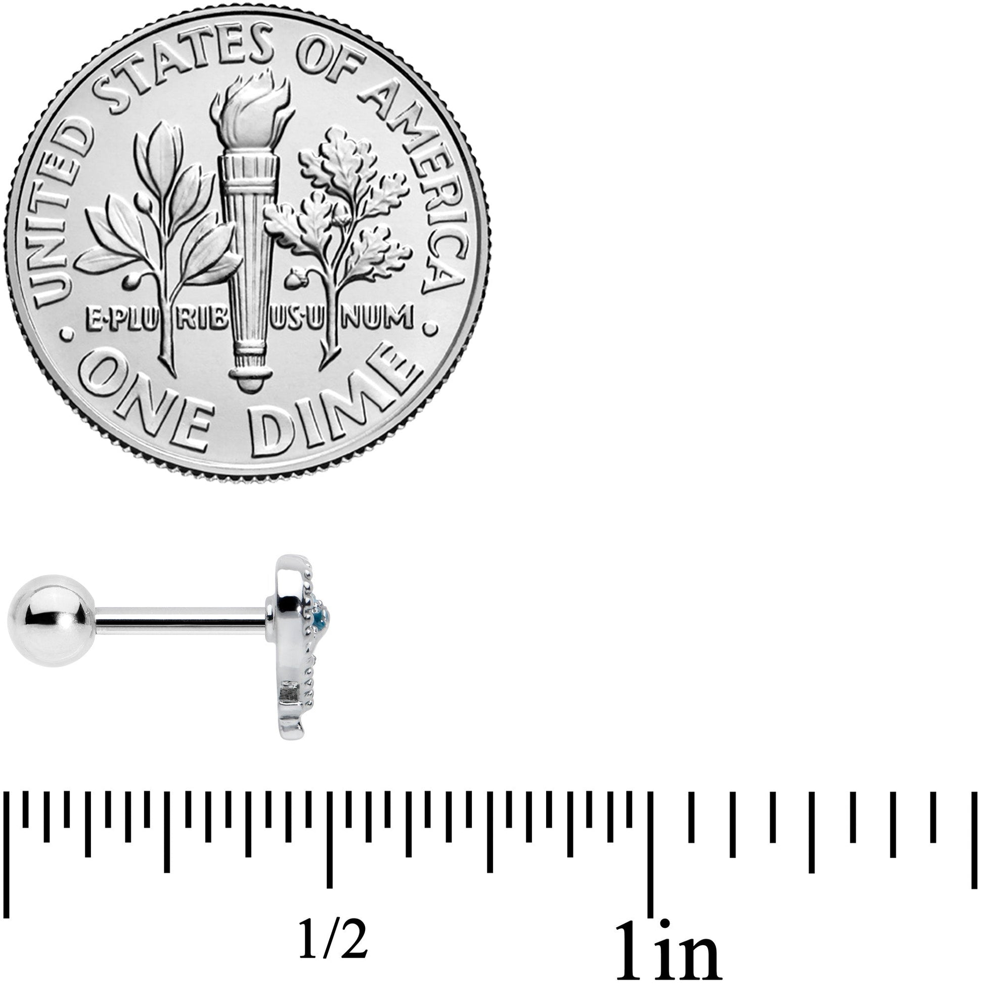 If your heart is devoted to dolphins, show it off with this 16 gauge tragus stud! It's made with a 6mm durable 316L surgical grade stainless steel straight barbell with a 4mm ball end. It features a heart charm, set with textured embellishment. Within the heart is a dolphin, with blue embellishments set into its body and a black eye embellishment. The dolphin appears to be twining with the heart so that their tail forms a portion of the heart itself and you can even rock it in multiple piercings including tragus, helix, and some conch piercings. Fall in love with the creatures of the sea when you're rocking this awesome, aquatic cartilage piercing ring!Specifications