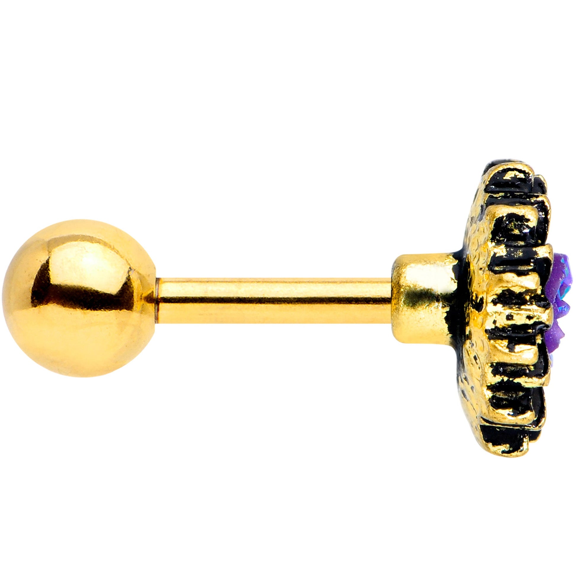 The flowers on this 16 gauge tragus stud is so full of style that it's practically ready to burst! It's made with a 6mm gold tone PVD over 316L surgical grade stainless steel straight barbell with a 4mm ball end. The tragus jewelry features a sunburst flower charm with a blue center that gives this cartilage jewelry a gorgeous shot of color. This flower cartilage stud can bloom in multiple piercings including your tragus, helix, and some conch piercings. This flower is sure to put a sunny look in your cartilage piercings!Specifications