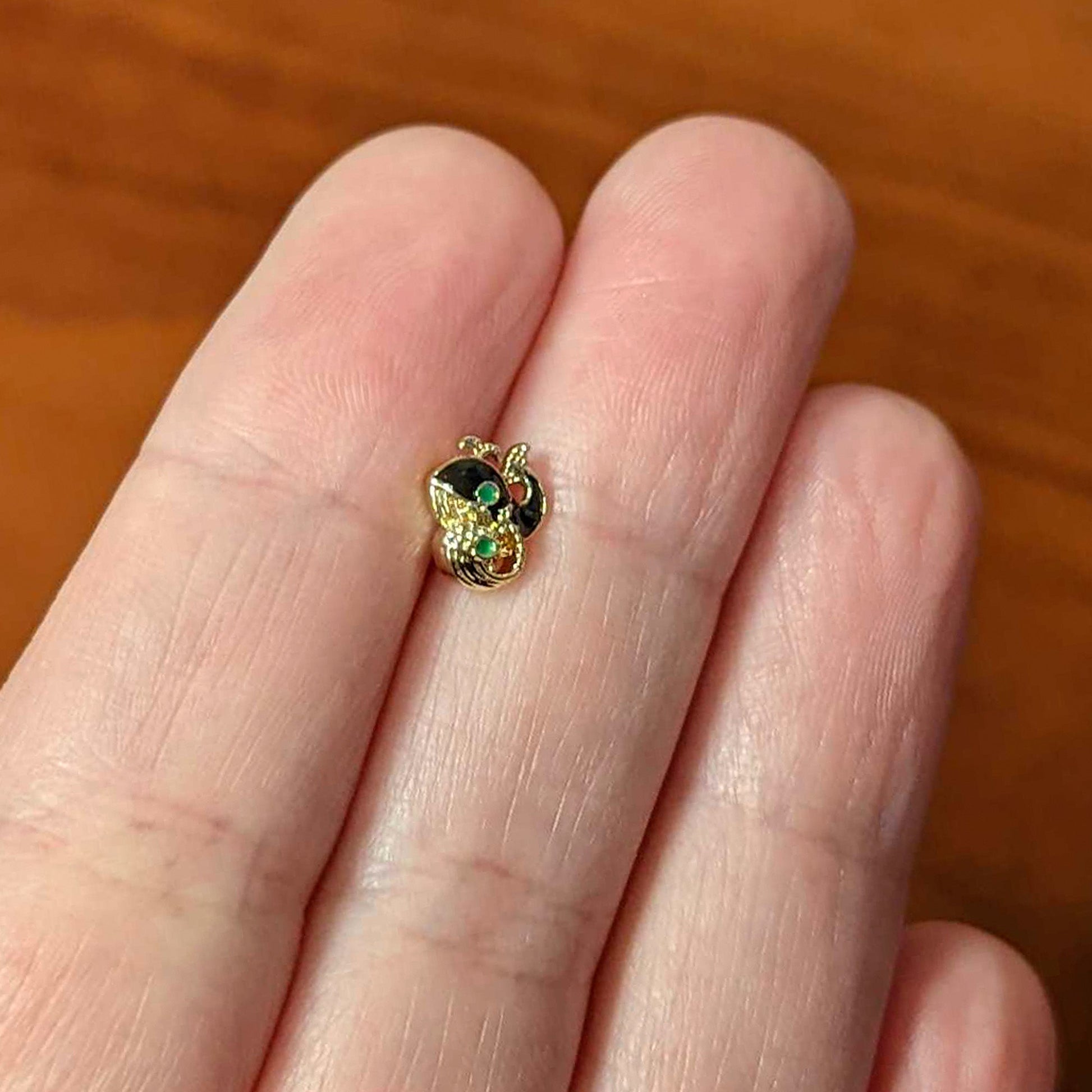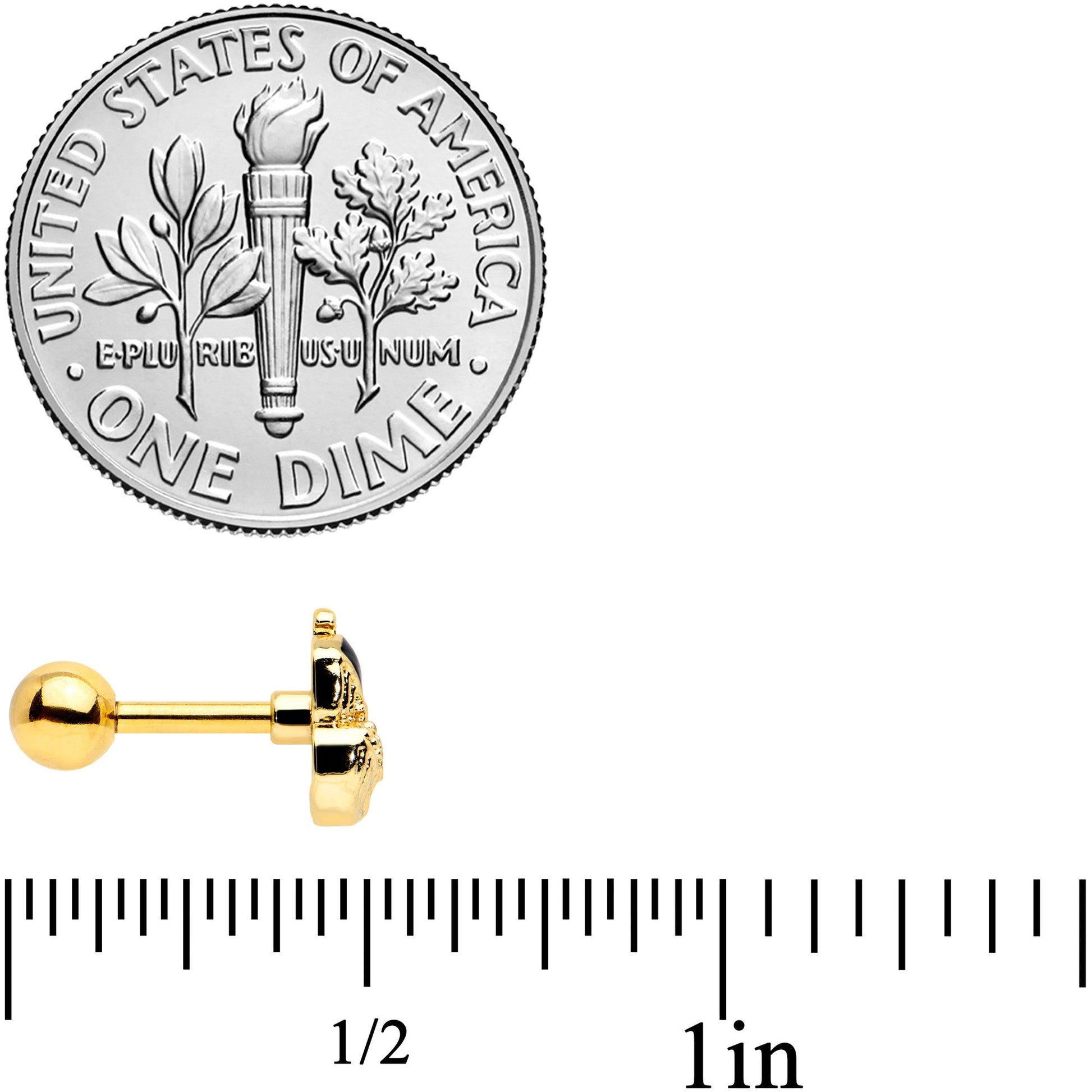The whales on this 16 gauge tragus stud show that style runs in the family! It's made with a 6mm gold tone PVD over 316L surgical grade stainless steel straight barbell with a 4mm ball end. It features a whale charm, with a mother whale and baby. The mother has black embellishment and a green eye while the baby is set with textured detailing and also has a green eye embellishment. You can even rock them in multiple piercings including tragus, helix, and some conch piercings. Show your love for these gorgeous creatures family-style with this wonderful whale-themed cartilage stud!Specifications