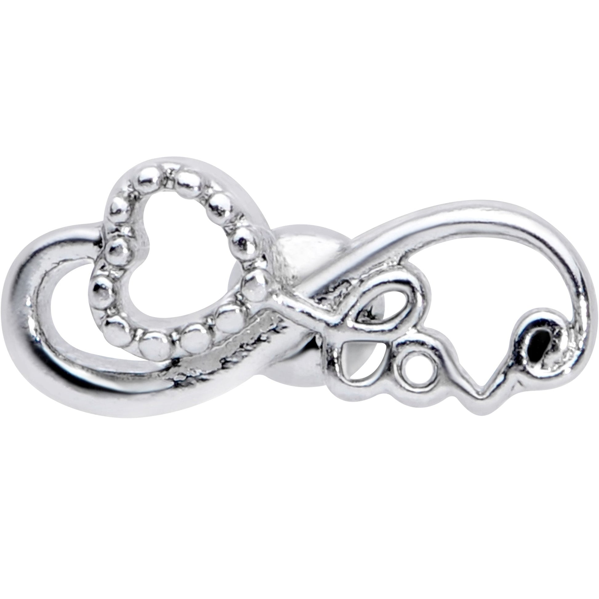If you have an infinite amount of love in your heart, this 16 gauge cartilage stud is meant for you! It's made with a 6mm durable 316L surgical grade stainless steel straight barbell with a 4mm ball end. It features a charm of a swooping symbol for "infinity", embellished at one end with textured heart embellishment. And you can rock this cartilage ring in multiple piercings including tragus, helix, and some conch piercings! Celebrate your heart's infinite love with this simple and striking tragus stud!Specifications