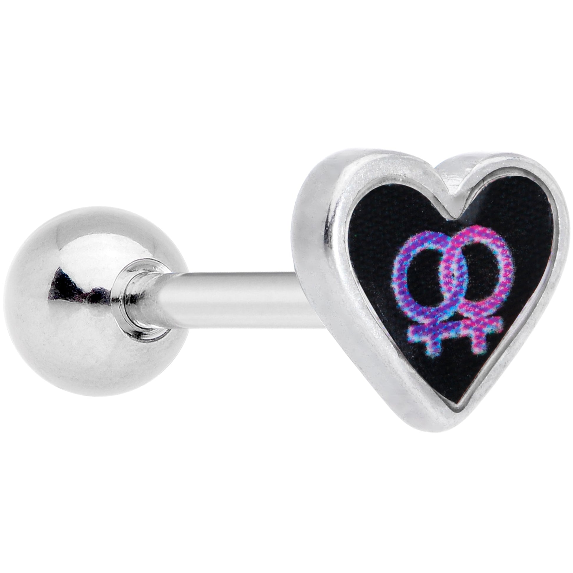 Show off your pride without saying a word when you wear this 16 gauge cartilage jewelry that supports rights for everyone! It's made with a 6mm durable 316L surgical grade stainless steel straight barbell with a 4mm ball end. The front is a black heart-shaped charm with entwined female signs in pink and purple that speak volumes. And you can wear your love in multiple piercings including tragus, helix, and some conch piercings. With this in your cartilage piercing, you can support love and pride however you see fit and look super stylish while doing it!Specifications