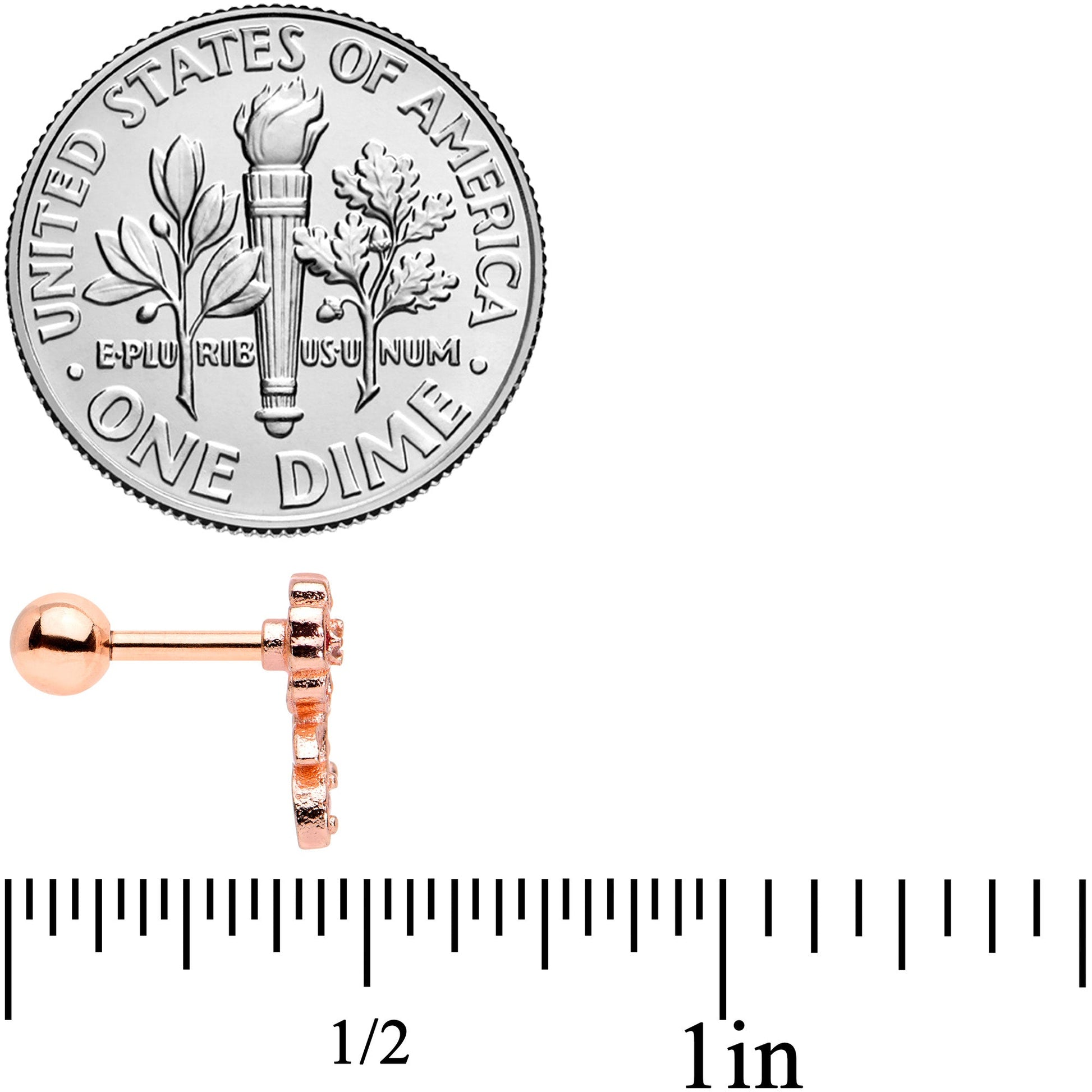 Dress up your cartilage piercing with flowers, with this 16 gauge tragus stud! It's made with a 6mm rose gold tone PVD over 316L surgical grade stainless steel straight barbell with a 4mm ball end. It features a flower charm with pink gem heart petals and a clear gem in the center. It also features a stem, with leaves set with clear gems and matching embellishment. This cartilage earring can be worn in multiple piercings such as helix, tragus, and some conch piercings. This pretty spring flower is one you'll never want to let leaf your cartilage piercing!Specifications