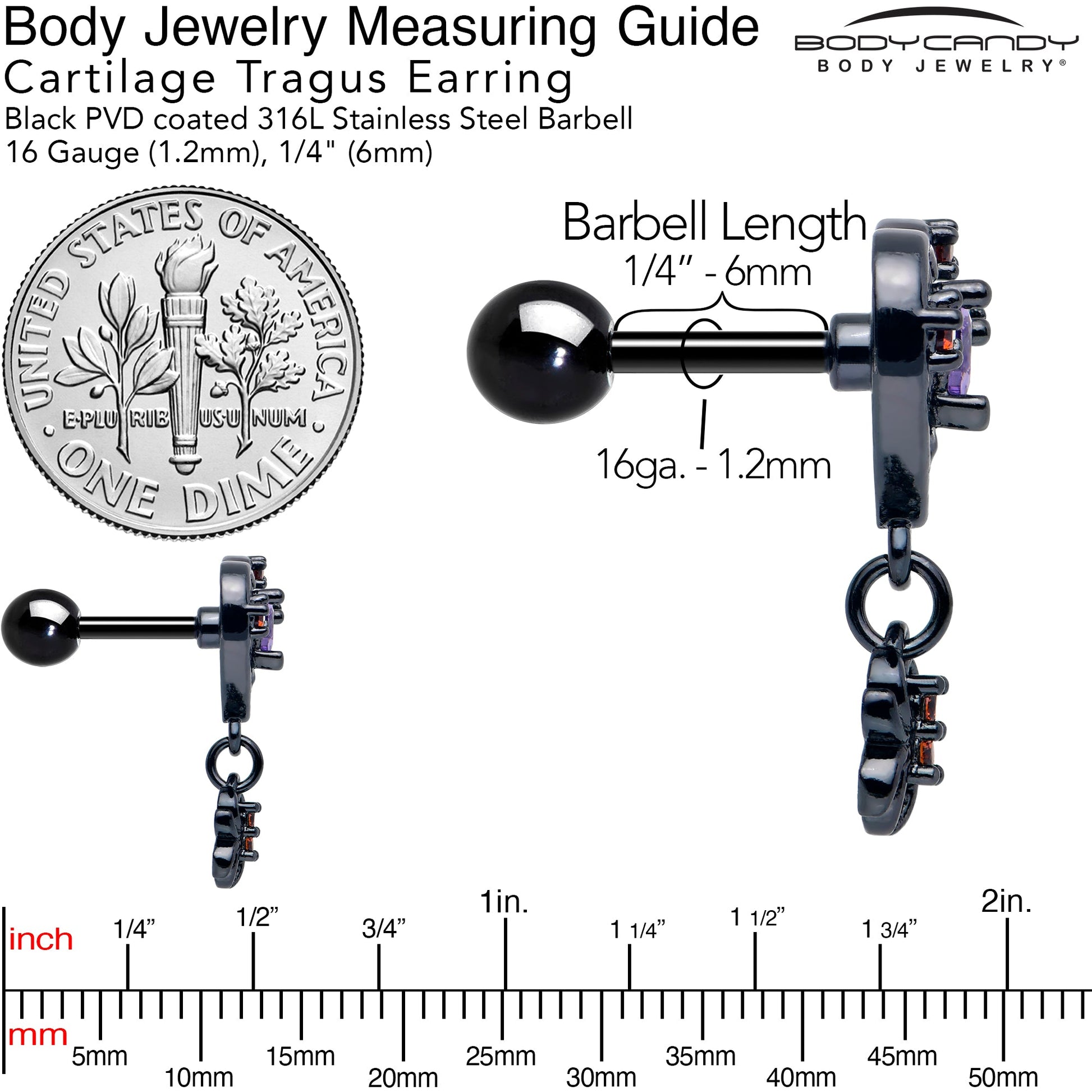 Fall in love with gothic style when you're rocking this 16 gauge tragus stud. It's made with a 6mm black PVD over 316L surgical grade stainless steel straight barbell, with a 4mm ball end. It features a black charm, richly set with red and purple cubic zirconia gems and black skull embellishments. Dangling from the heart is a spider charm, set with a red cubic zirconia gem, and you can rock it in multiple piercings including tragus, helix, and some conch piercings. Get your goth on in style with this darkly delicious cartilage piercing jewelry.Specifications