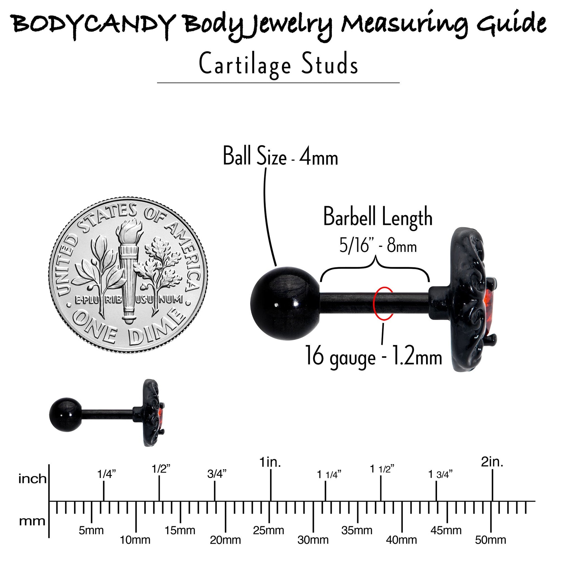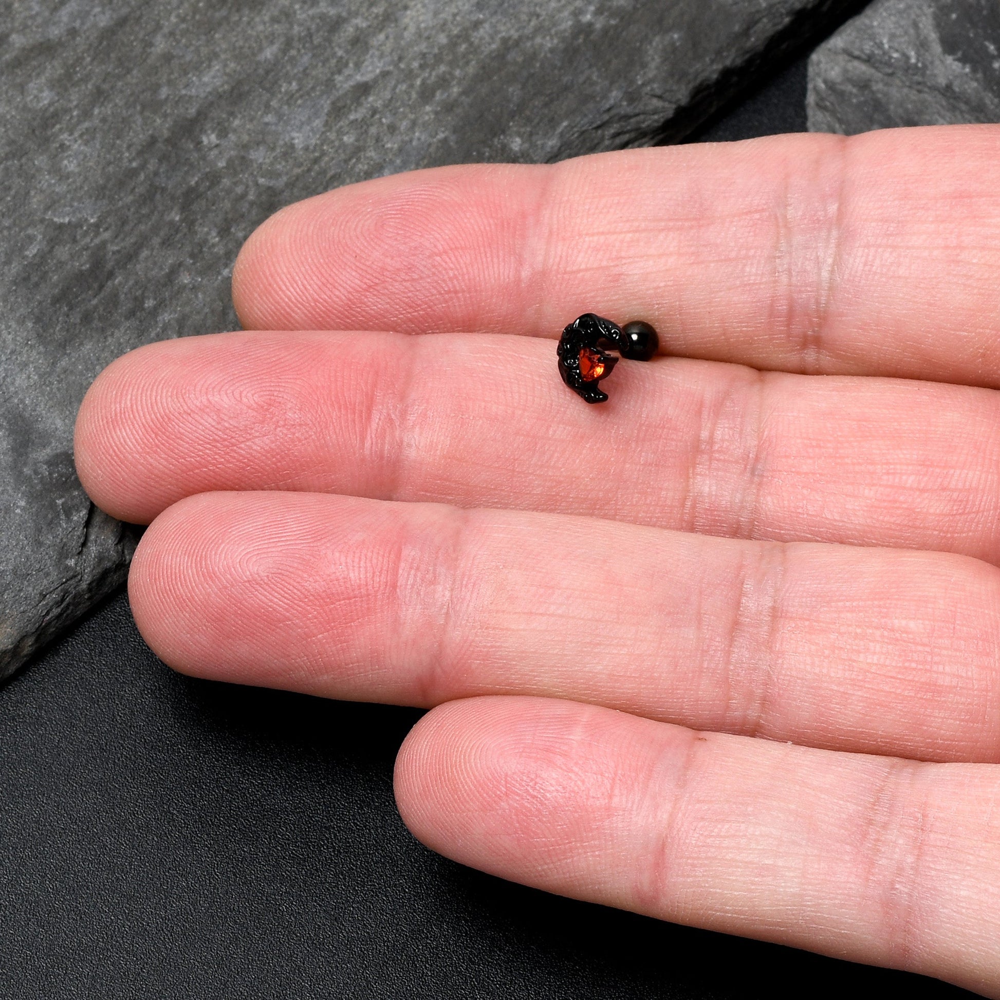 Fall in love with the lunar look of this with this 16 gauge cartilage jewelry. It is made with a 6mm black PVD over 316L surgical grade stainless steel straight barbell with a 4mm ball end. It features a crescent moon charm, covered in raised scrollwork embellishment. At the center of the moon is a heart, composed of a red cubic zirconia gem. You can even rock this moon in multiple piercings including tragus, helix, and some conch piercings. You will rule the evening sky with this elegant celestial cartilage piercing ring.Specifications