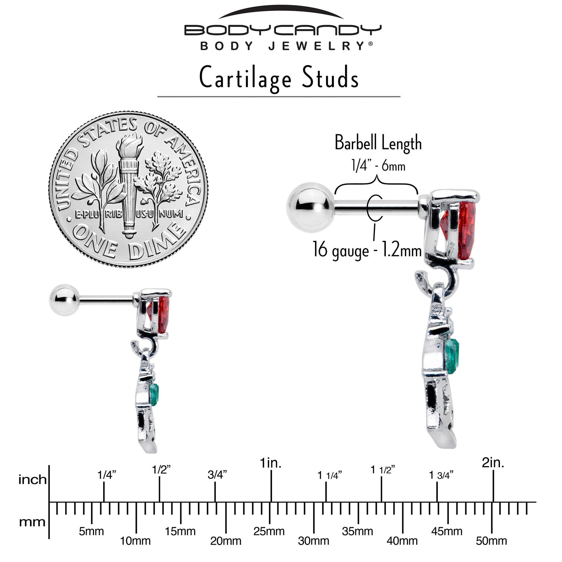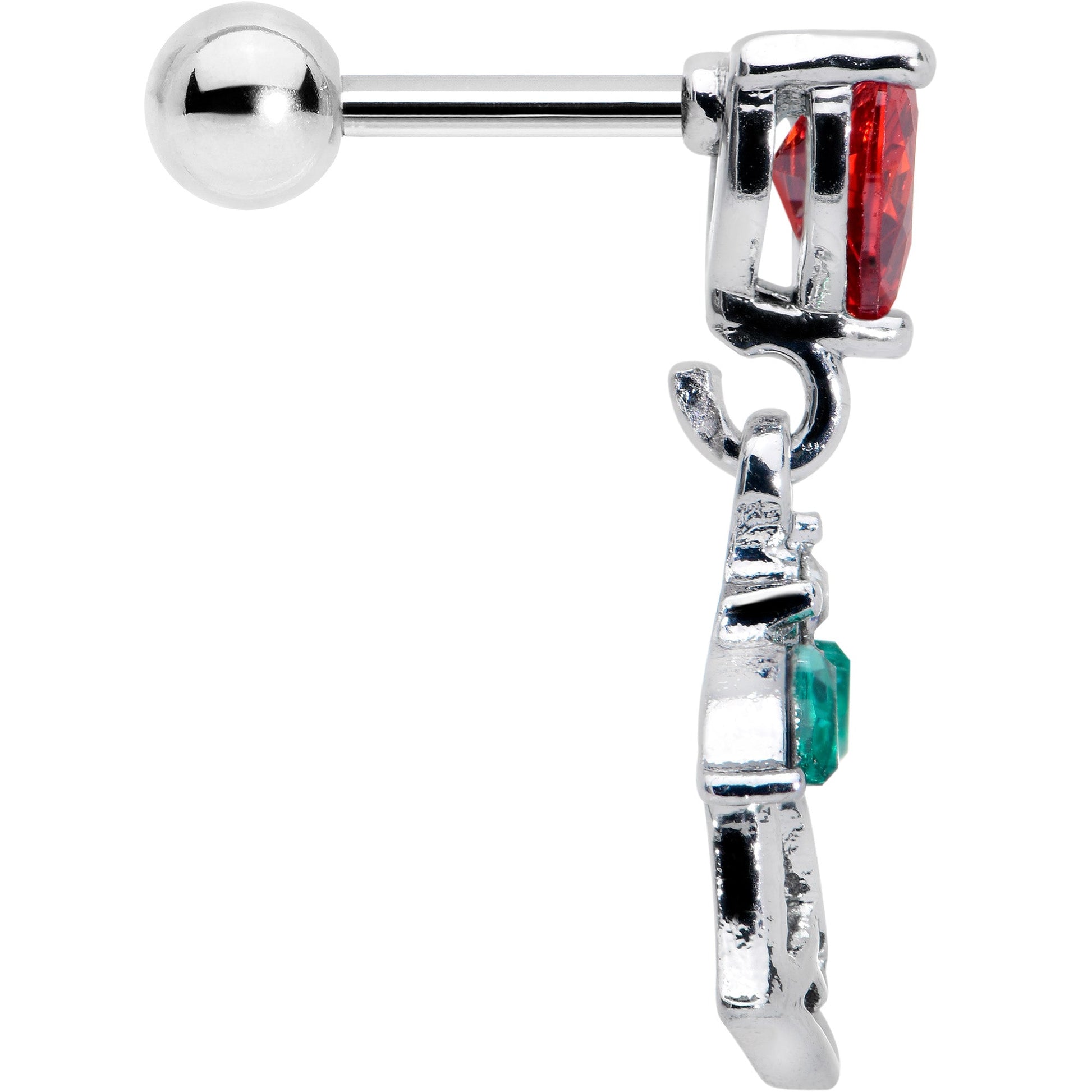 What could be more romantic than this 16 gauge tragus stud? It is made with a 6mm durable 316L surgical grade stainless straight barbell with a 4mm ball end. The front end features a red cubic zirconia gem in the shape of a heart. Dangling beneath the heart is a rose charm, with the leaves composed of green cubic zirconia gems and an airy, openwork design. You can even rock it in multiple piercings including tragus, helix, and some conch piercings. Fall in love with this richly romantic cartilage piercing ring.Specifications